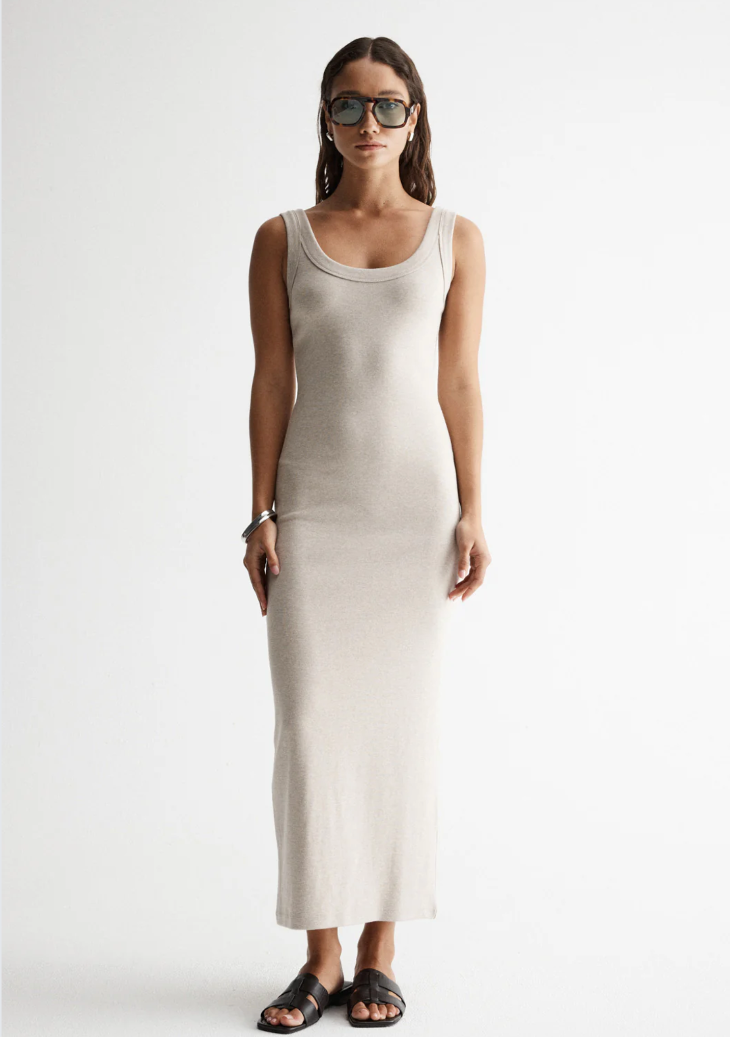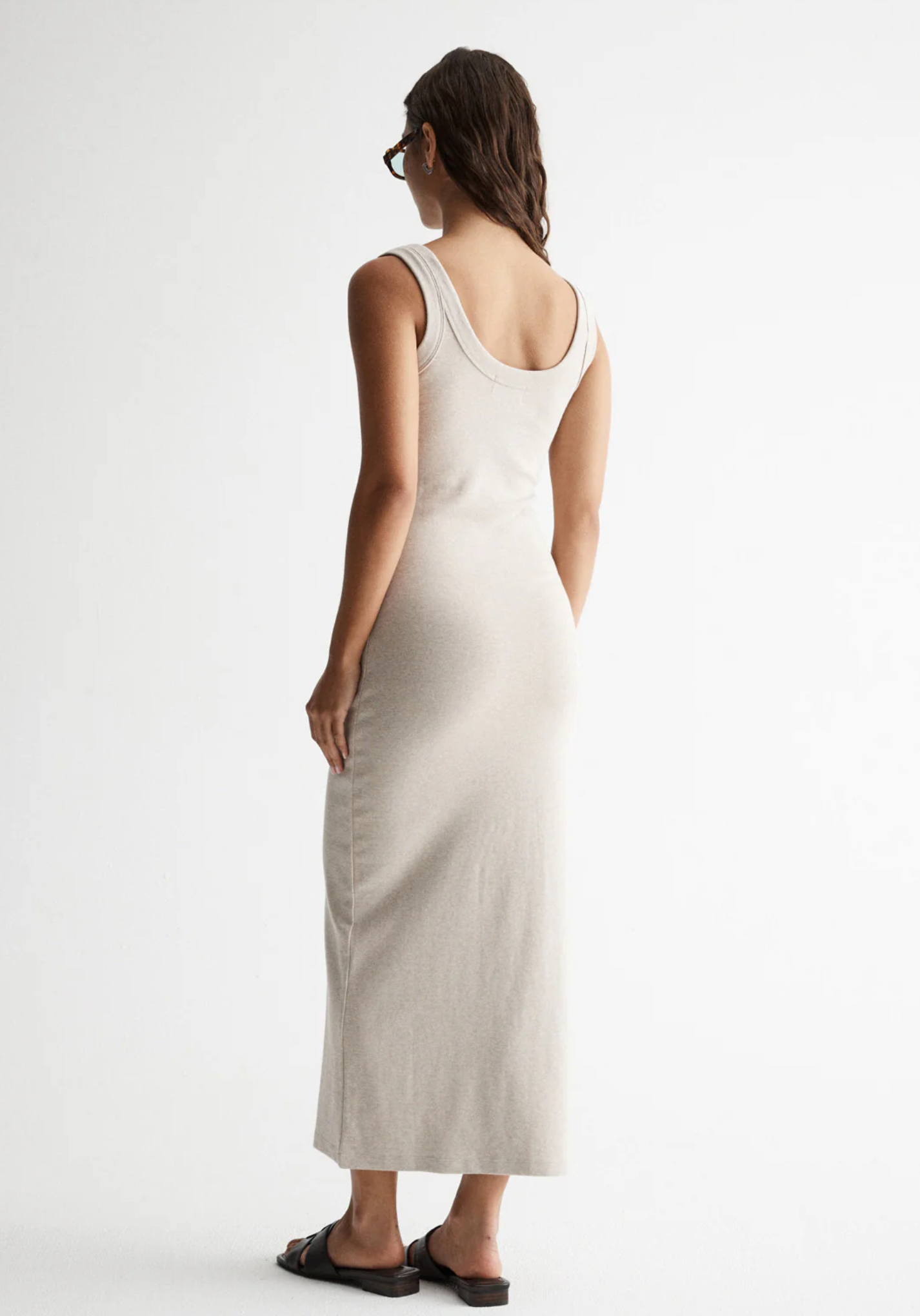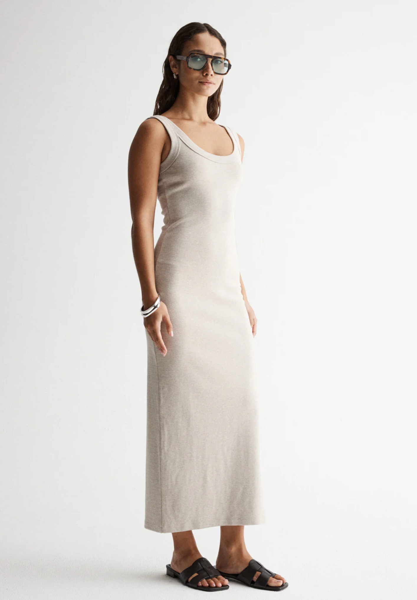 Adding to our collection of refined basics, the Sienna Tank Dress is a timeless summer staple. Made of our signature organic cotton blend, this dress has a supple and soft handfeel with a super fine rib texture and stretch throughout. Sleeveless with a scoop neckline, the Sienna Tank Dress is cut to a maxi length with fitted silhouette.