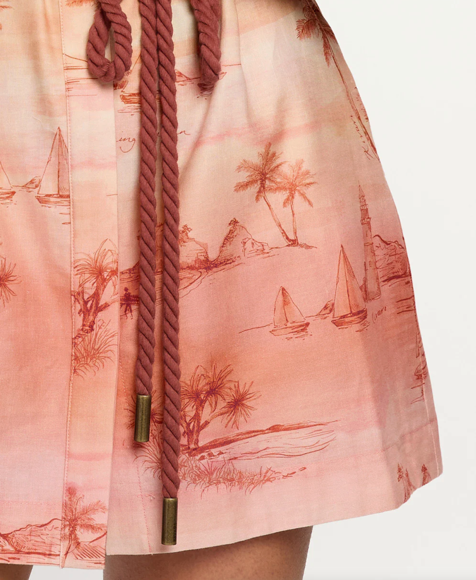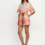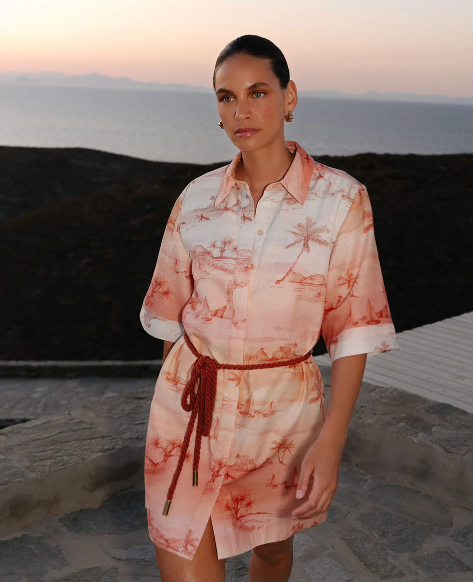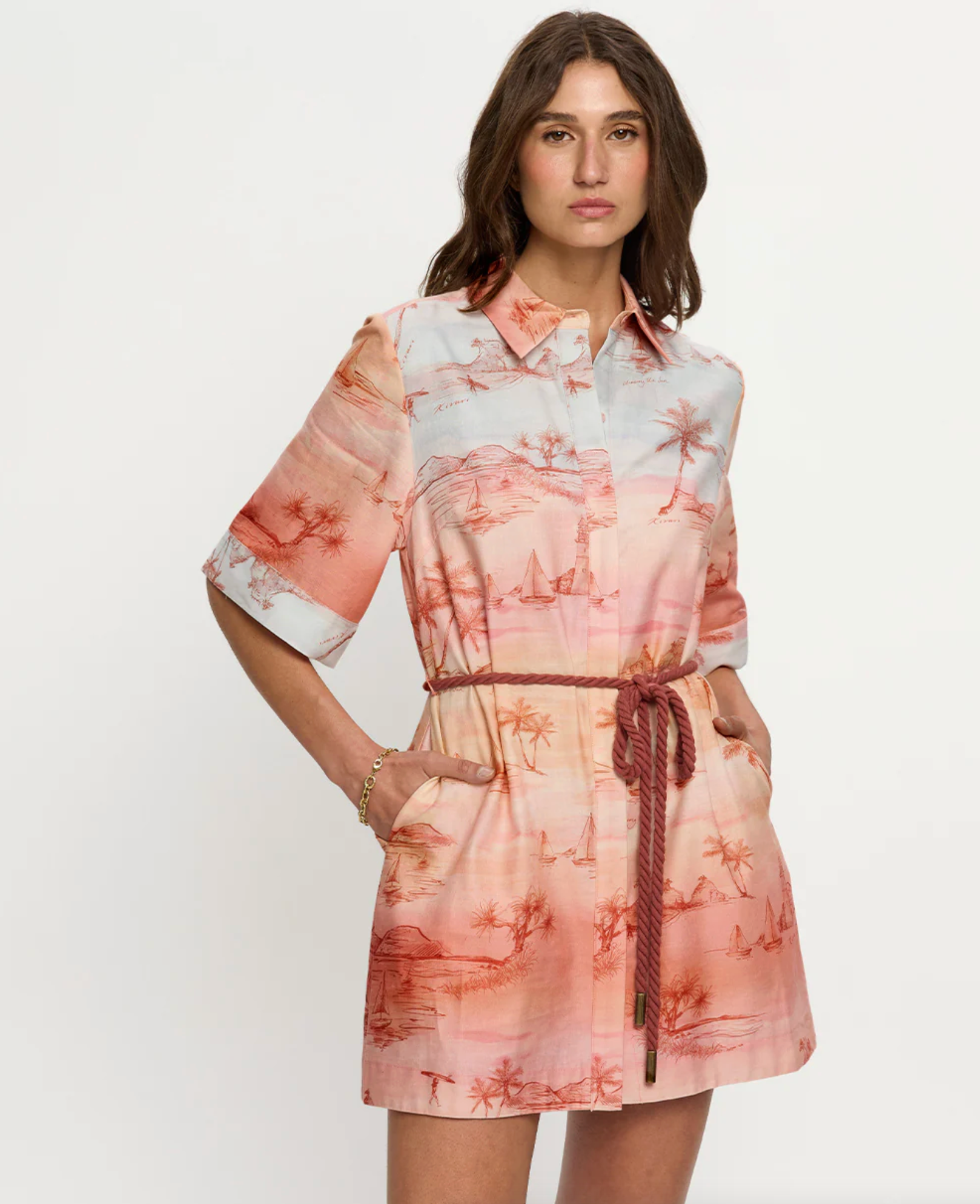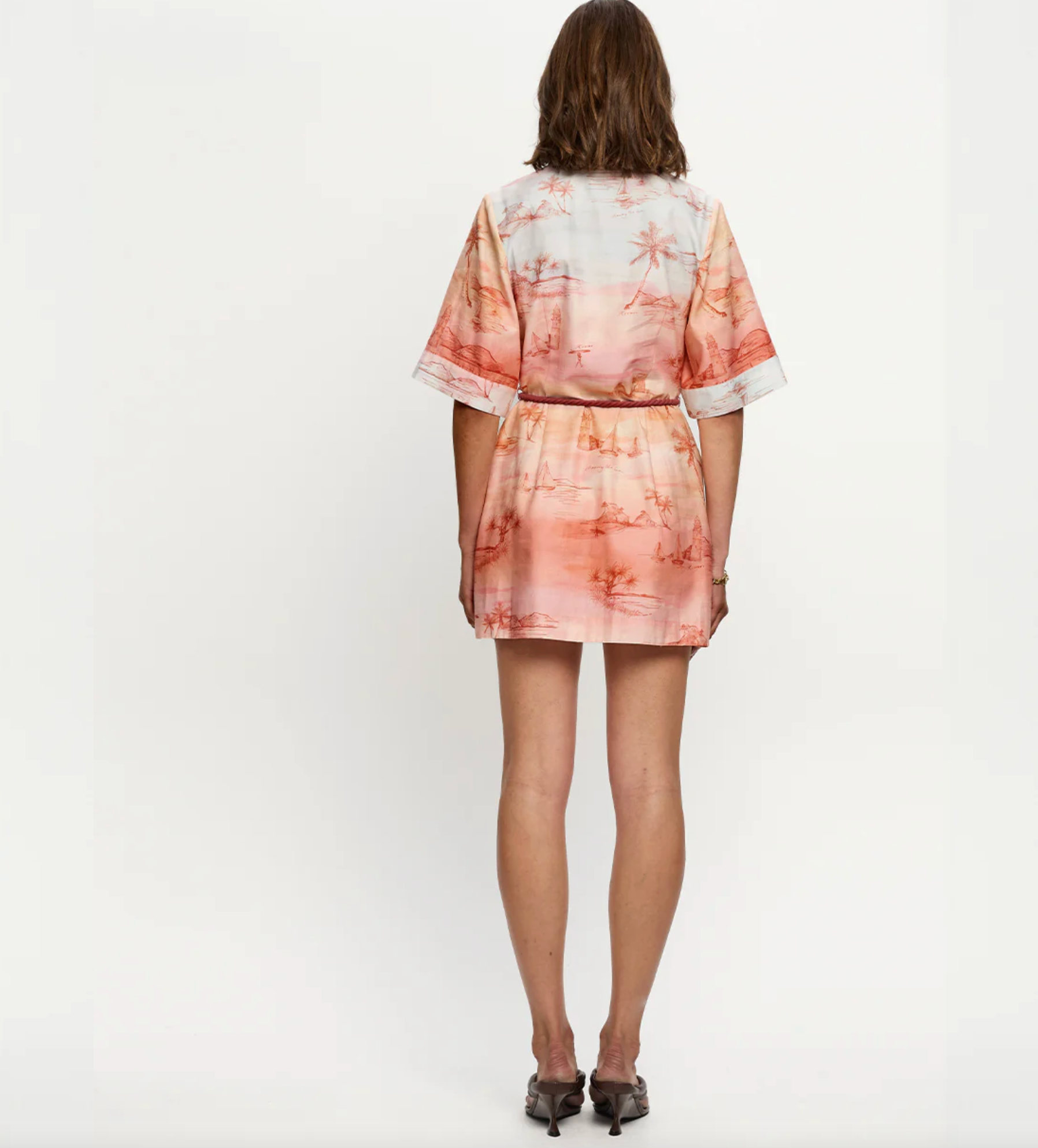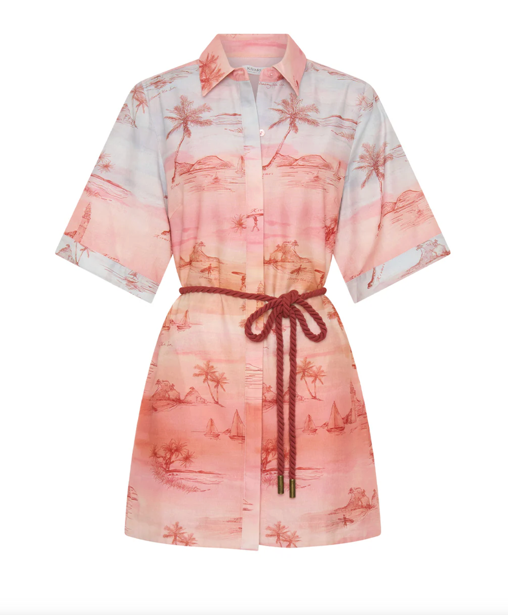 Sunset is a soft ombré wash of blush and sand tones with delicate coastal scenes - palm trees, sailboats and shoreline motifs - evoking a sun-faded, vintage seaside story. The Sunset Mini Dress is a relaxed silhouette featuring kimono-style sleeves, a classic collar and a button-through front, complete with a removable waist tie for versatile styling. Style with sandals for sun-soaked weekends and long lunches.