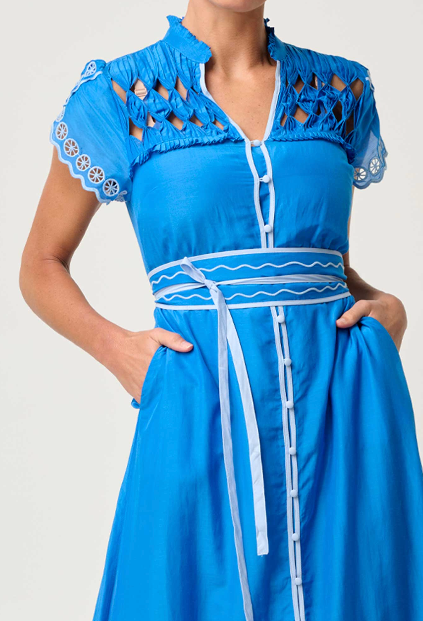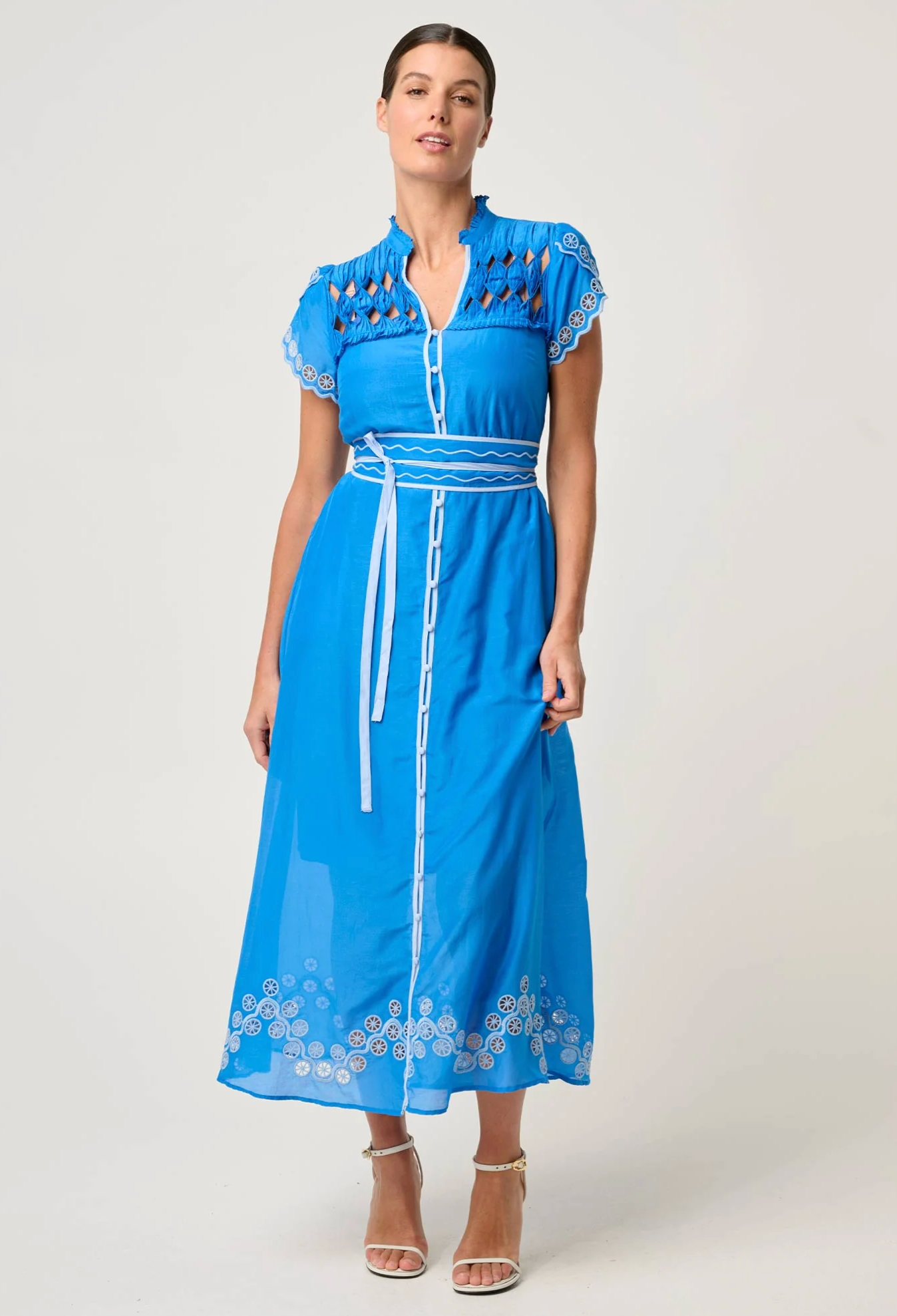The dress showcases a beautifully detailed diamond smock yoke, adding texture and handcrafted elegance, while the delicate embroidered motifs along the sleeves and hemline highlight its refined design. A button-through front offers versatile styling, and the self-tie belt cinches the waist for a flattering, feminine silhouette.