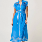 Radiating sophistication and artisanal charm, the Xanthia Diamond Smock Yoke Silk Cotton Embroidered Dress in Blue Topaz is a timeless piece crafted for modern femininity. Made from a luxurious silk cotton blend, this dress combines the airy lightness of cotton with the soft lustre of silk, making it ideal for both day and evening wear.