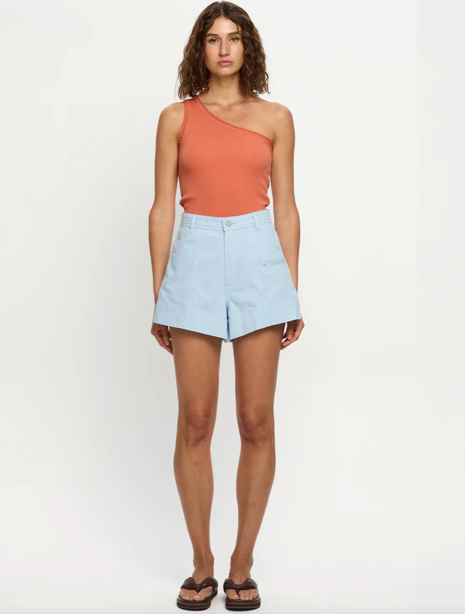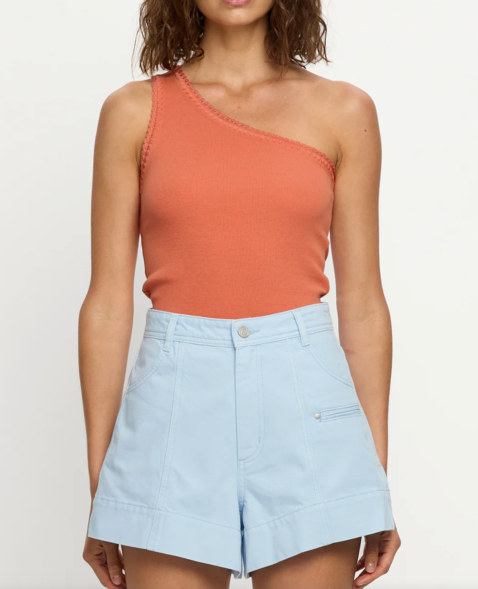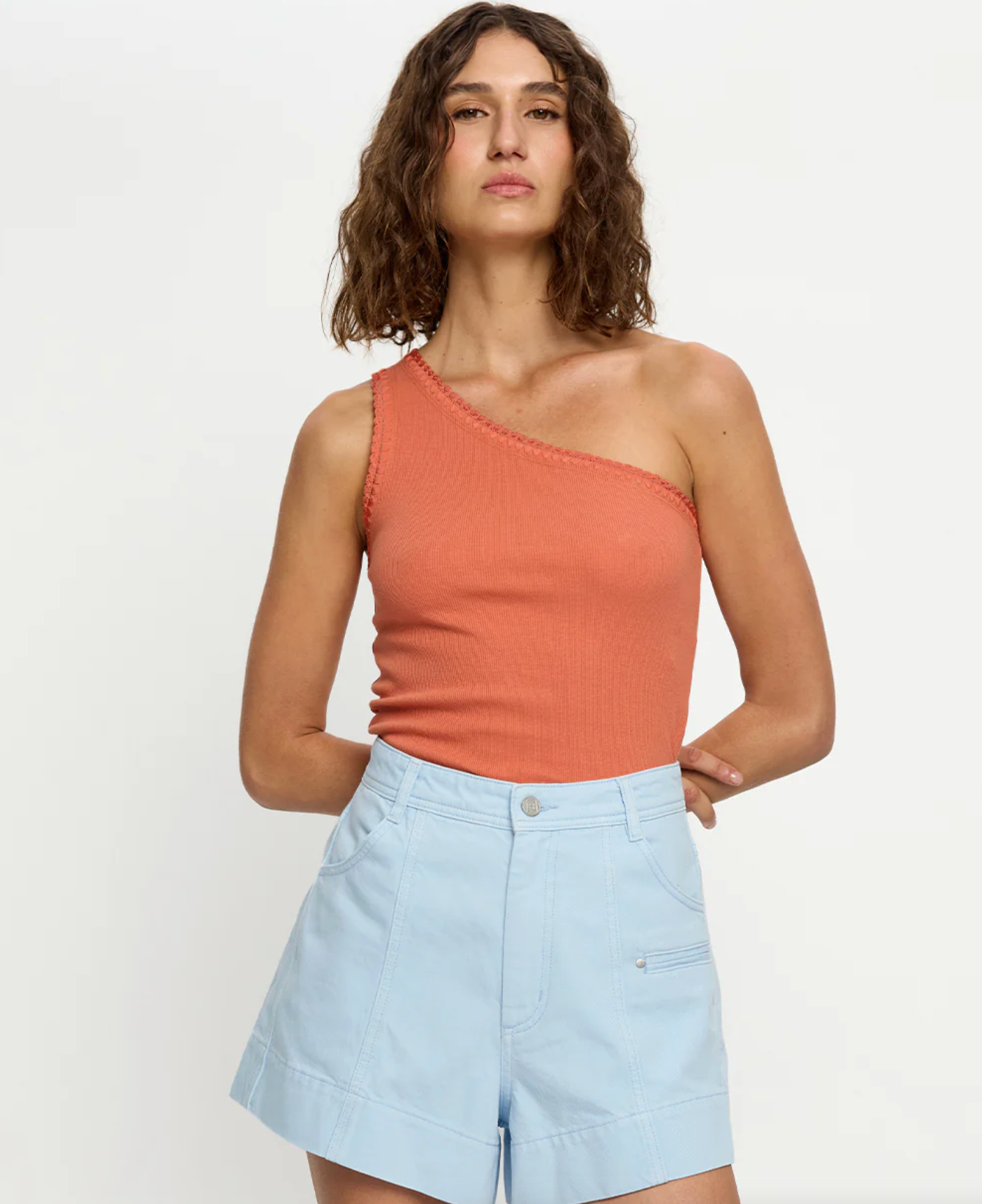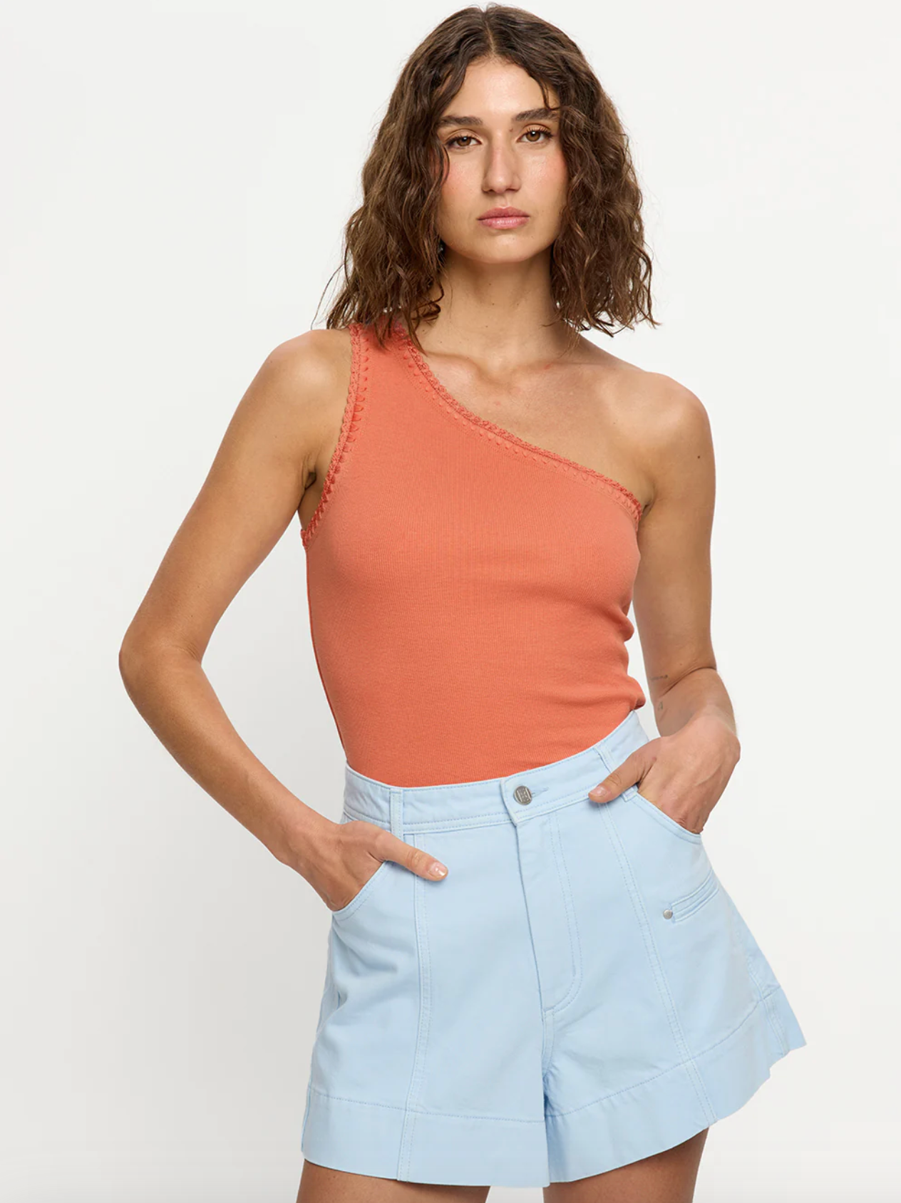 A modern essential, our signature Tallulah One Shoulder Tank in rust is cut from a premium rib knit. Defined by its asymmetric one-shoulder neckline and hand-crochet trim, this piece balances effortless wear with artisanal detail. Pair back with denim for effortless daytime dressing or elevate with the Elodie Pants and heels for a refined evening look.