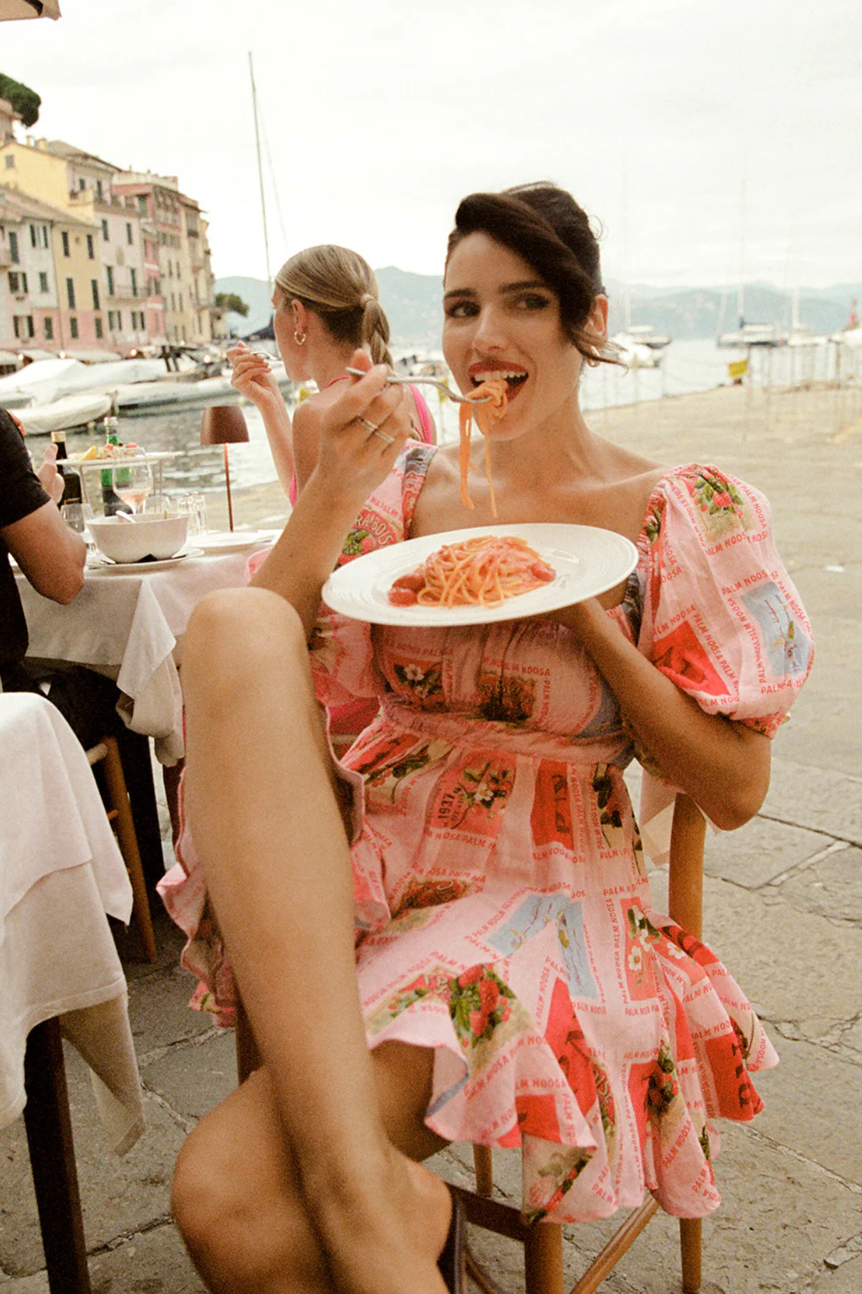 Ruby is wearing a size 8 and is 175cm tall with an 82cm bust and a 62cm waist. The Flora Dress is elasticated through the bust and waist. We recommend purchasing your regular size for a similar fit to Ruby, or sizing down for a slimmer fit or if you are inbetween sizes. Please refer to the size chart below for garment measurements.