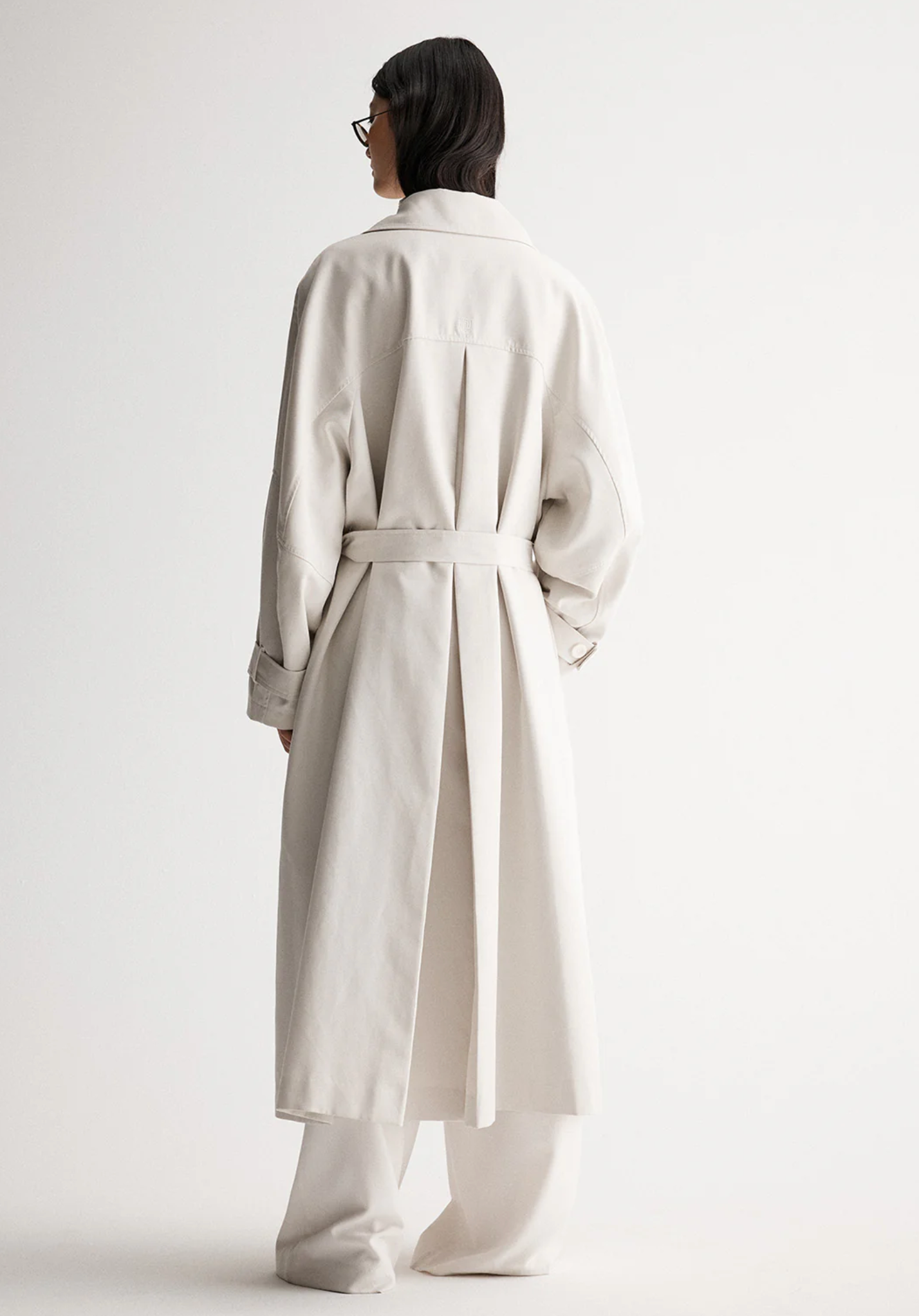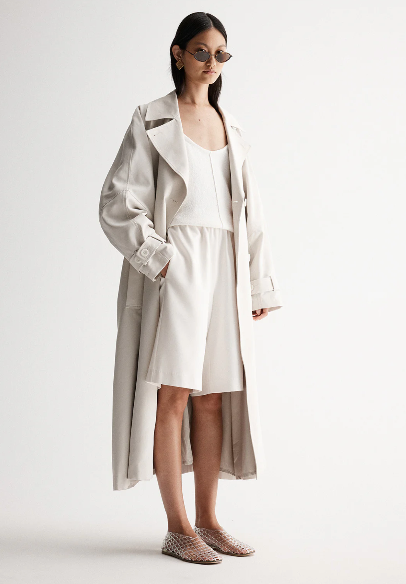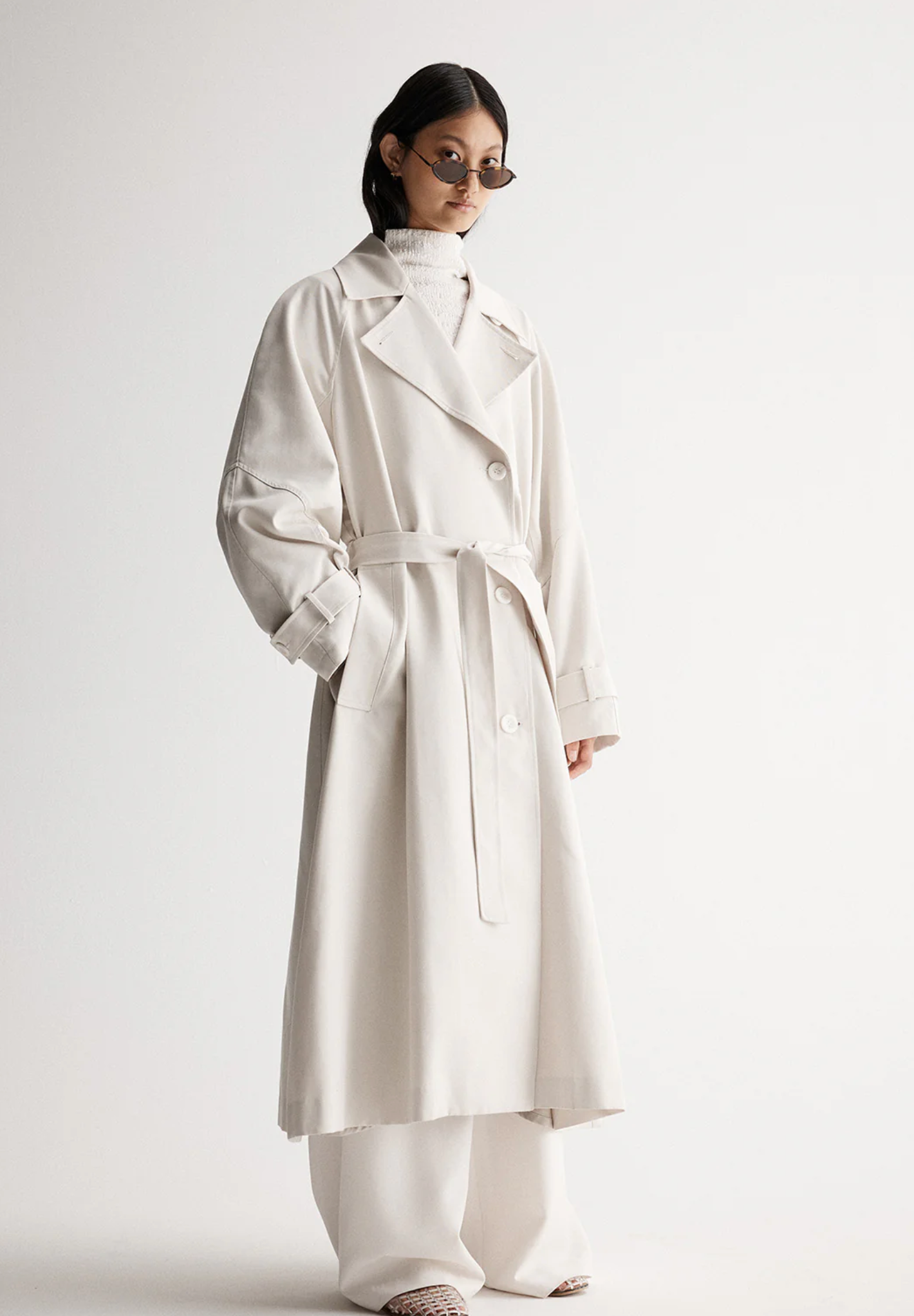 Timeless pieces born of the need for versatility and longevity are embodied in the arrival of the Leonora Trench. A wardrobe staple for transitional outfitting, this trench coat is cut to an oversized fit and full length with classic revere collar, button front and tie belt. Distinguished by its subtle detailing, this trench features a raglan sleeve with elbow seam detail.