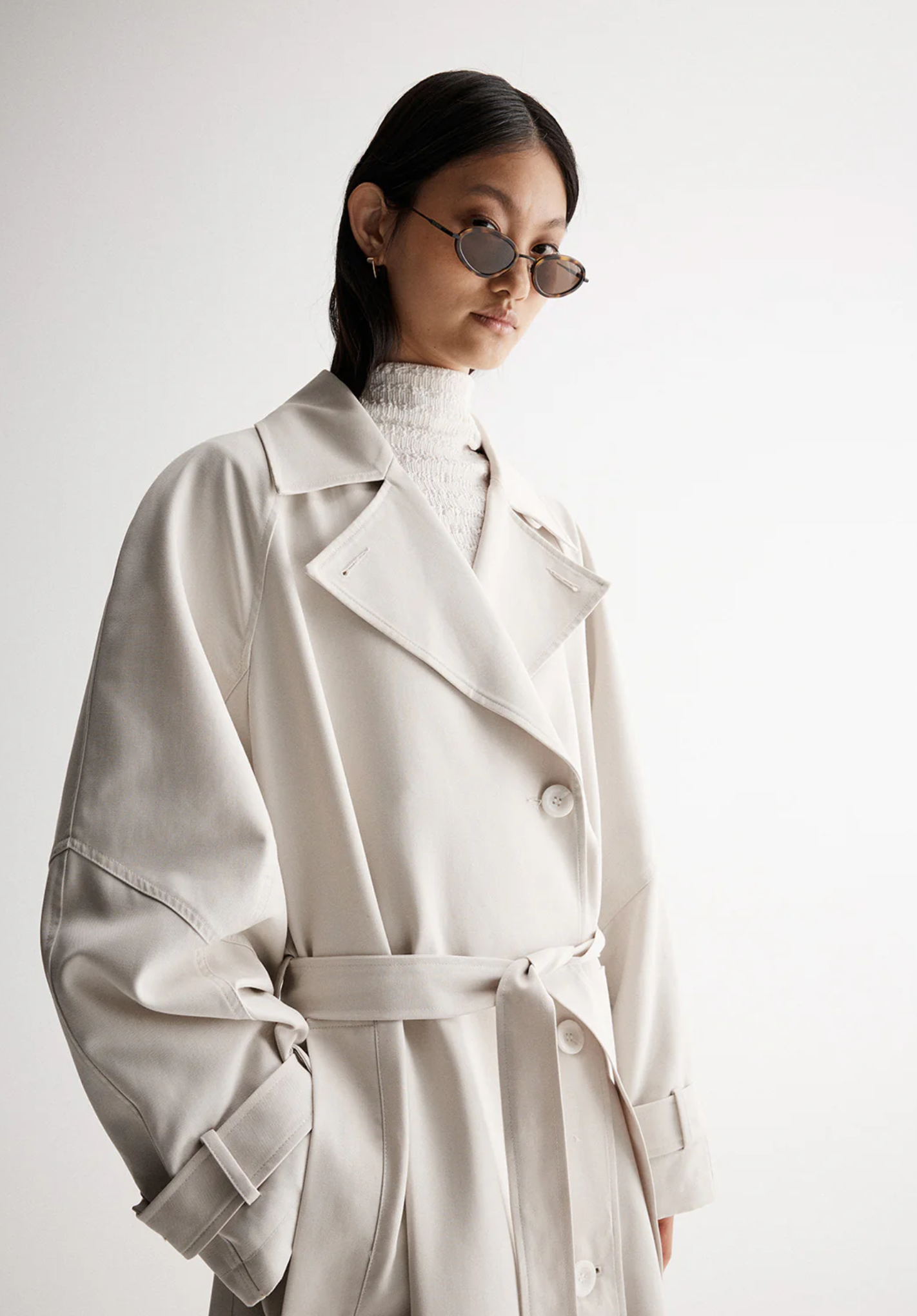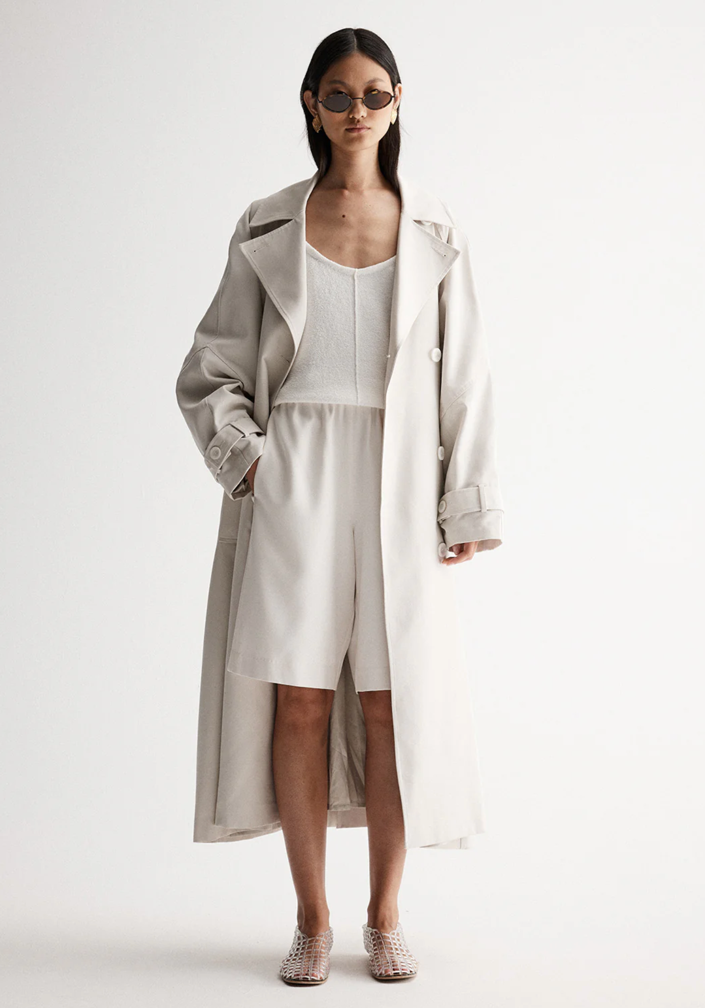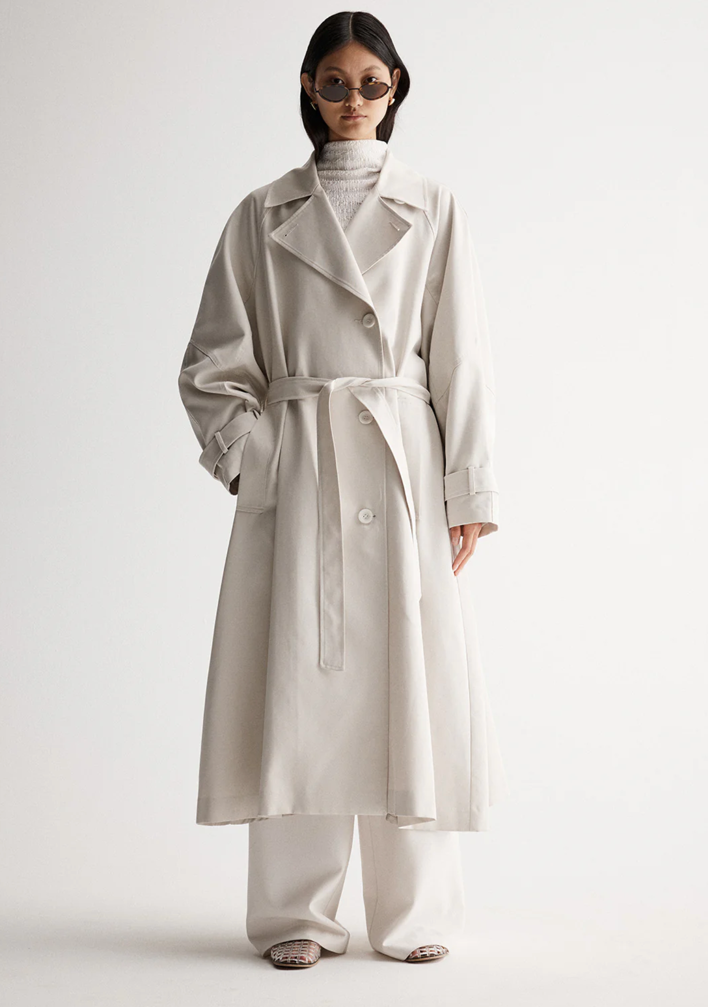 Timeless pieces born of the need for versatility and longevity are embodied in the arrival of the Leonora Trench. A wardrobe staple for transitional outfitting, this trench coat is cut to an oversized fit and full length with classic revere collar, button front and tie belt. Distinguished by its subtle detailing, this trench features a raglan sleeve with elbow seam detail.