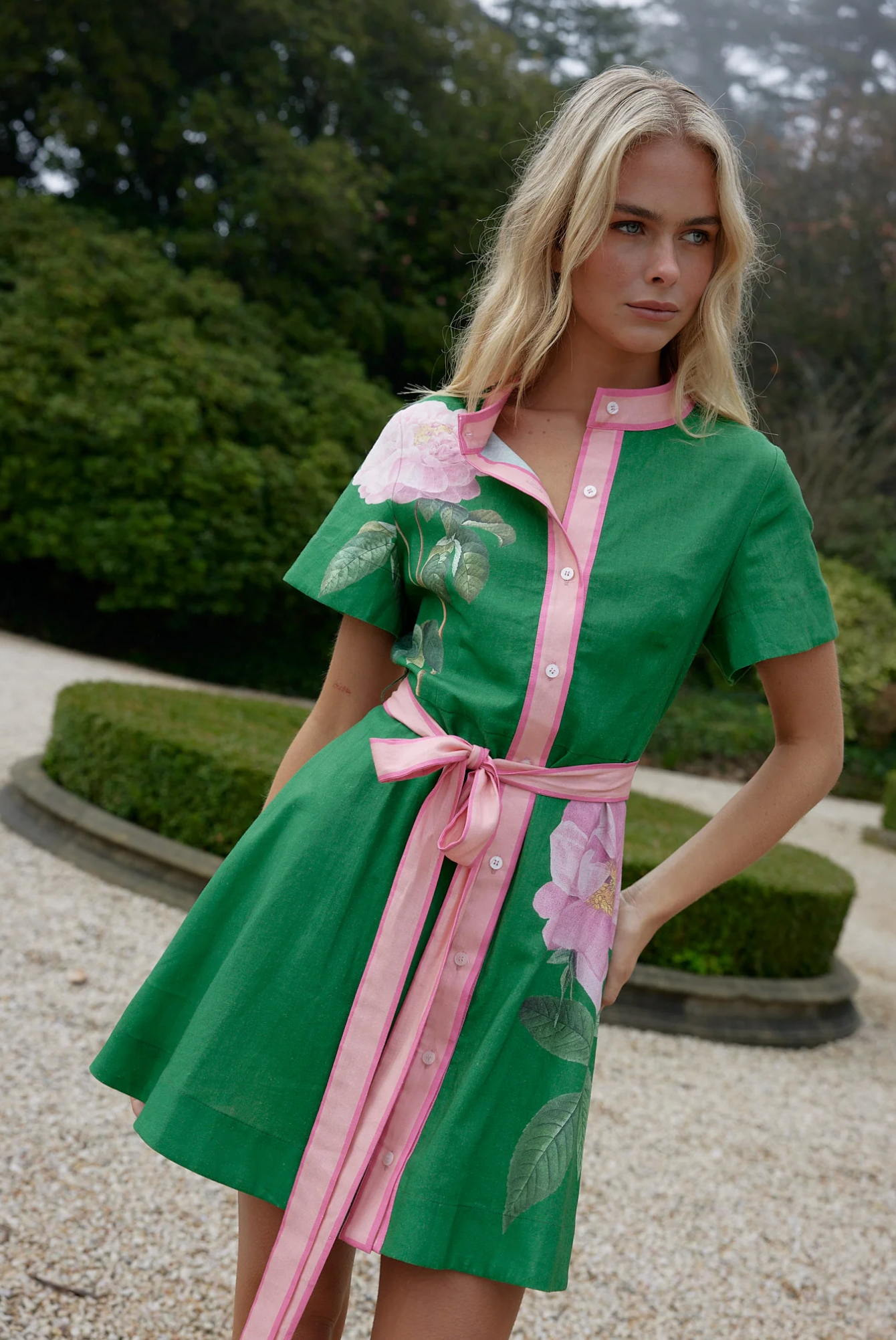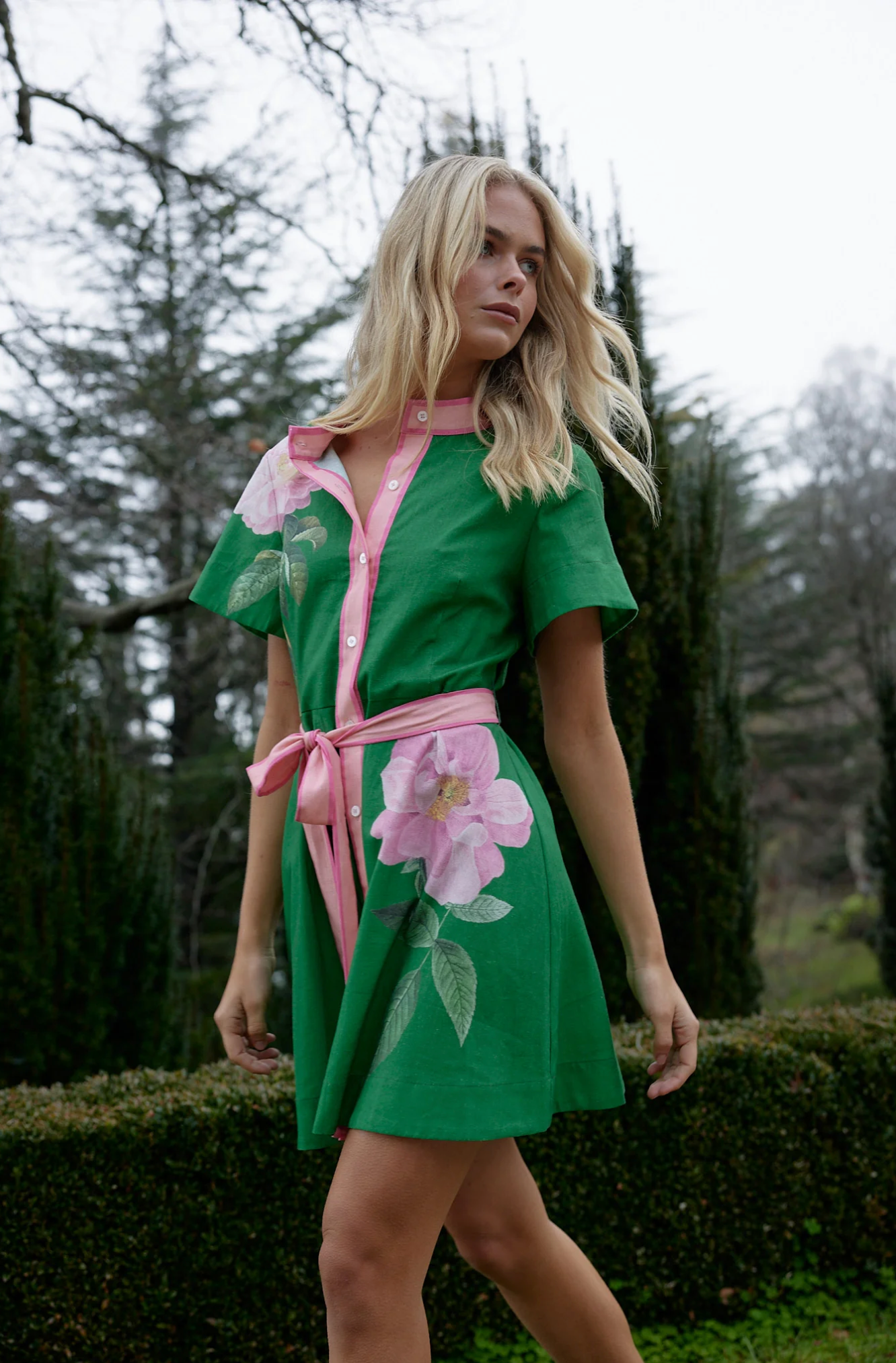 The Nami Dress is a statement in effortless elegance, featuring a meticulously placed floral print that enhances its flattering A-line silhouette. A striking contrast belt, collar, and button stand add a touch of refinement, while the mini length offers a playful yet polished appeal—perfect for any occasion.