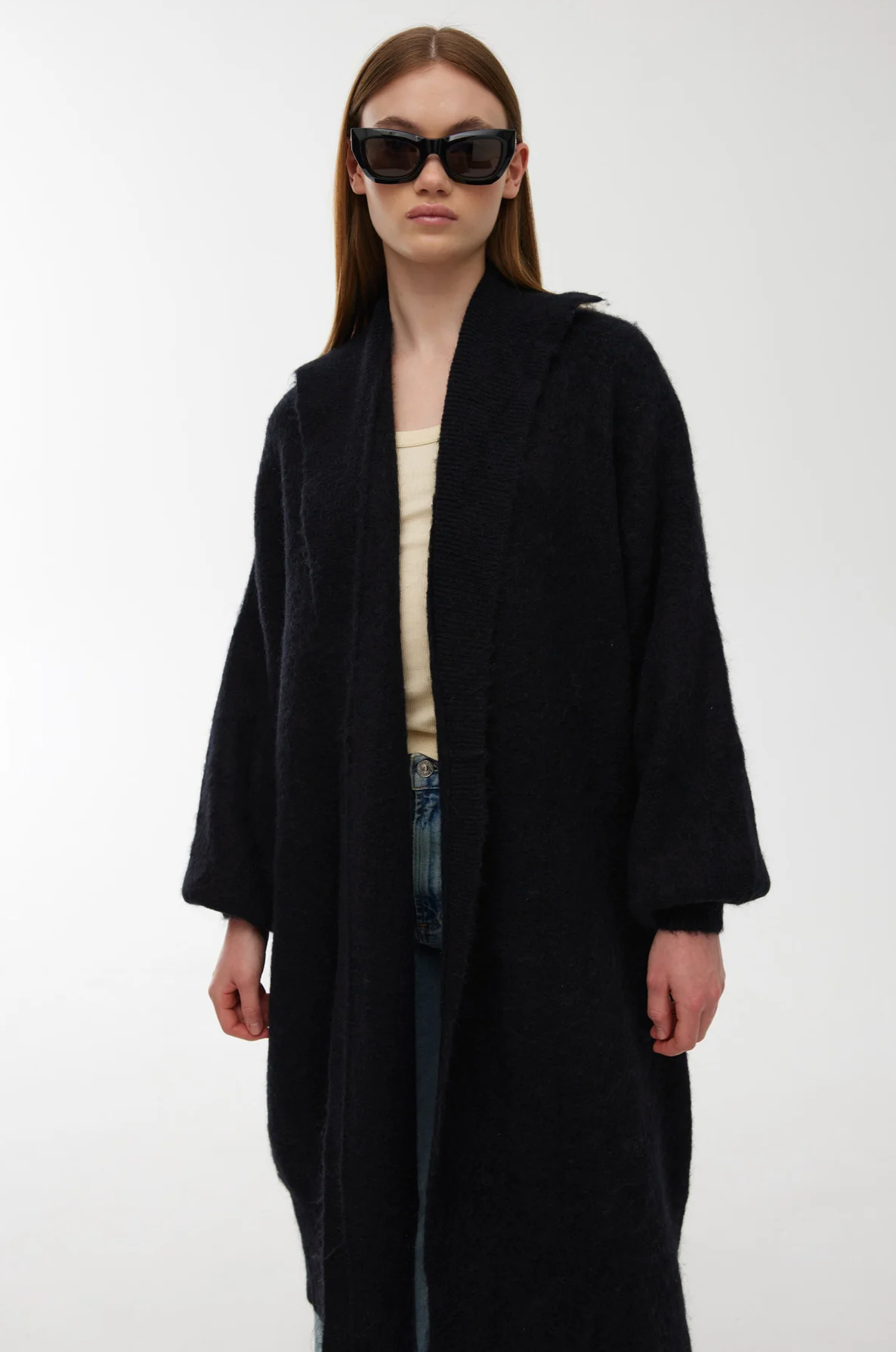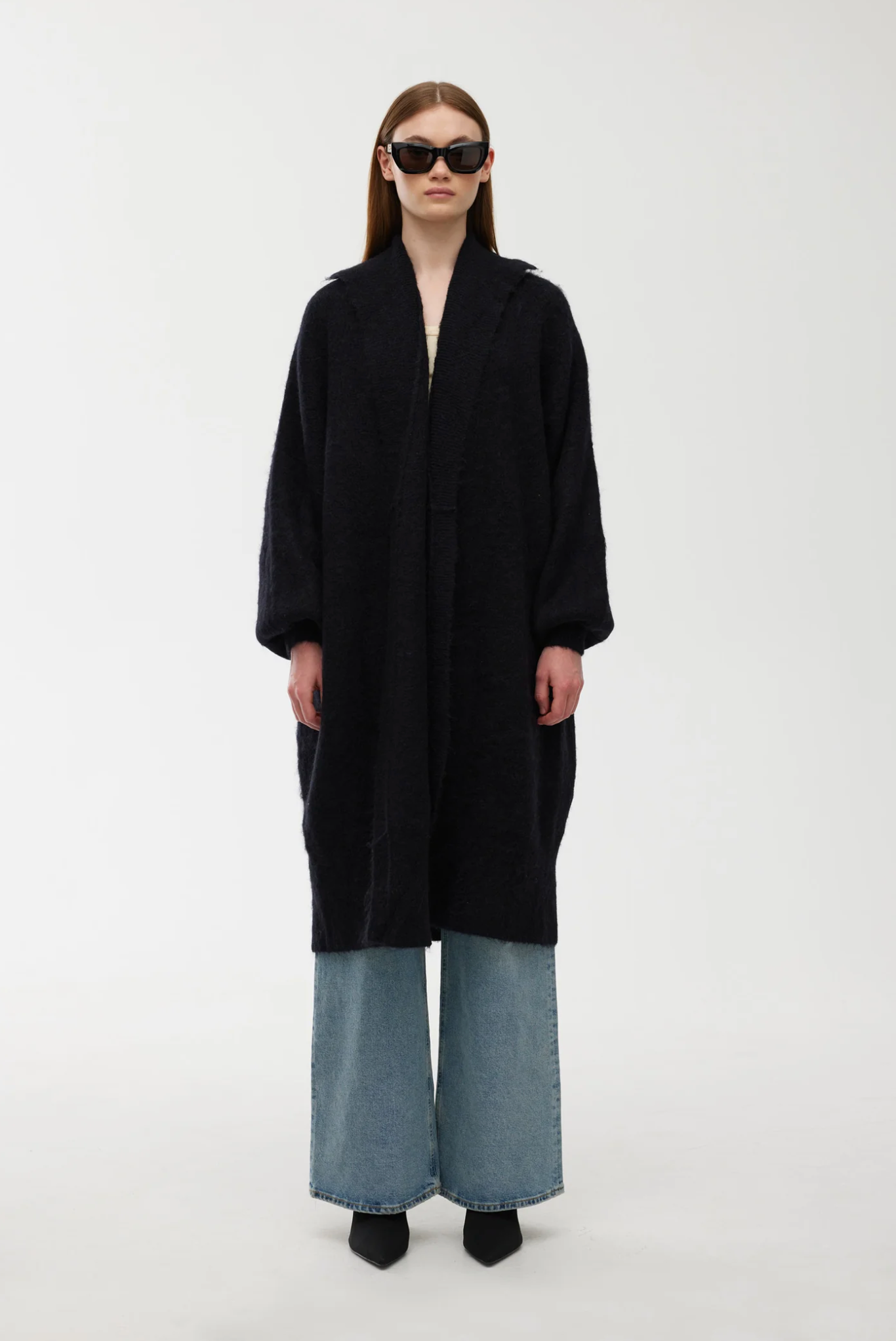 The Aspen Cardigan is a foundational wardrobe piece designed to elevate everyday outfitting. Detailed with an effortlessly chic, relaxed silhouette and an open front cascading ribbed shawl collar. Soft to the touch, this cardigan is knitted from a luxurious wool and mohair blend that is imbued with a subtle brushed texture.