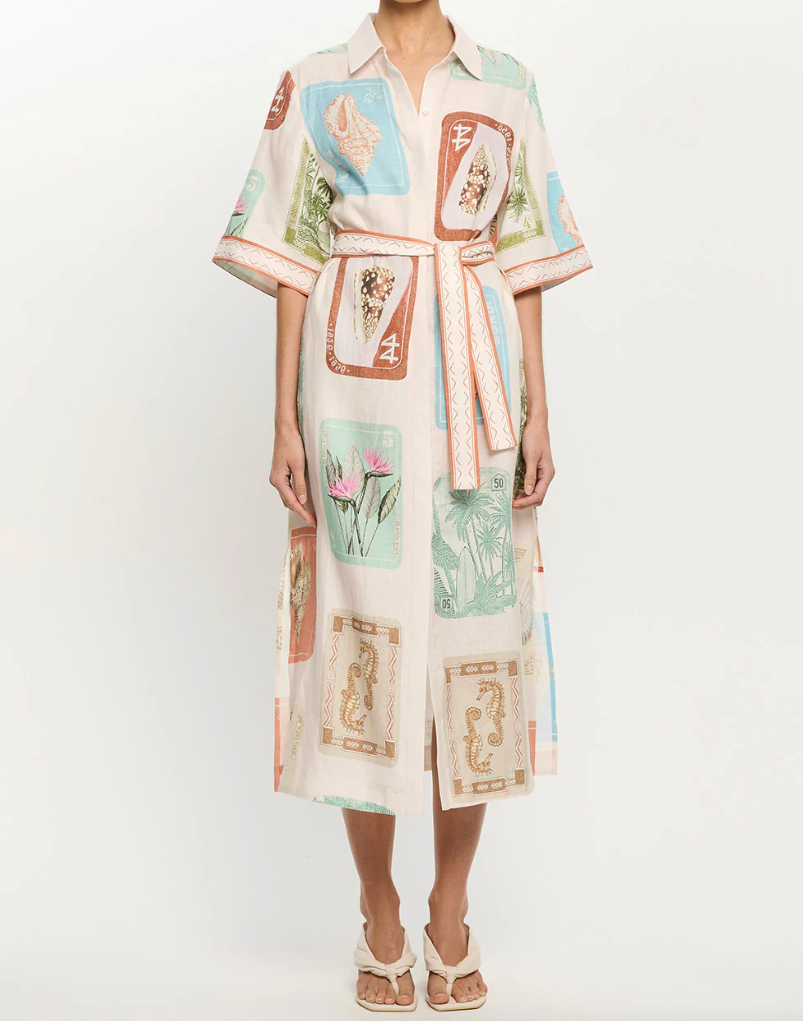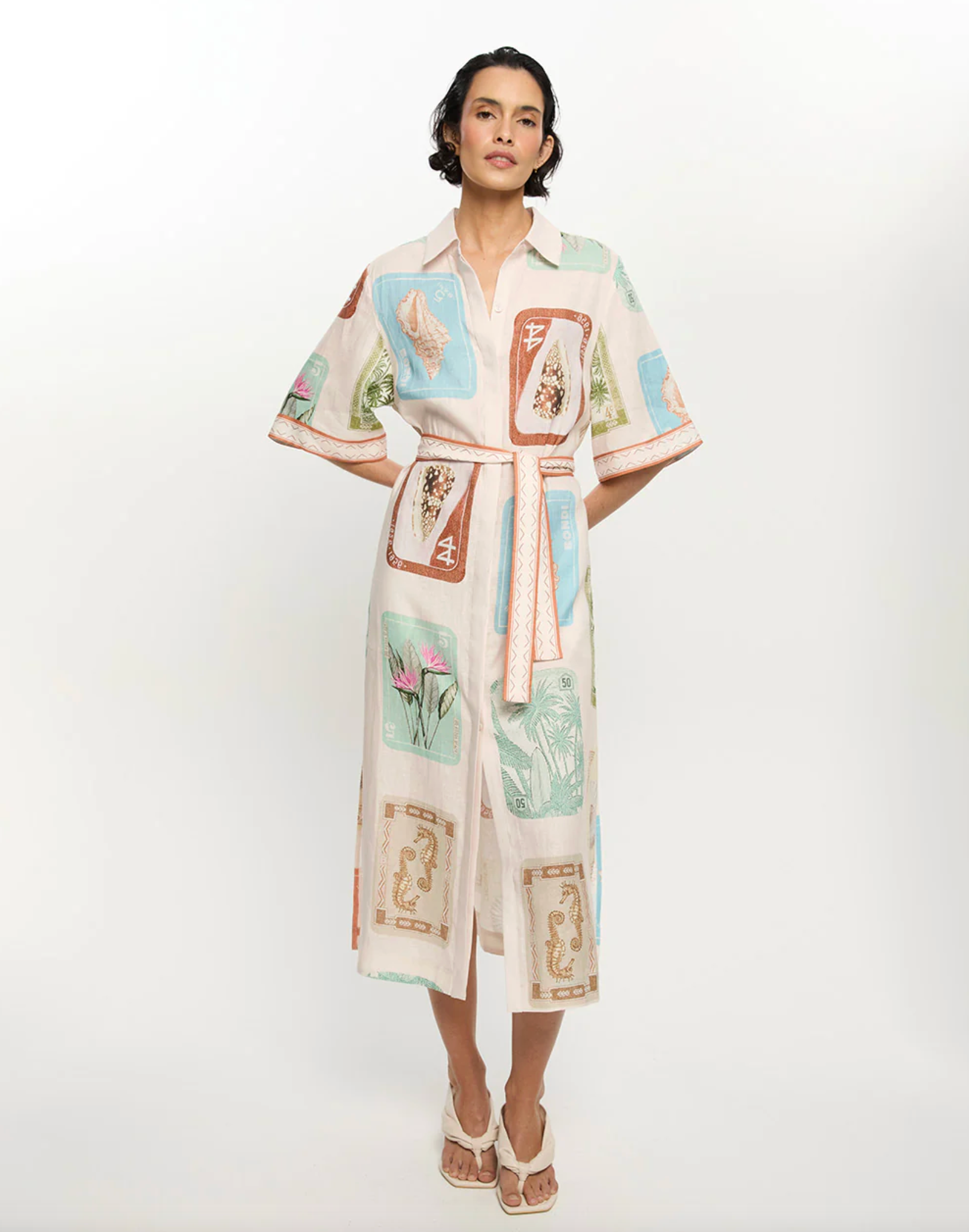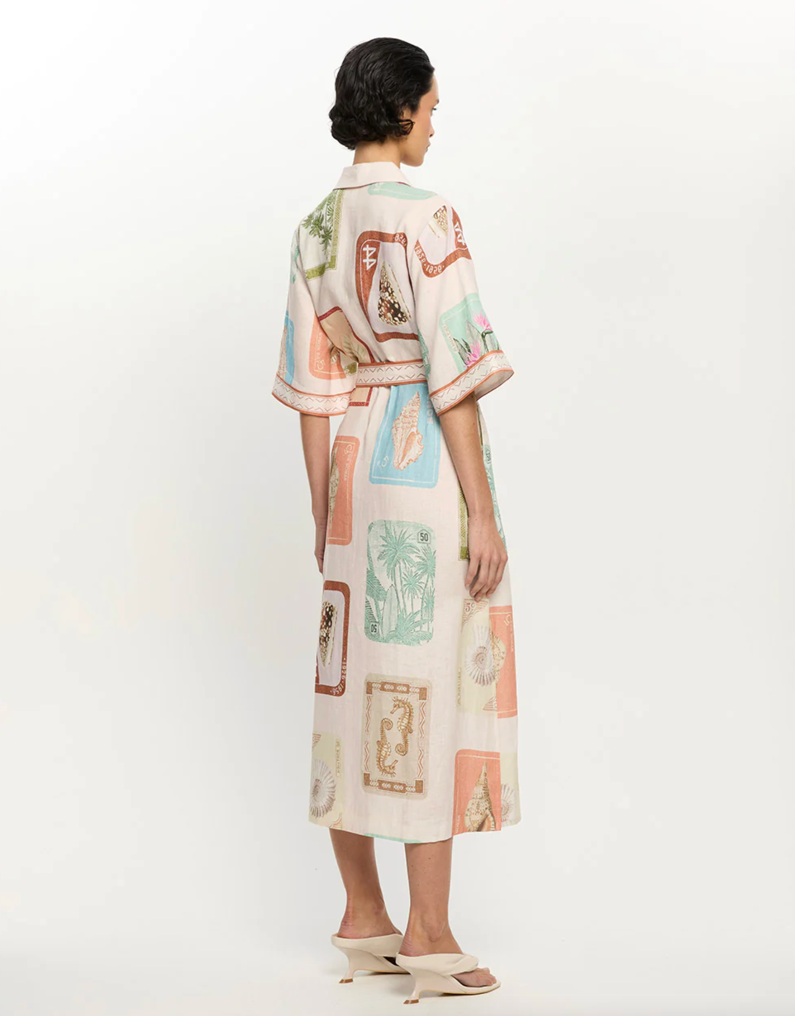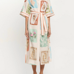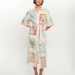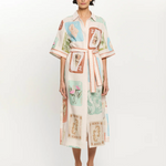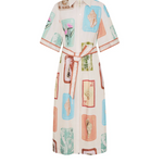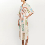 Coastline is a vintage-inspired postcard print featuring coastal motifs in soft pastel tones on a soft neutral base. The Coastline Shirt Dress is crafted in a relaxed silhouette, featuring kimono-style sleeves and a button-through front. Complete with a removable waist tie, it offers the option to wear loose for effortless ease or cinched for a more defined shape. Elevate with heels for long lunches or evening celebrations.