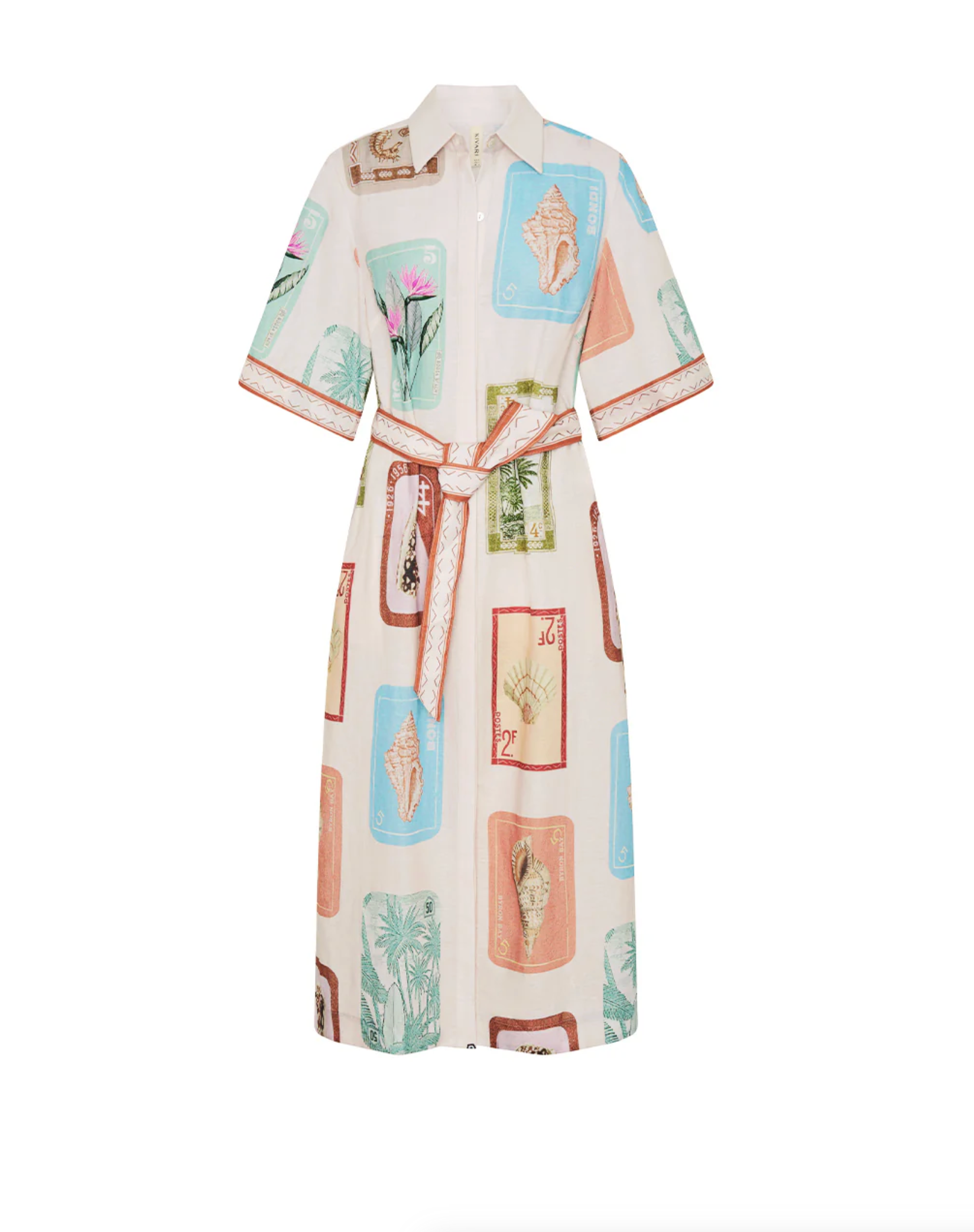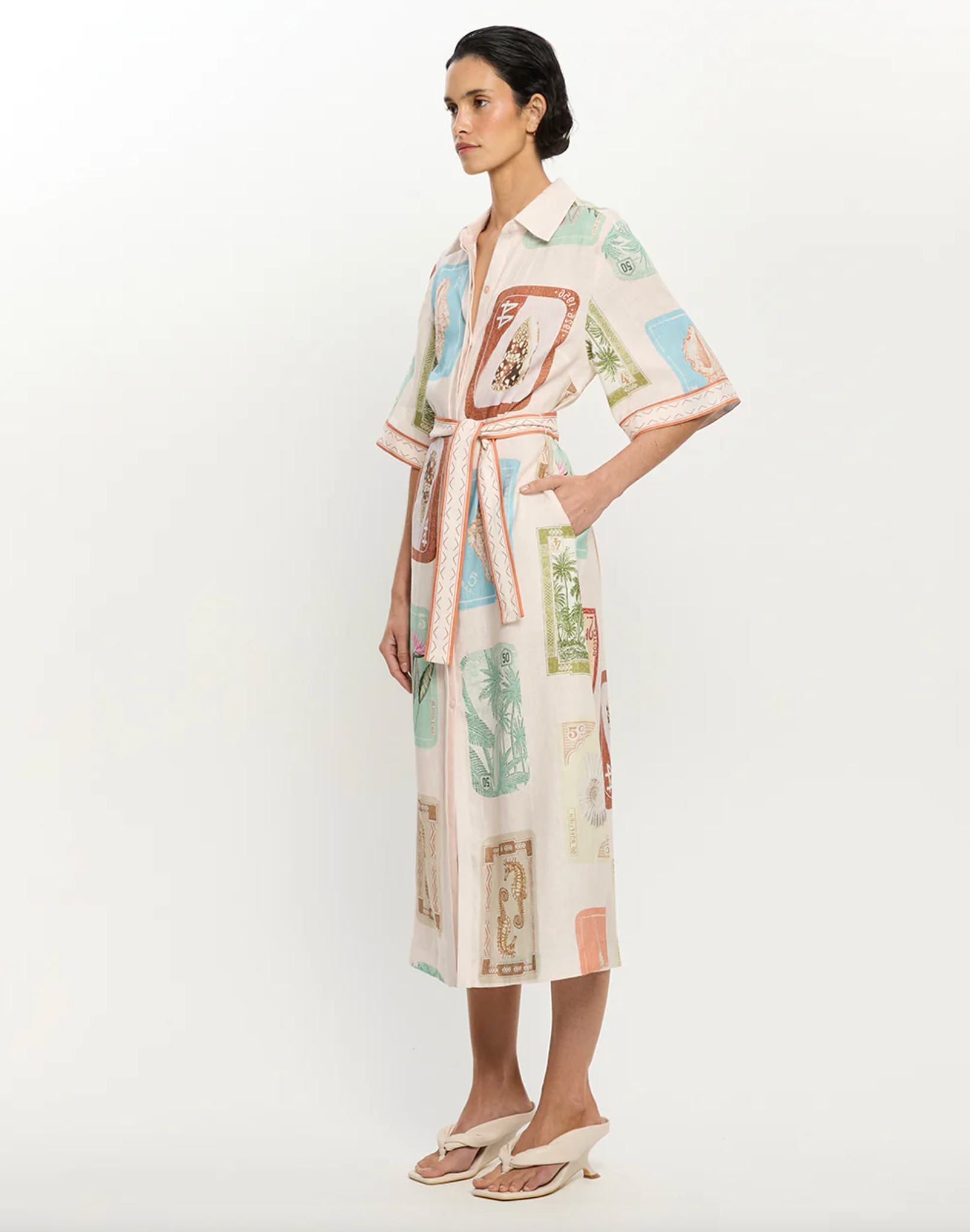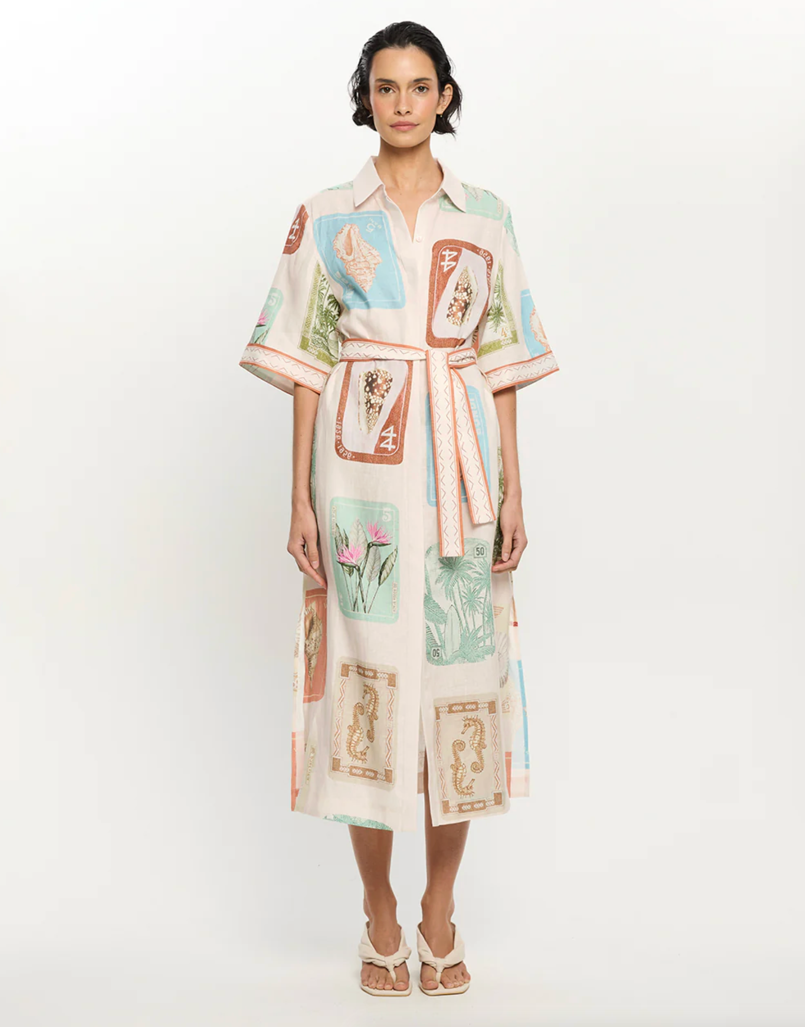 Coastline is a vintage-inspired postcard print featuring coastal motifs in soft pastel tones on a soft neutral base. The Coastline Shirt Dress is crafted in a relaxed silhouette, featuring kimono-style sleeves and a button-through front. Complete with a removable waist tie, it offers the option to wear loose for effortless ease or cinched for a more defined shape. Elevate with heels for long lunches or evening celebrations.