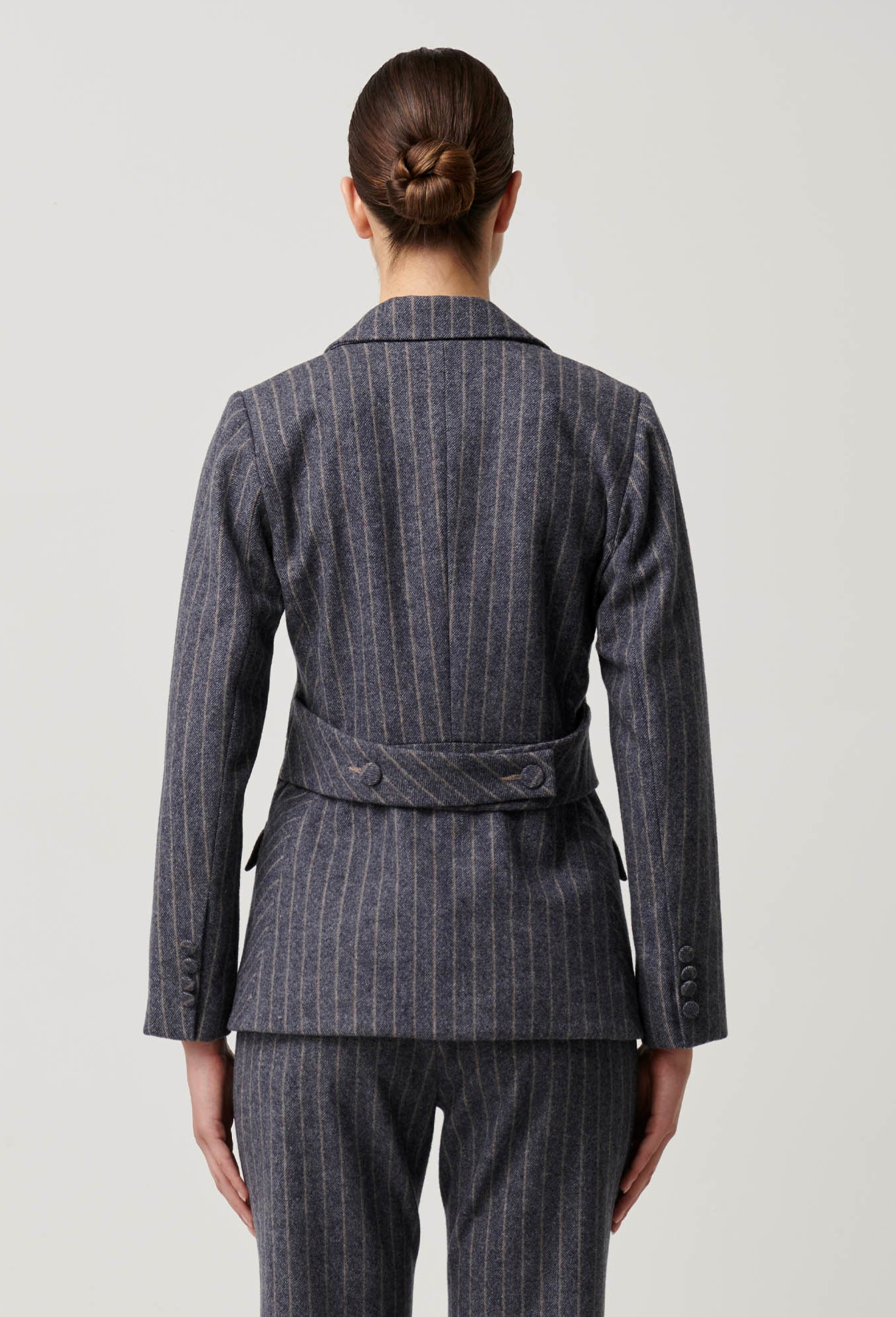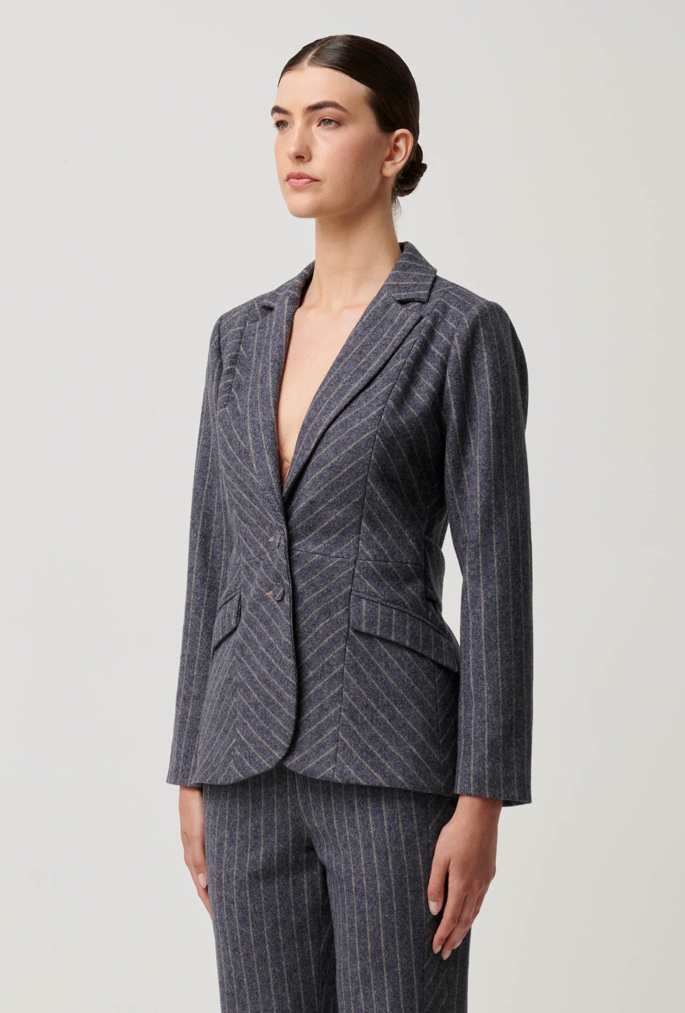 Command attention with timeless sophistication in the Oaklyn Chevron Stripe Panelled Blazer in Bluestone. This tailored masterpiece reimagines classic suiting with a contemporary twist. Designed with a panelled silhouette, it effortlessly combines sharp structure and feminine elegance, making it the ultimate wardrobe staple for power dressing and polished casual looks alike.