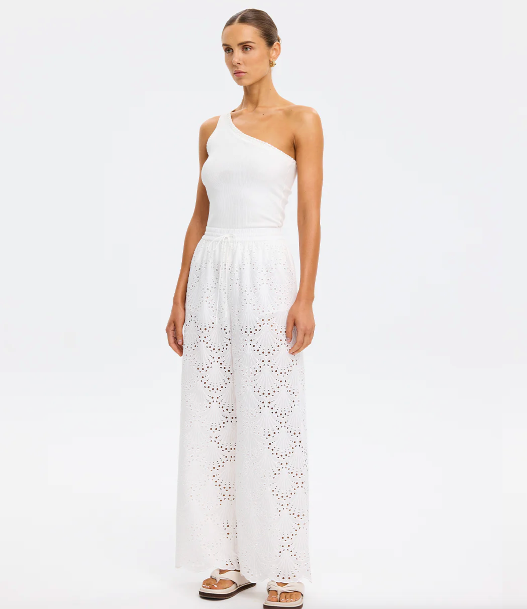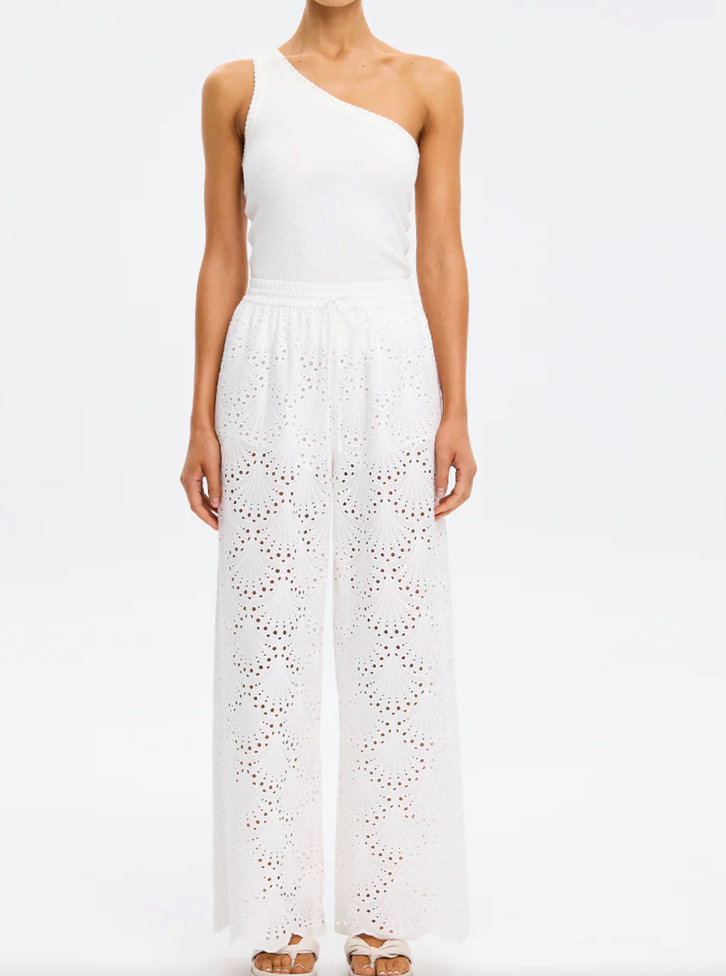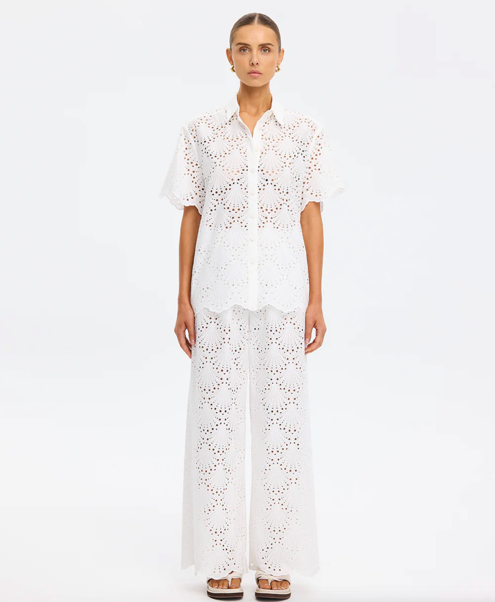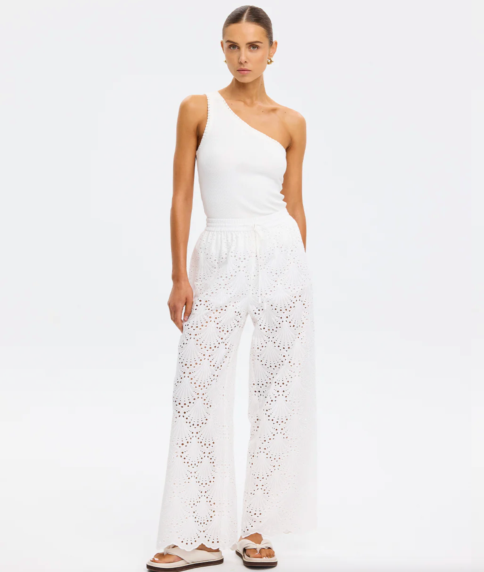 The Elodie Pants are crafted in a shell design broderie with a classic straight leg featuring an elasticated waist complete an adjustable drawcord with signature cord ends. Pair with the matching Elodie Top for a coordinated set, or style with a simple tank for an effortless look.