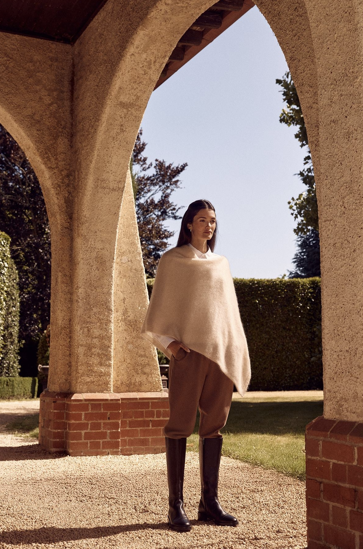 The Brushed Pure Cashmere Poncho is a lightweight knit with an asymmetrical cut, offering a relaxed and effortless drape.