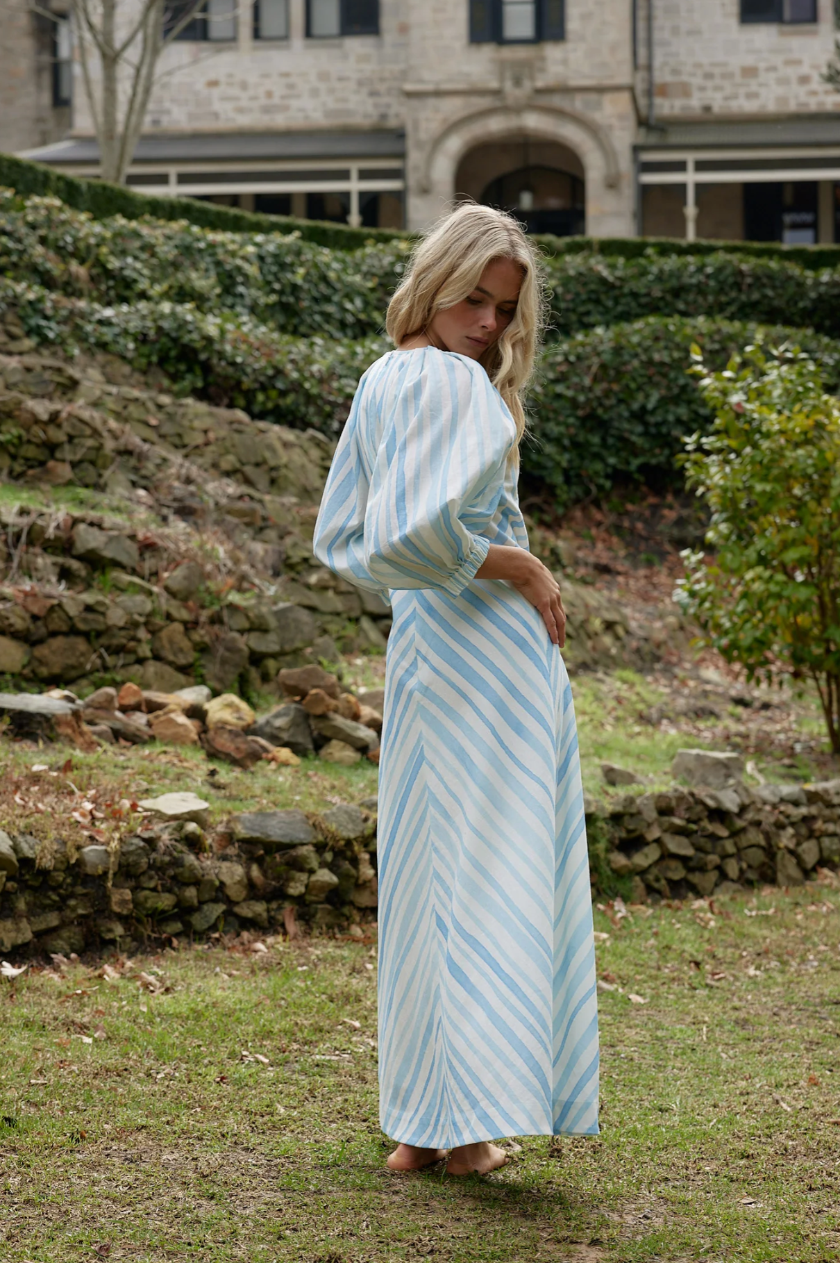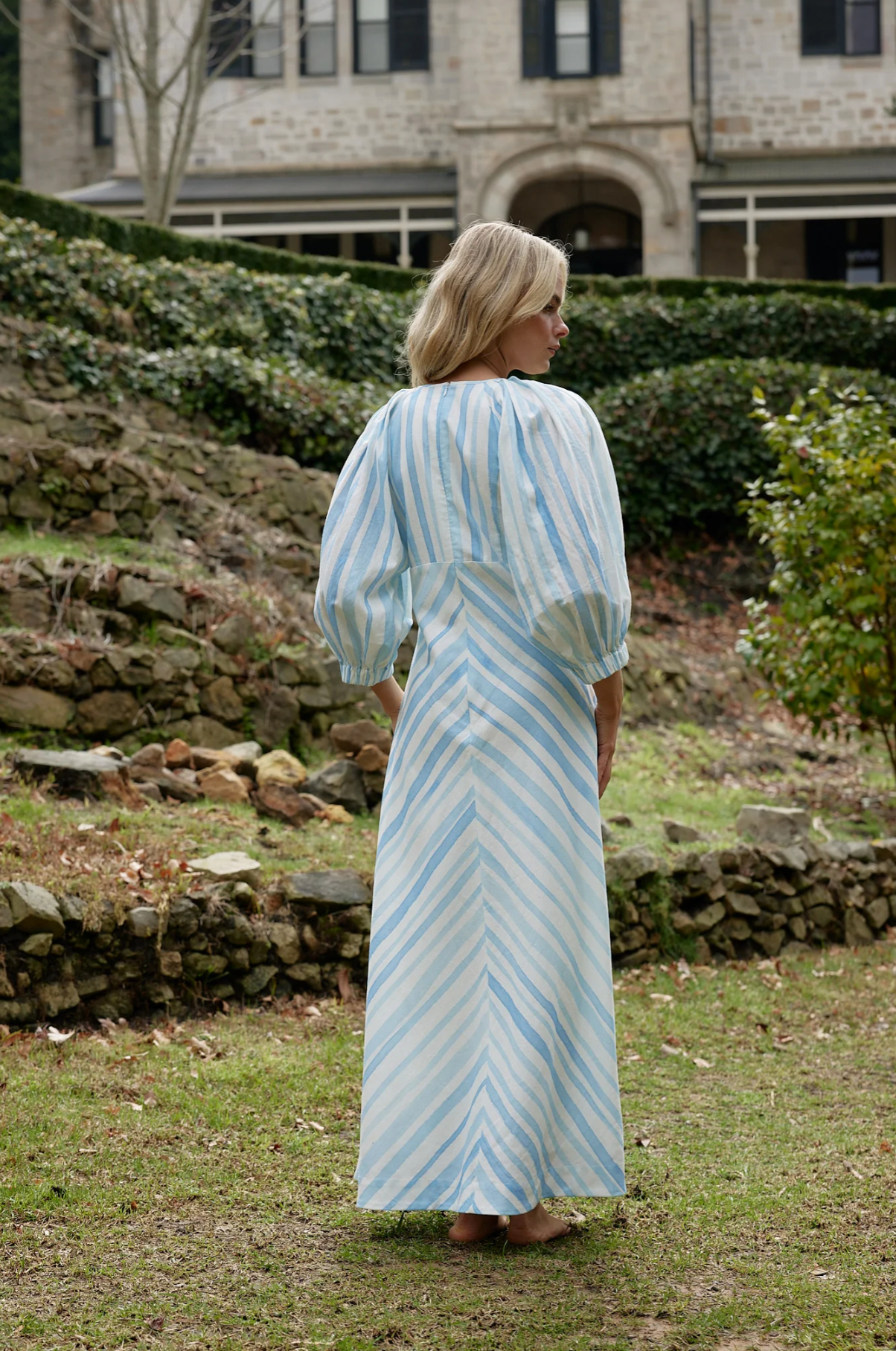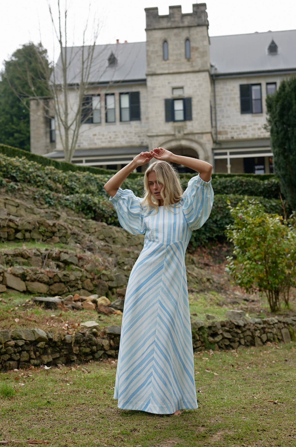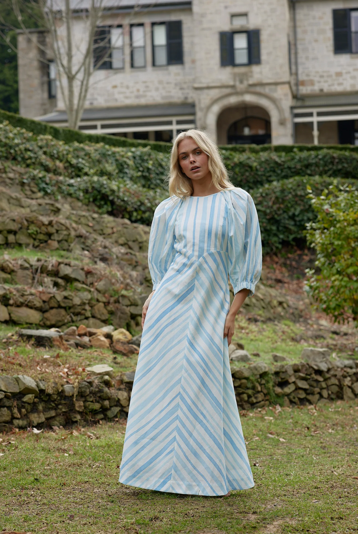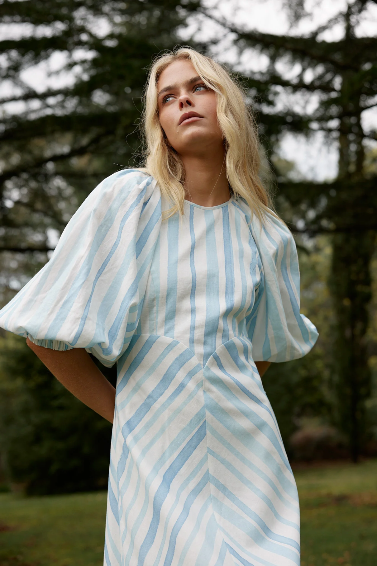 The Lucinda Dress exudes a radiant sense of joy and femininity, featuring mid-length sleeves with elastic cuffs that offer versatile styling options. The heart-seamed waist gently cinches the silhouette, while the exclusive powder stripe design adds a playful yet refined elegance. This dress seamlessly combines sophistication with effortless charm.