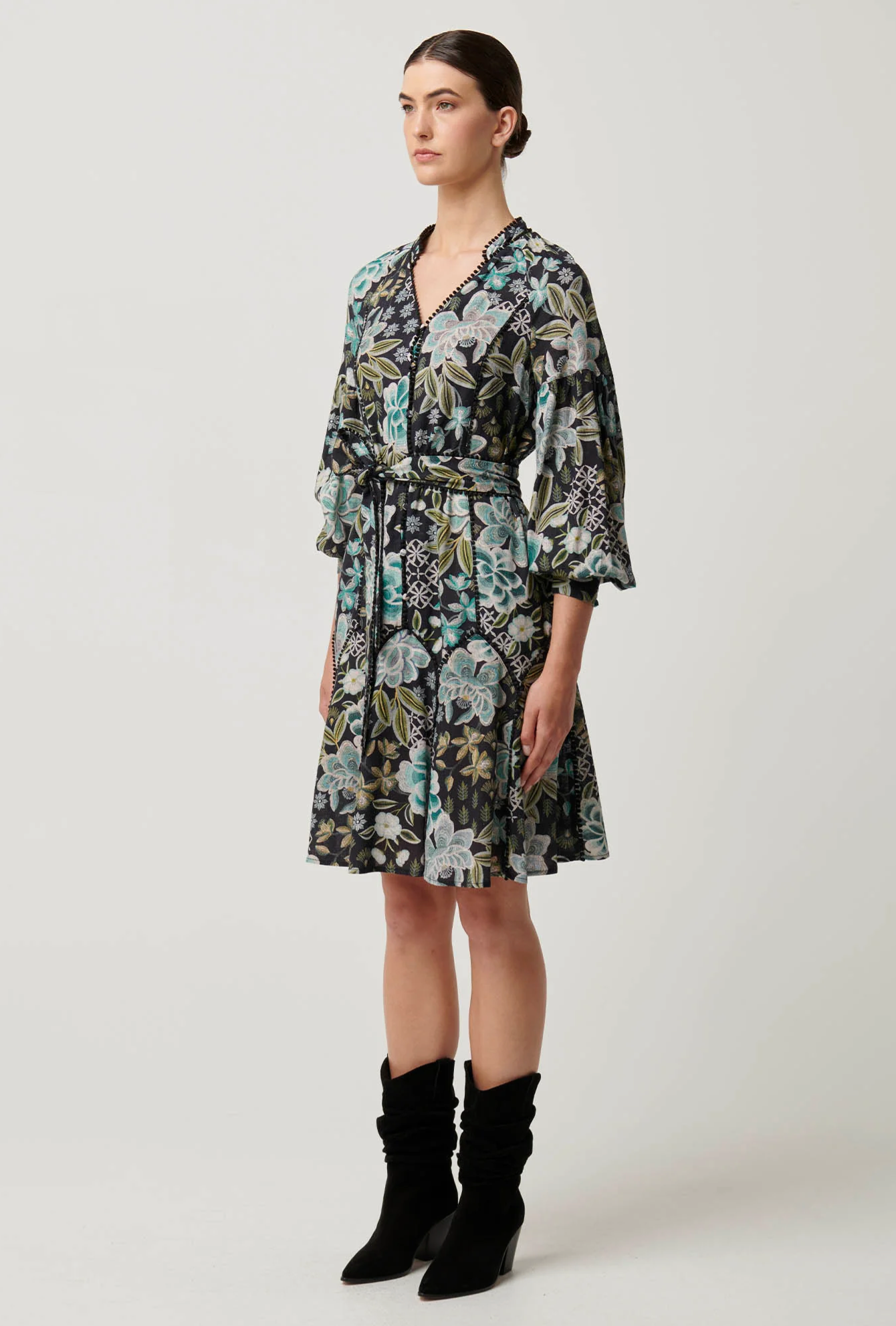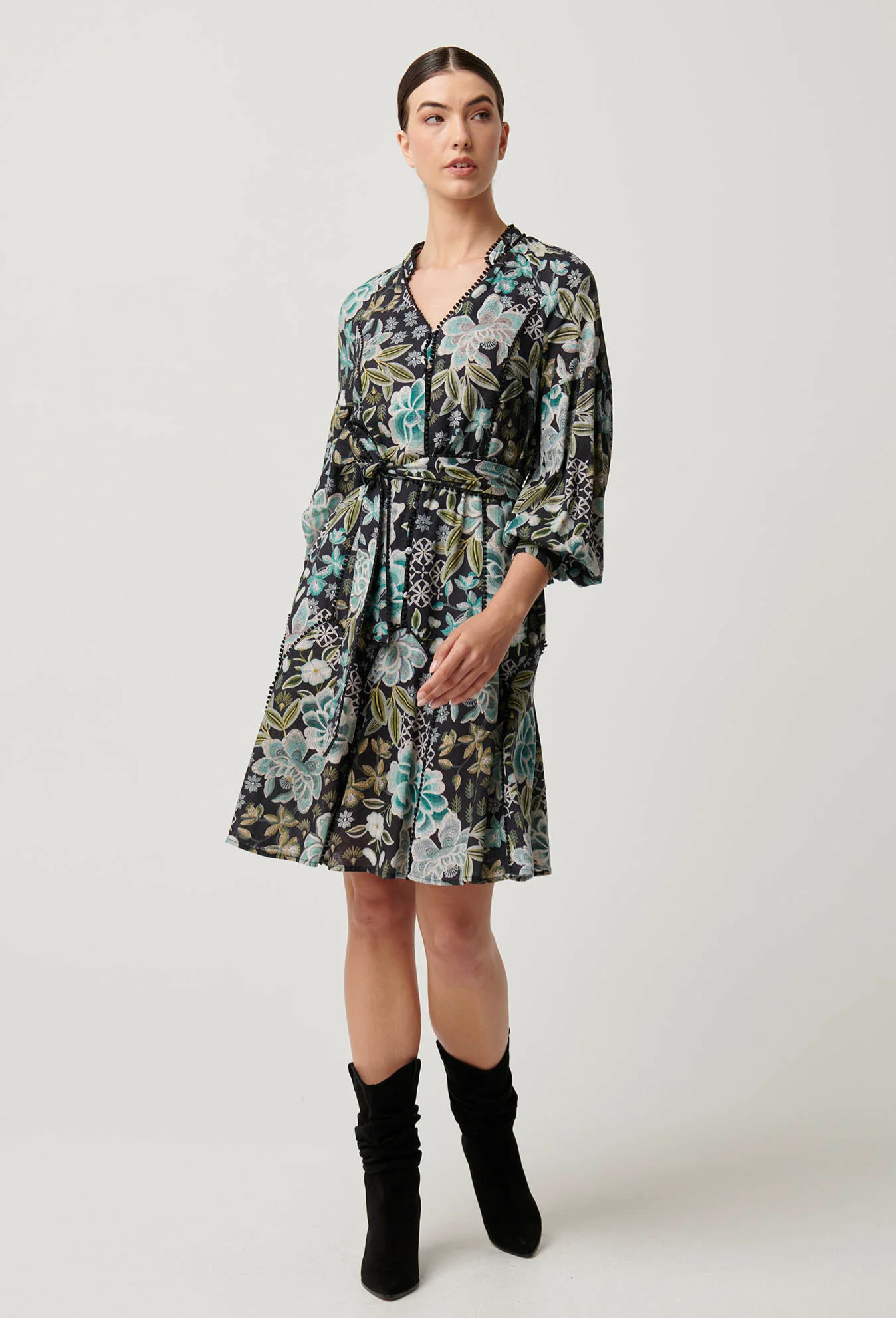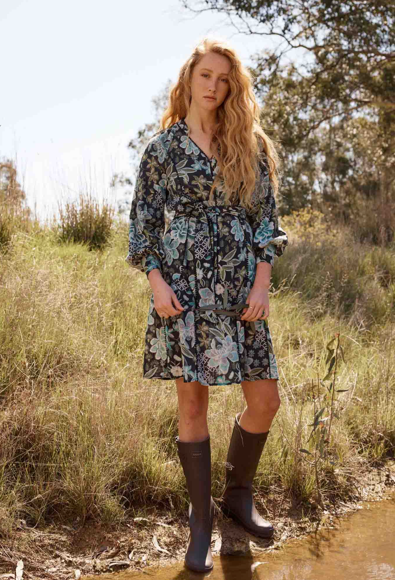 Step into effortless elegance with the Emersyn Linen Viscose Lace Panelled Dress in Dahlia Fields. This dress features a stunning floral print in shades of teal, cream, and soft green set against a dark background for a bold yet sophisticated look.