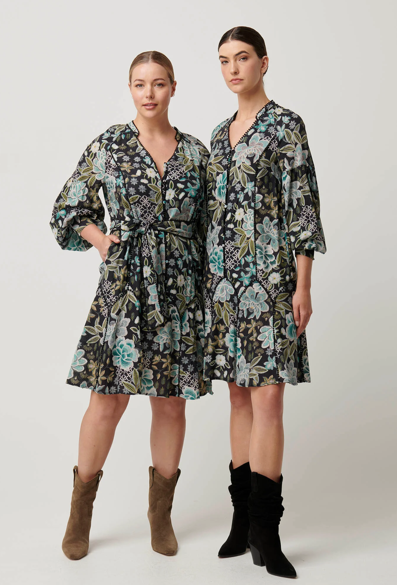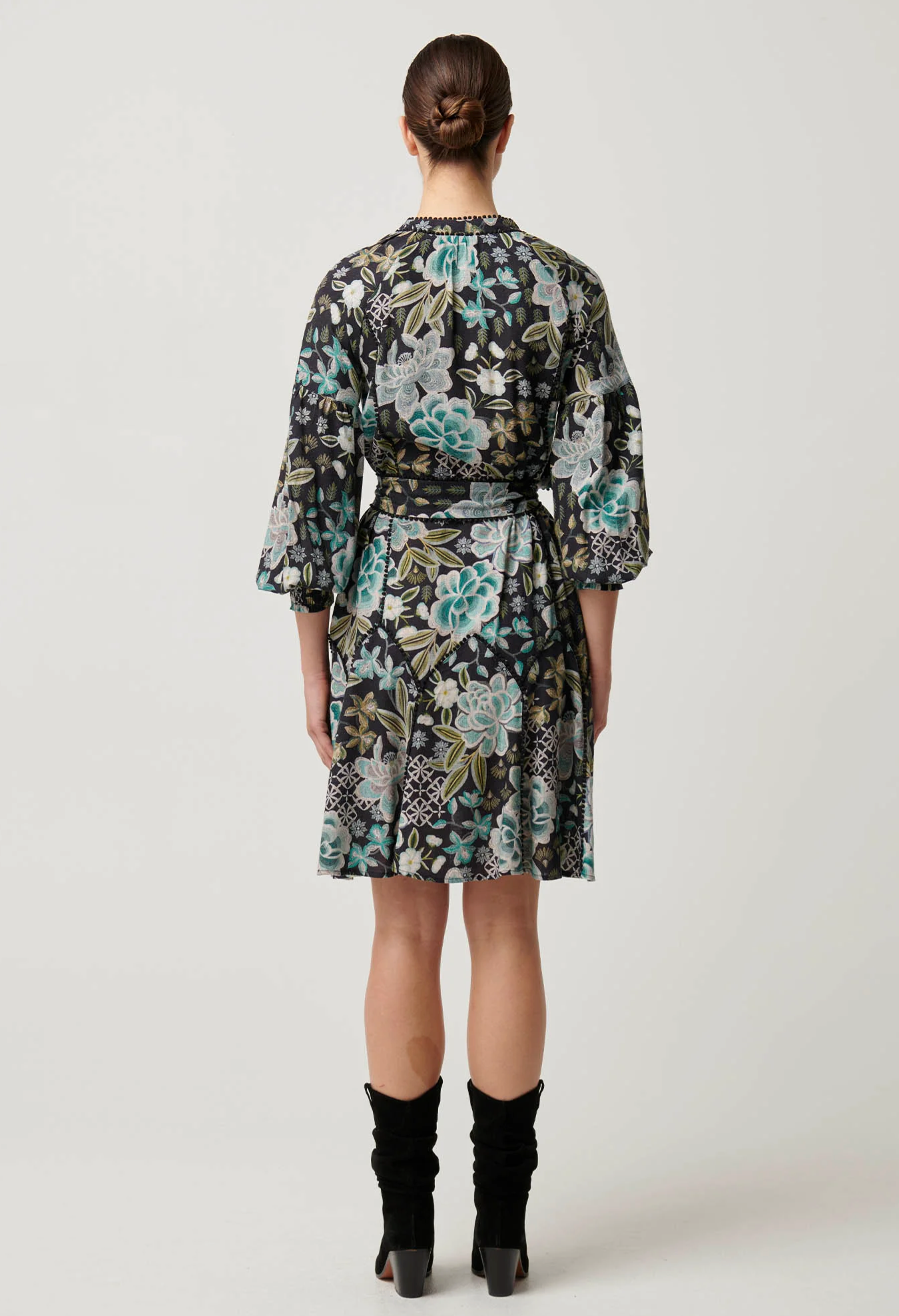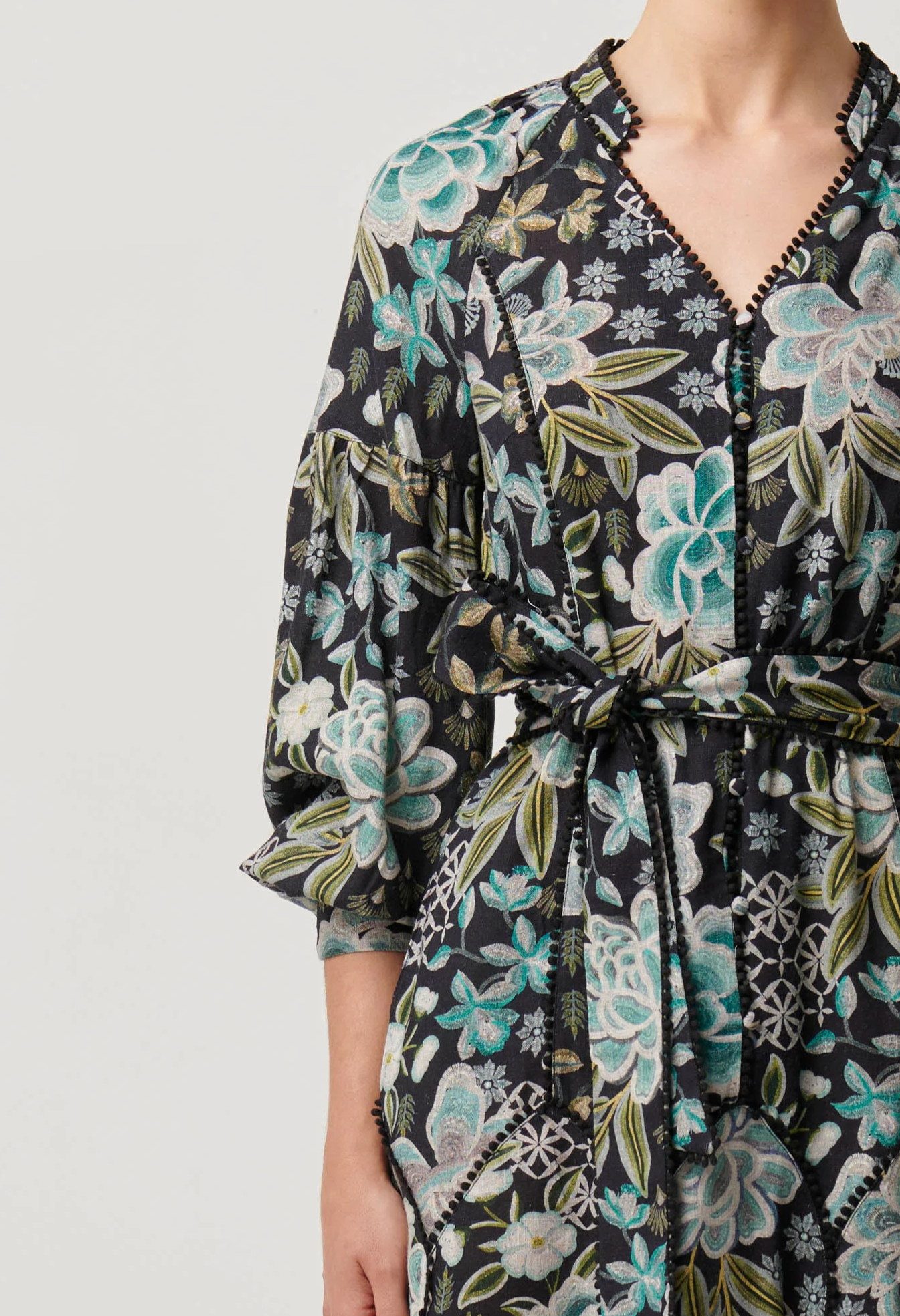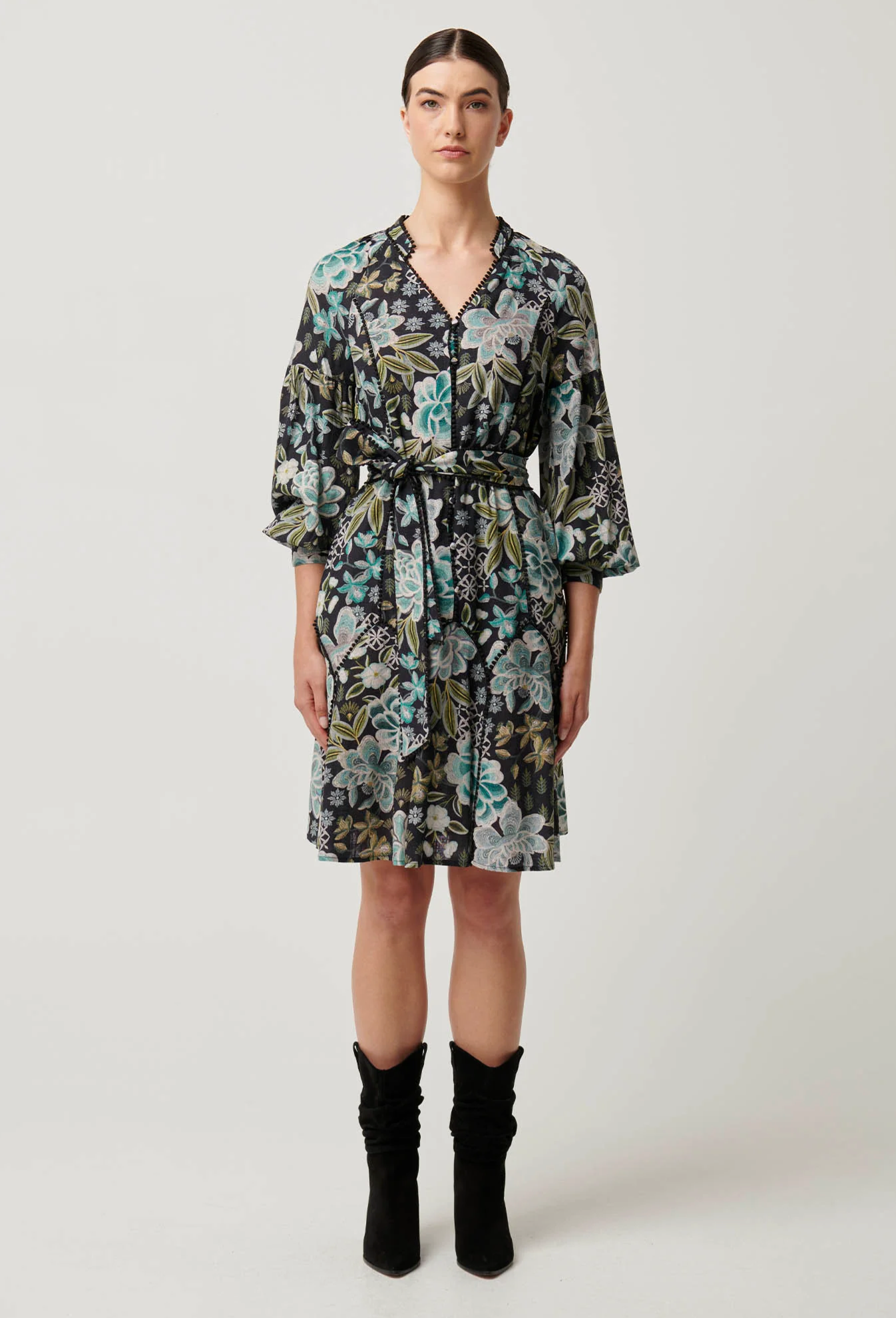 Step into effortless elegance with the Emersyn Linen Viscose Lace Panelled Dress in Dahlia Fields. This dress features a stunning floral print in shades of teal, cream, and soft green set against a dark background for a bold yet sophisticated look.