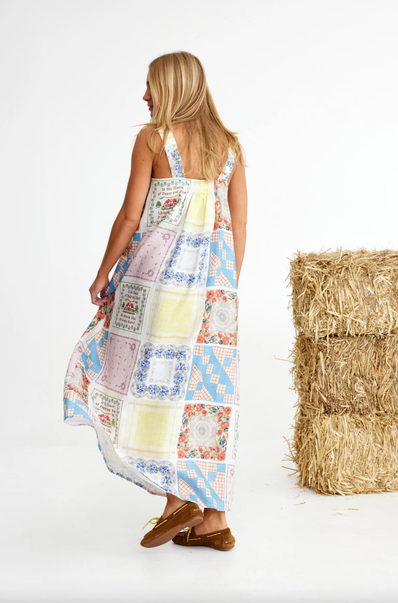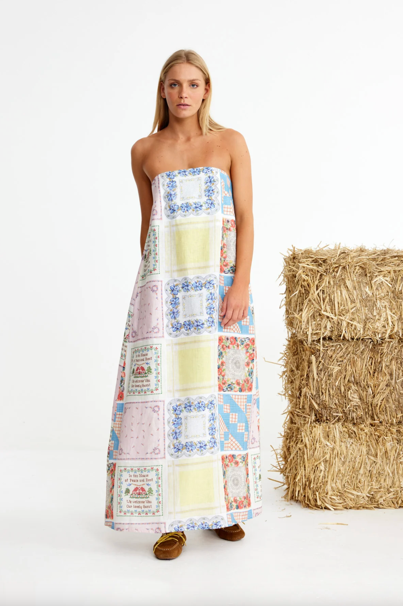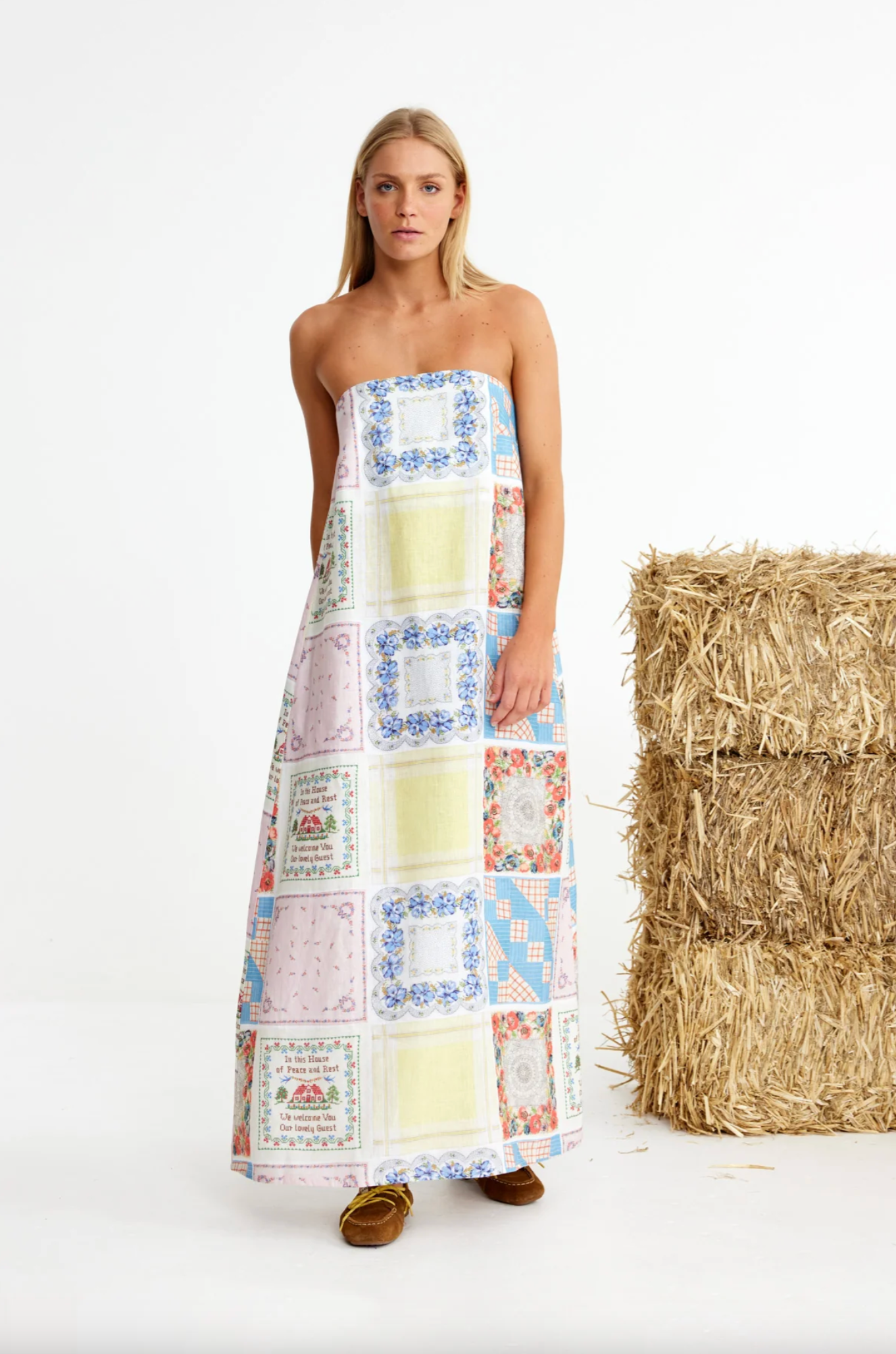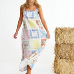 Bending Poles. For those not famil, its racing your ponies through a series of poles. Excellent. And just as cute simple good fun a sundress stitched with stories. Cut from 100% linen & patterned with a patchwork of daintiest vintage handkerchief designs. Cute as a cucumber. Scallop florals, sweet checks, cross stitched homespun charm. Removable shoulder straps, an elasticated back, deep side pockets keep it easy & unfussy, whether you’re leaning on the fence rail or festivals, footloose & fancy free. The kind of dress that says you’ve inherited both style & a trunkful of tales.