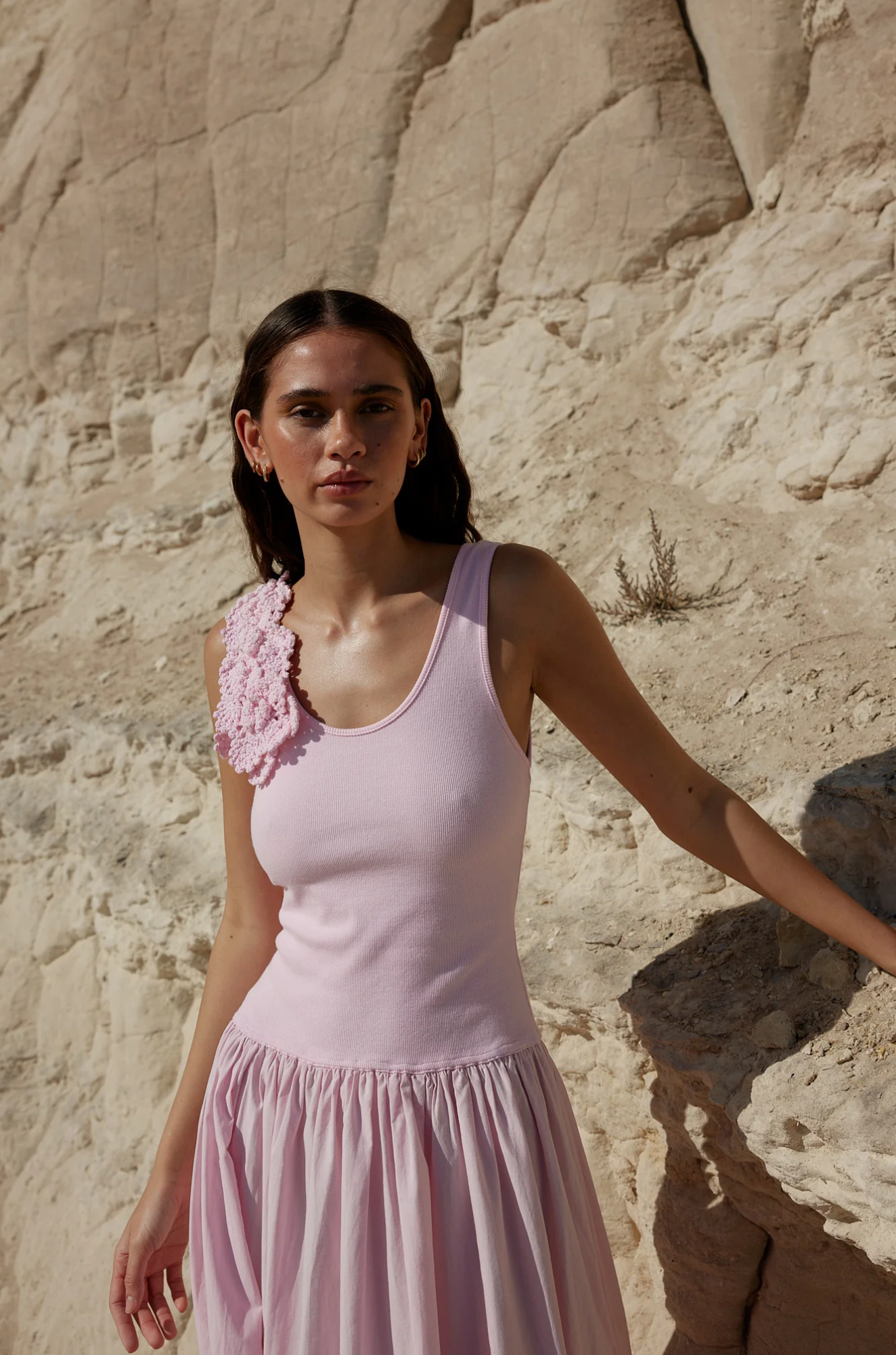 Step into sophistication with the Grace Dress, designed with a fitted tank drop-waist bodice and a voluminous gathered skirt. Adorned with delicate crochet flowers, this enchanting piece makes a soft yet striking statement. Perfect for any occasion, the Grace Dress effortlessly combines elegance and charm for a look that’s both timeless and fresh.
