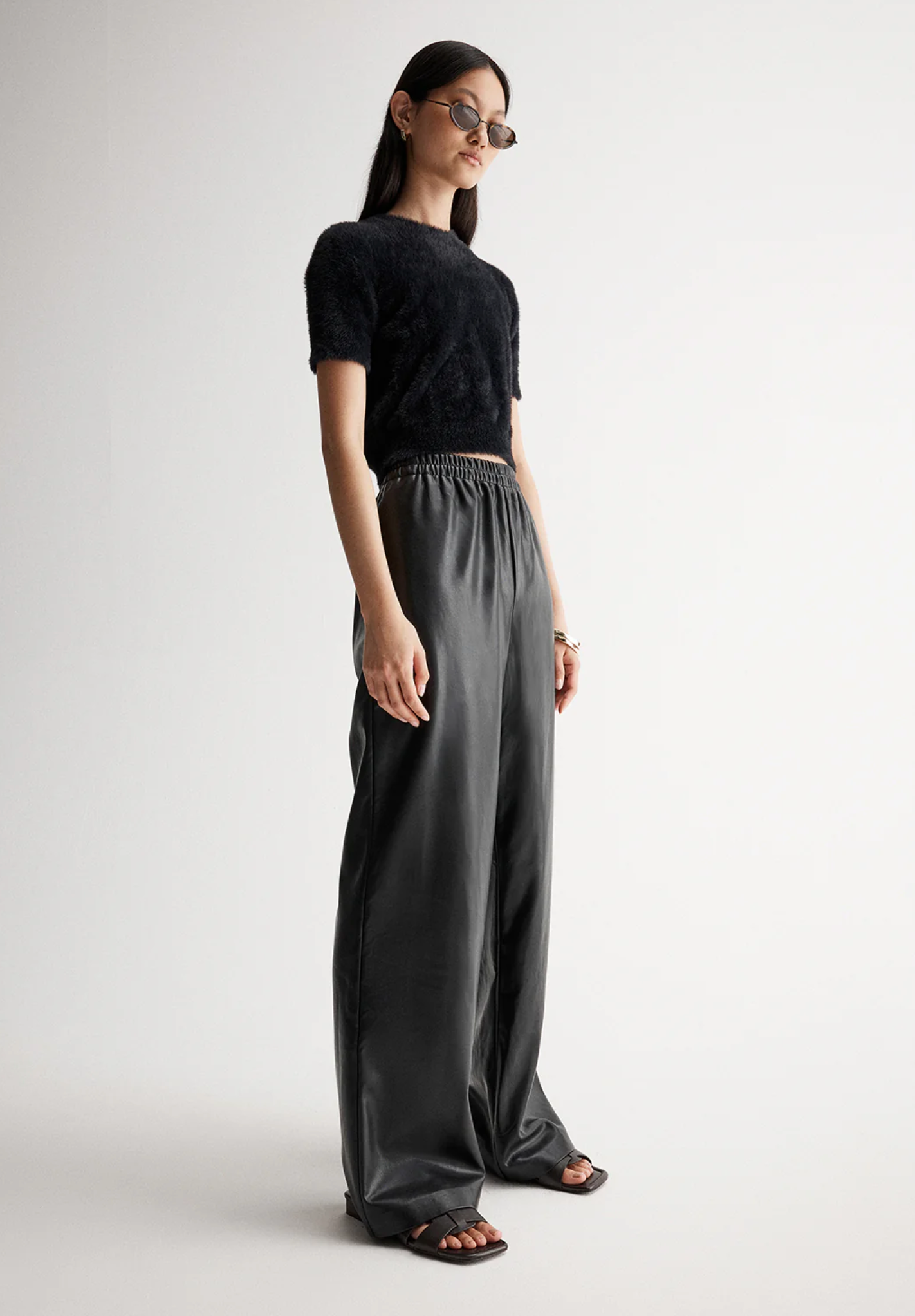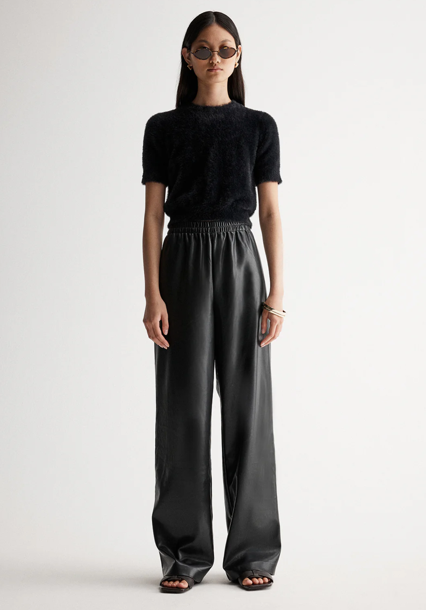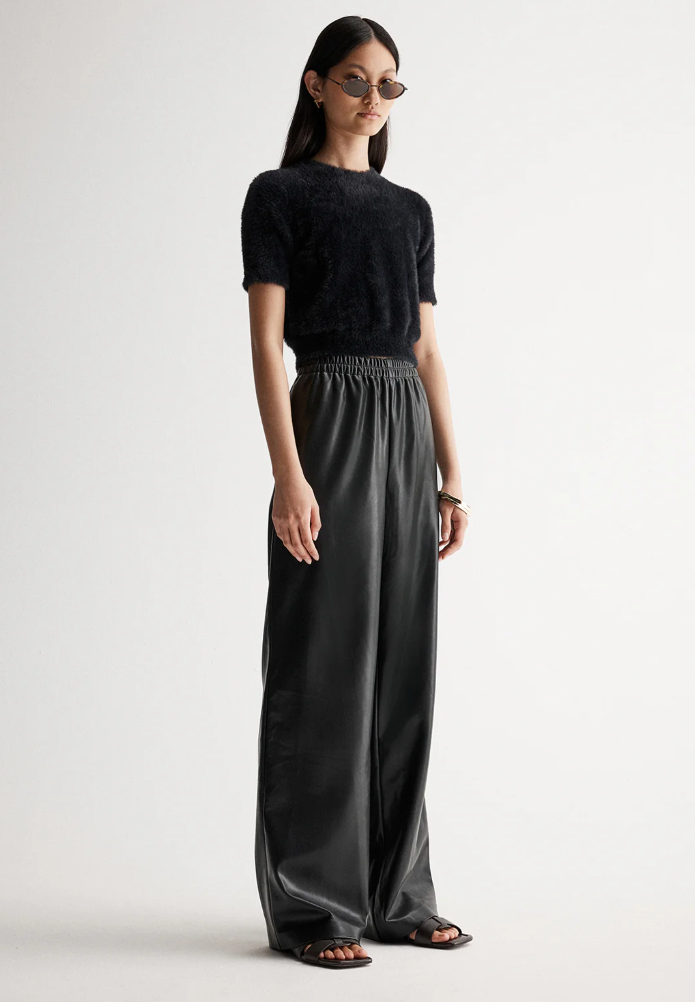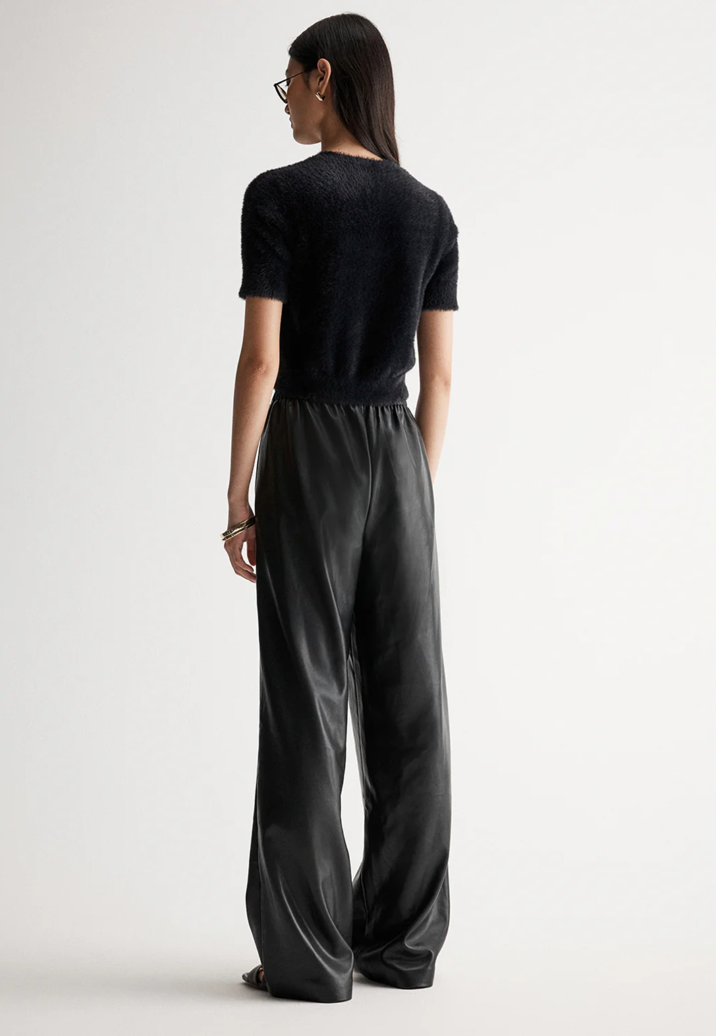 Transitioning into a new season signals the return of signature fabrics like our buttery vegan leather. The Valeria Pant reimagines this premium fabric in an all-new silhouette that offers effortless day to night outfitting. Cut to a full length, straight leg silhouette, these pants are fitted with an elastic waistband that adds a casual element to an otherwise refined wardrobe staple. Style with relaxed knitwear.