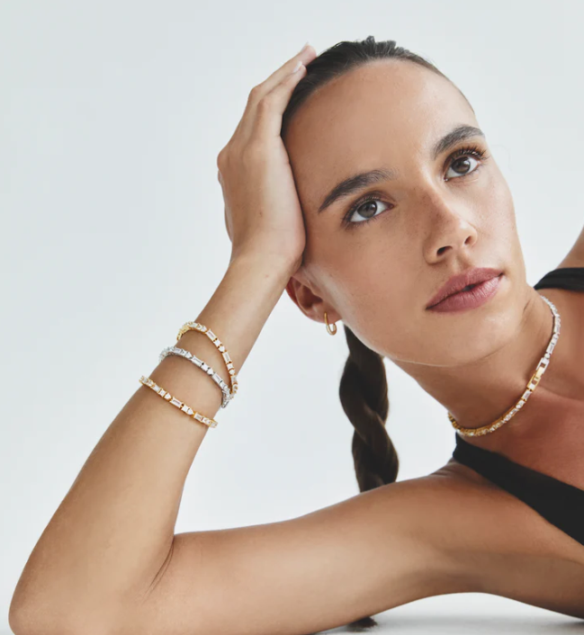 Inspired by the great tennis star Billie Jean King, this dazzling darling is a show-stopping stunner in our On Court collection. Starring cubic zirconia baguette cut gems interspaced by square and round cut beauties. Love-one.
