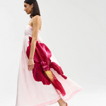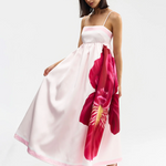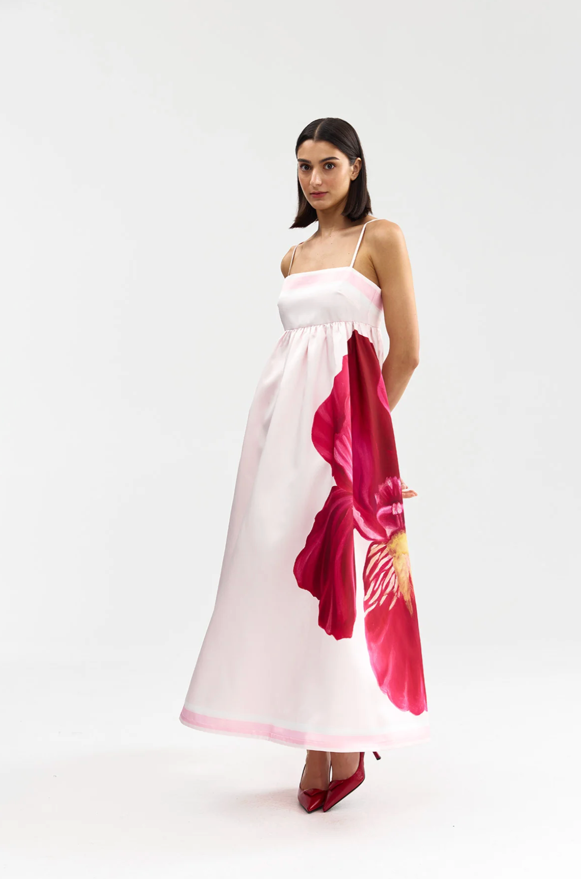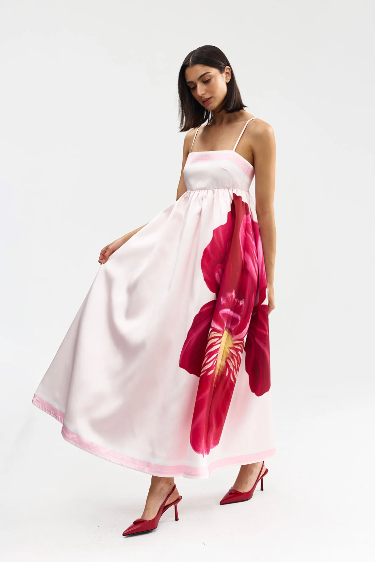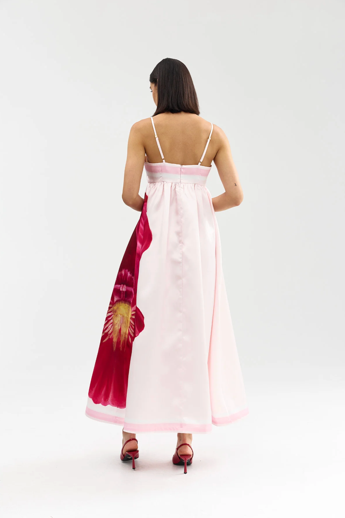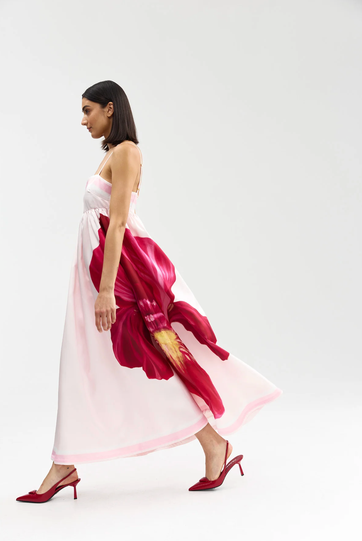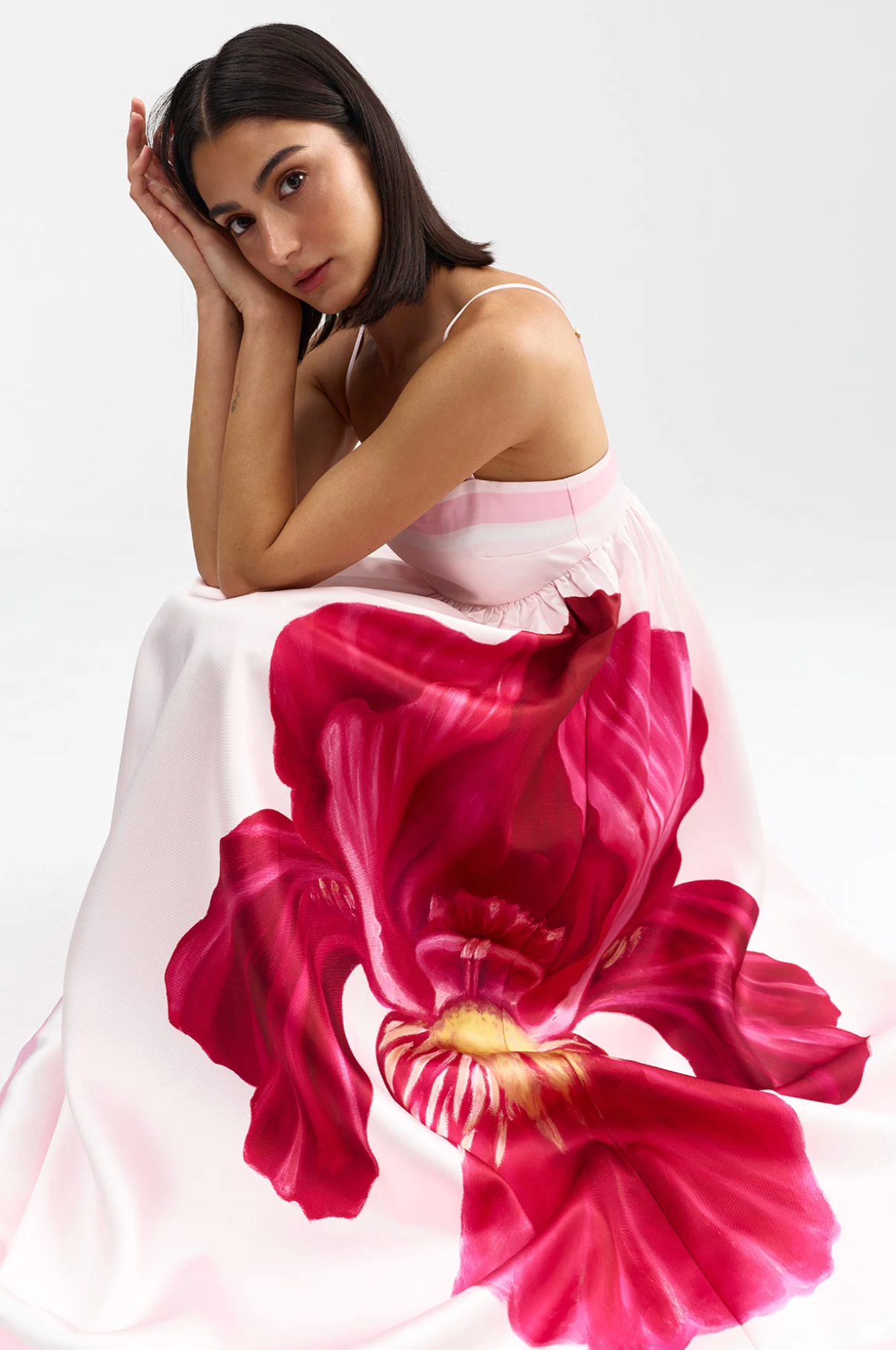The Delphine Gown in Fairy Iris features a hand painted Iris floral print alongside a pink striped bodice and hemline. This dress flows gracefully from the waist for a flattering silhouette, designed to float with every step.