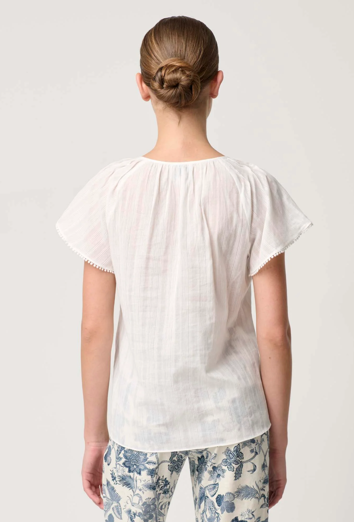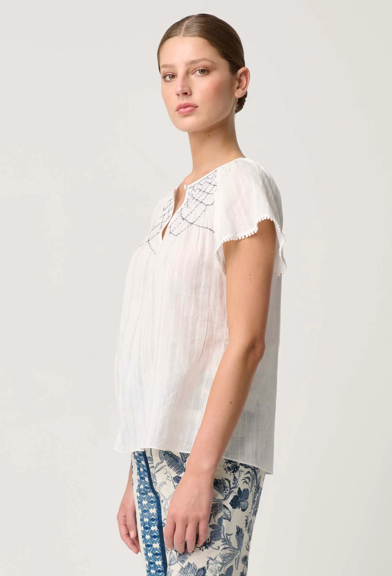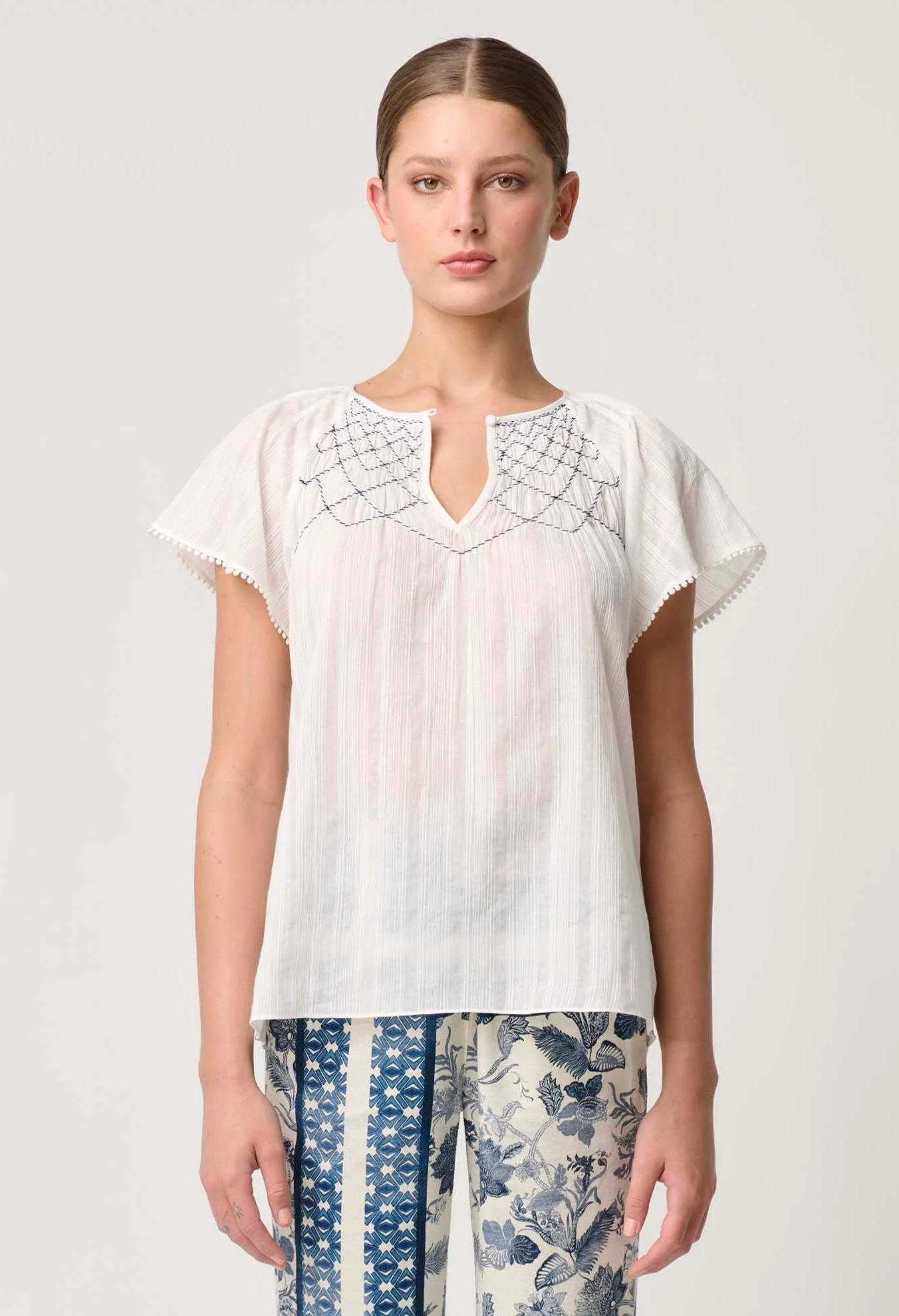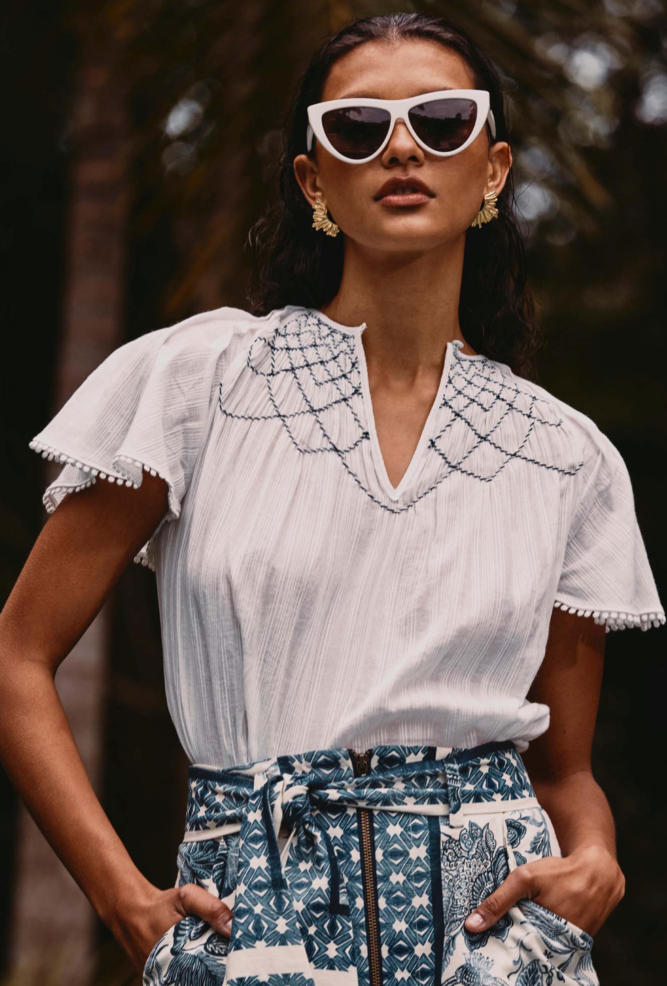 Introducing the St Lucia Cotton Self Stripe Smocked Top in Ivory, a timeless addition to your wardrobe that combines delicate details with casual sophistication. Crafted from a breathable cotton self-stripe fabric, this top showcases intricate embroidery that adds a touch of elegance. The lace trim on the sleeves enhances its feminine appeal, while the keyhole opening provides a subtle, refined finish. Whether paired with tailored pants for an elevated look or worn with jeans for a laid-back vibe, the St Lucia Smocked Top offers versatile styling and effortless charm, perfect for any occasion.