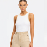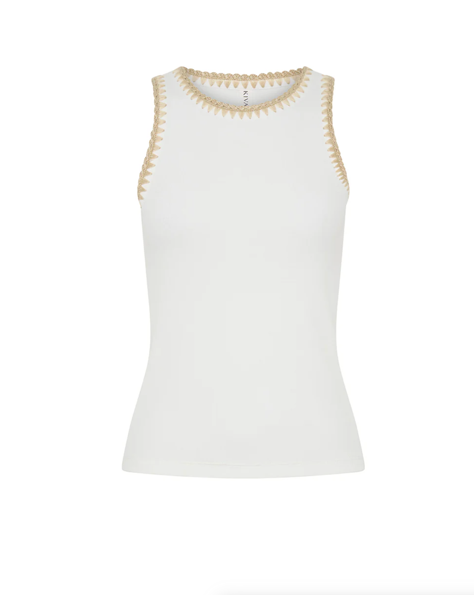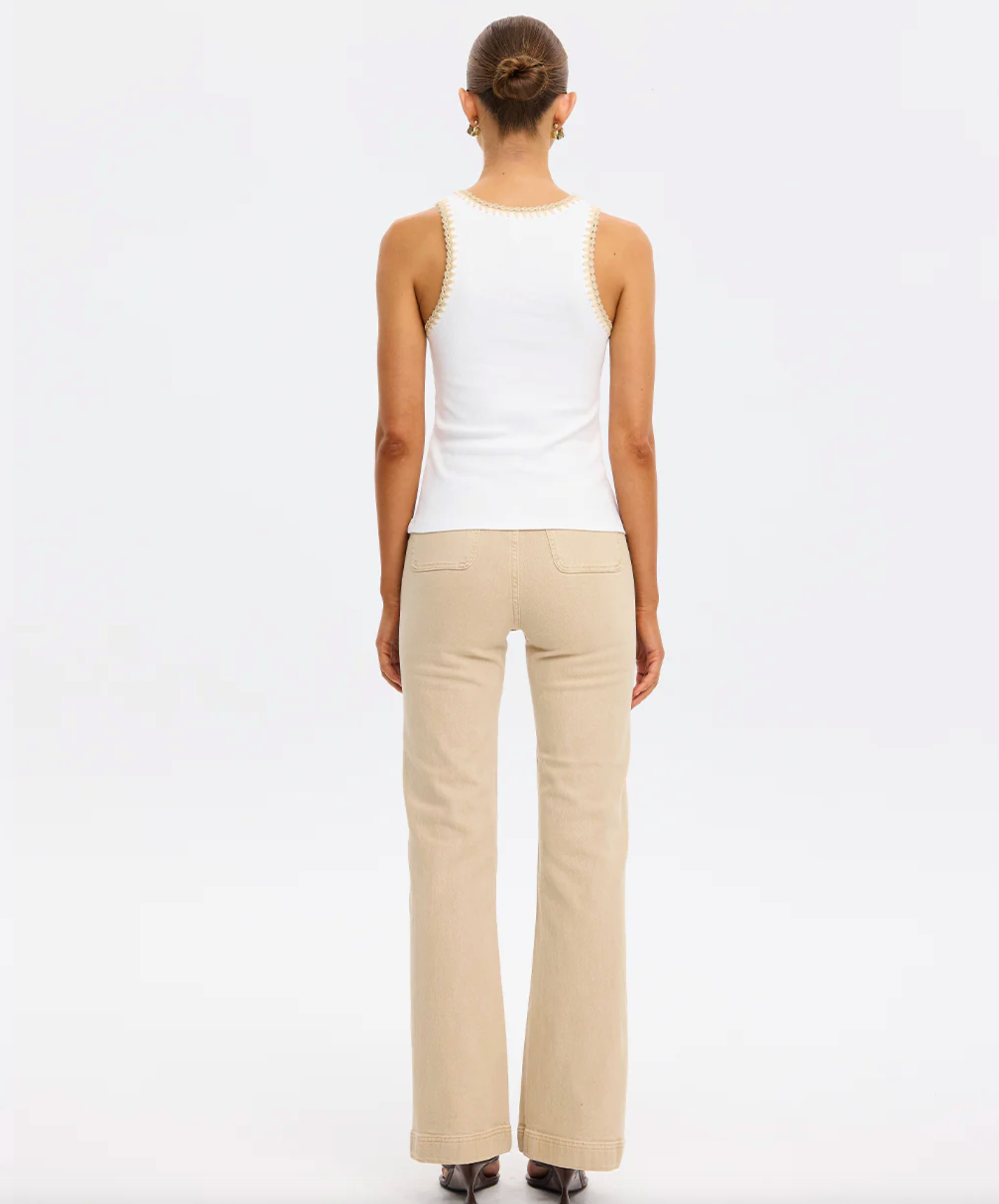 A modern essential, our signature Tallulah Spliced Tank is cut from a premium rib knit featuring a high neckline accented with contrast tan, hand-crocheted detailing adding an artisanal touch. Wear with denim or linen separates for easy daytime dressing, or elevate with tailored pants and sandals for a refined, minimalist look.