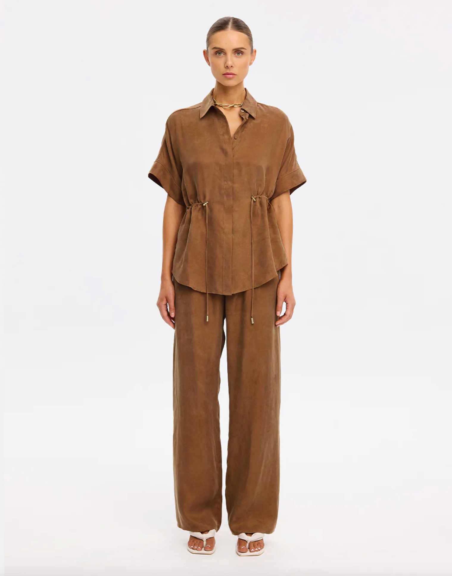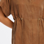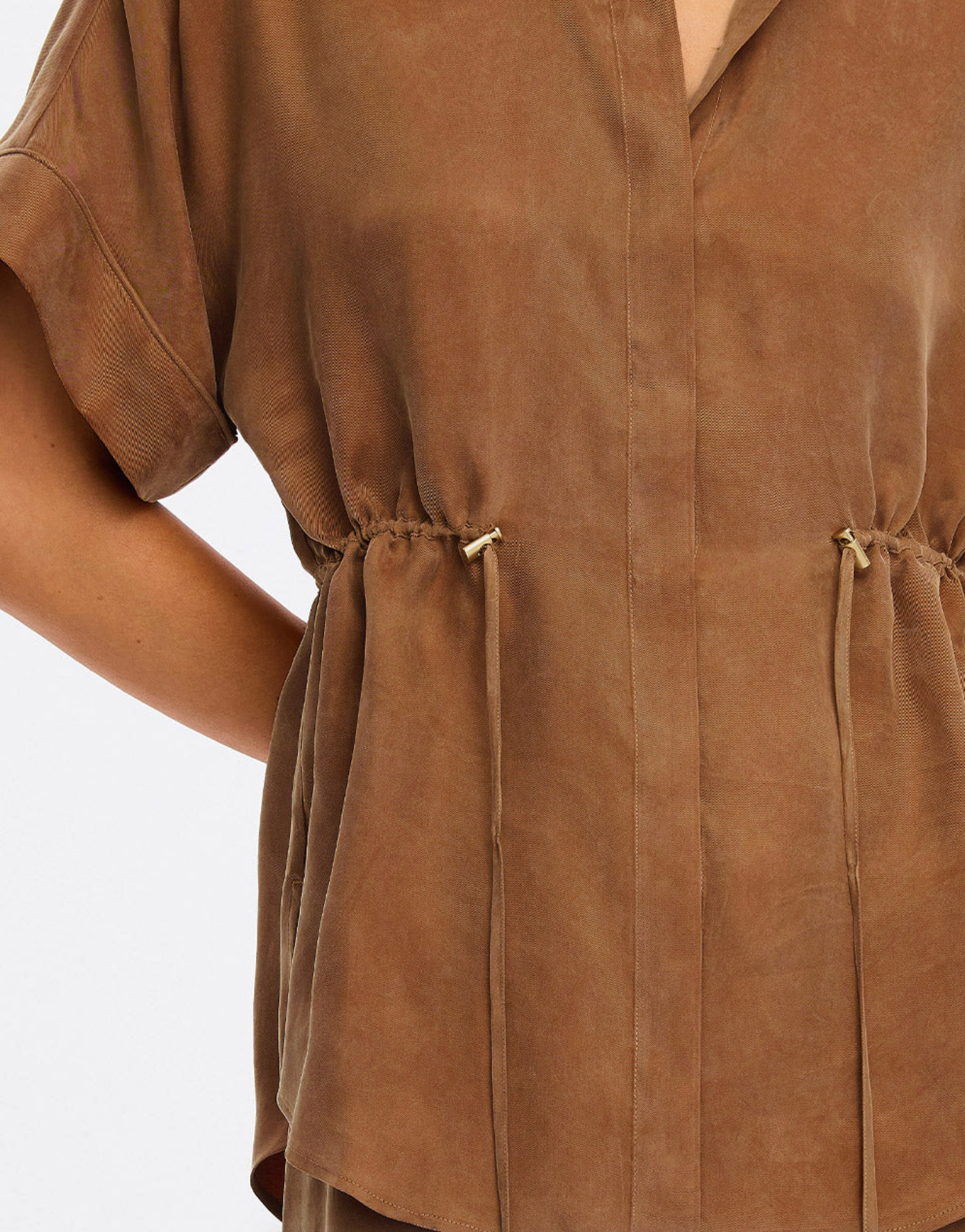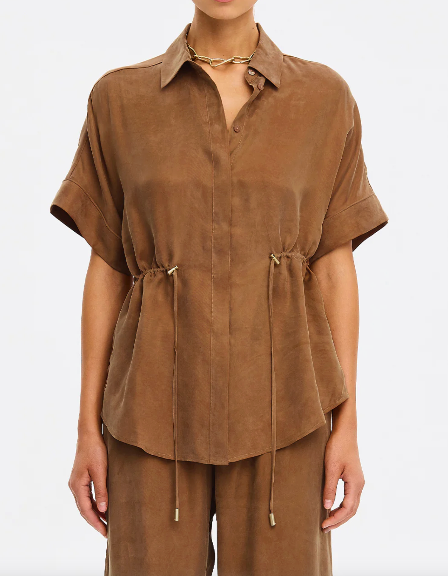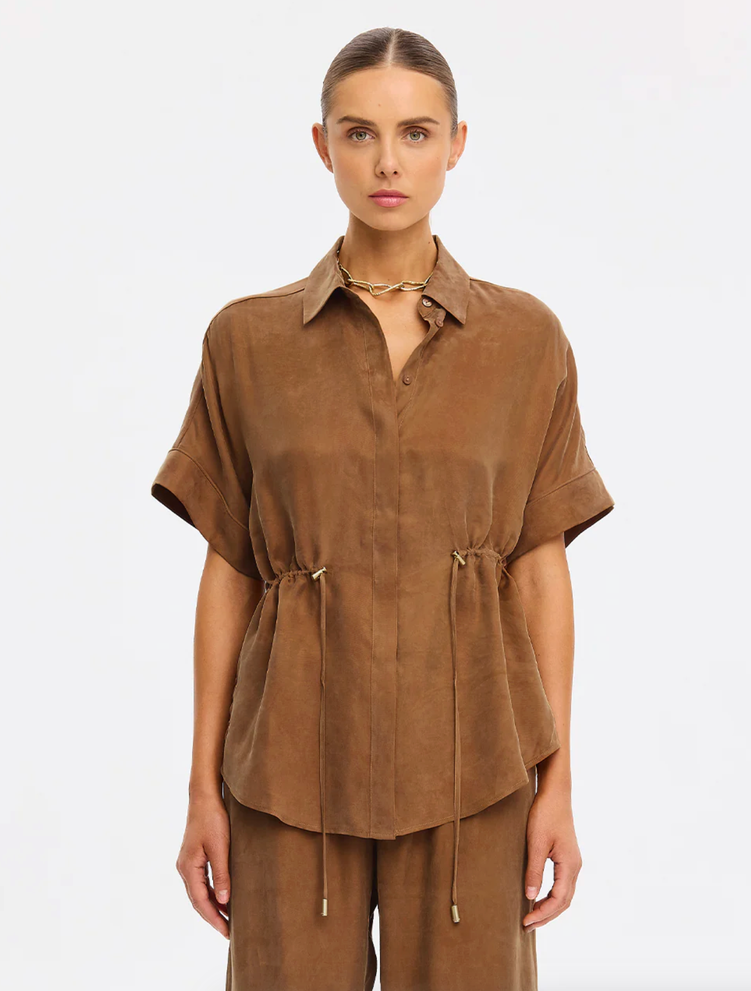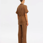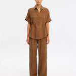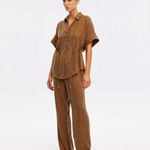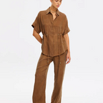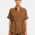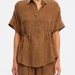 The Jaxon Top in chocolate brown is a relaxed silhouette featuring short sleeves and a concealed button-down front, complete with adjustable drawcords at the waist for a softly defined shape. Designed for ease and versatility, it blends relaxed tailoring with refined simplicity. Style with the matching Blythe Pant for a coordinated look, or pair with denim for effortless everyday wear.