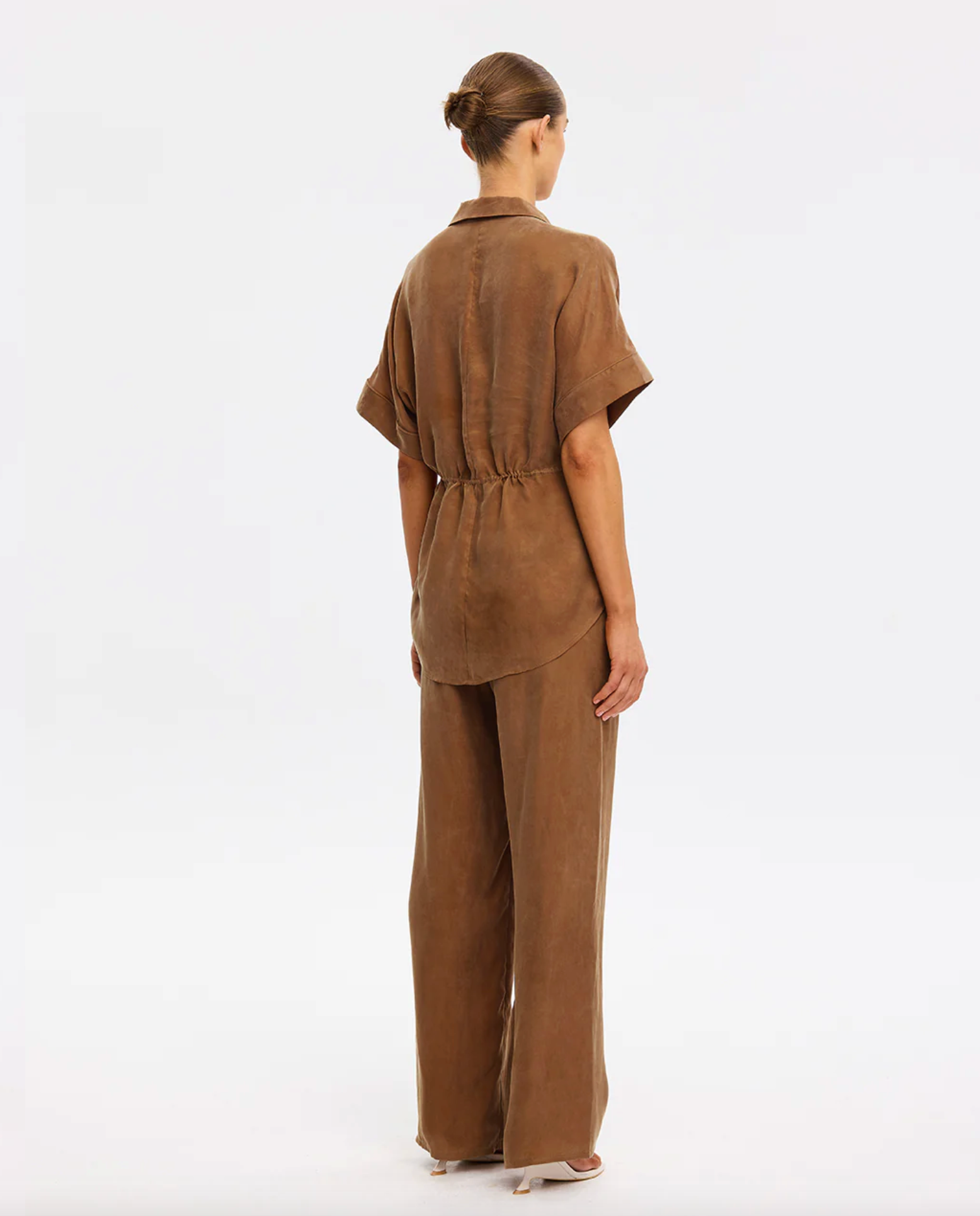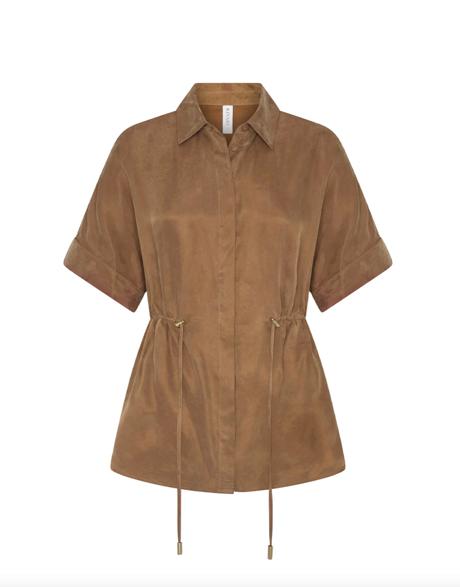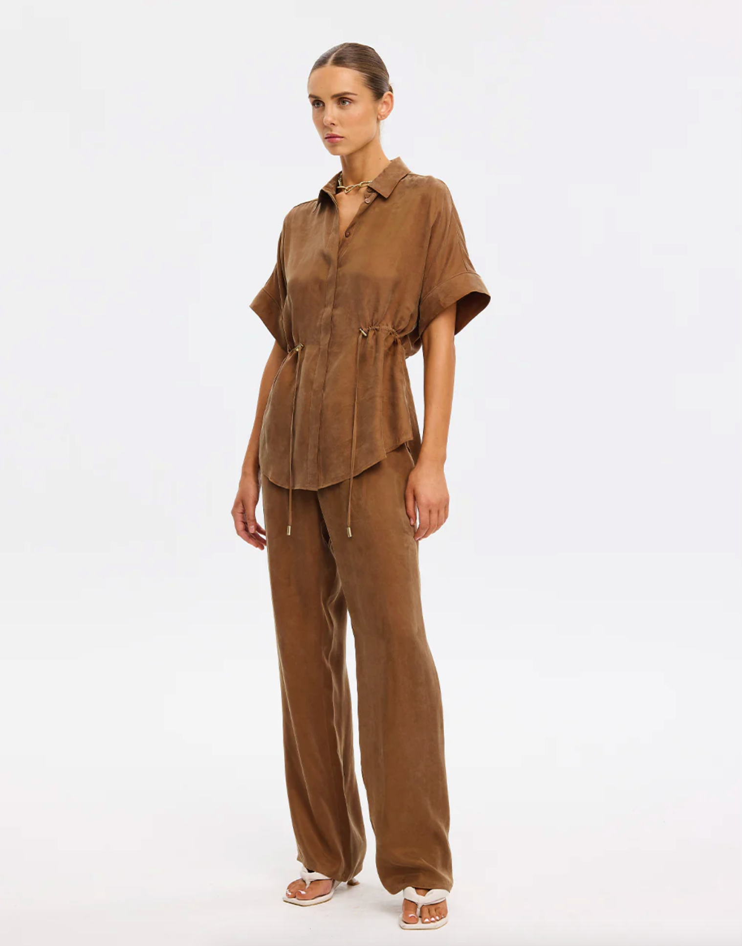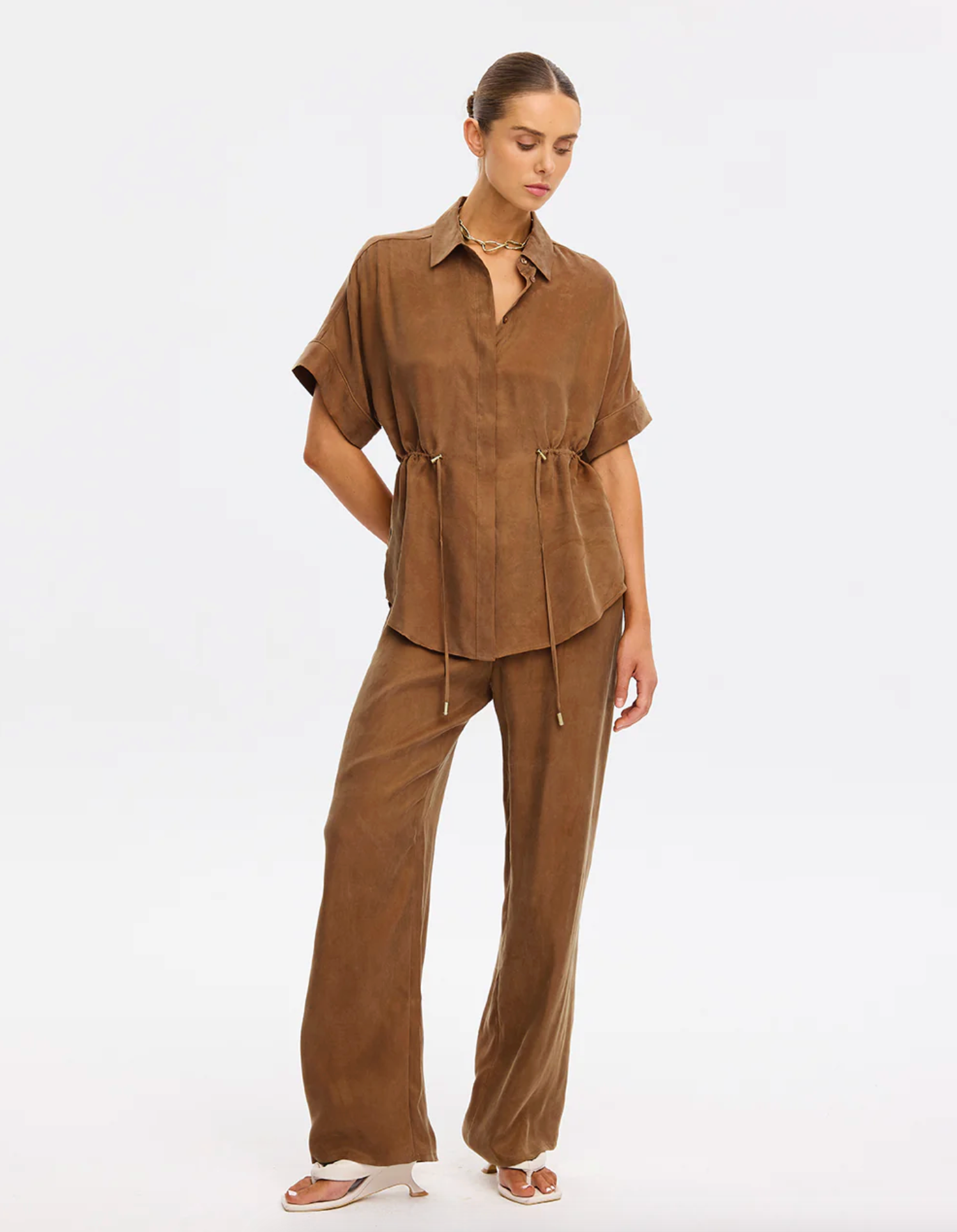 The Jaxon Top in chocolate brown is a relaxed silhouette featuring short sleeves and a concealed button-down front, complete with adjustable drawcords at the waist for a softly defined shape. Designed for ease and versatility, it blends relaxed tailoring with refined simplicity. Style with the matching Blythe Pant for a coordinated look, or pair with denim for effortless everyday wear.