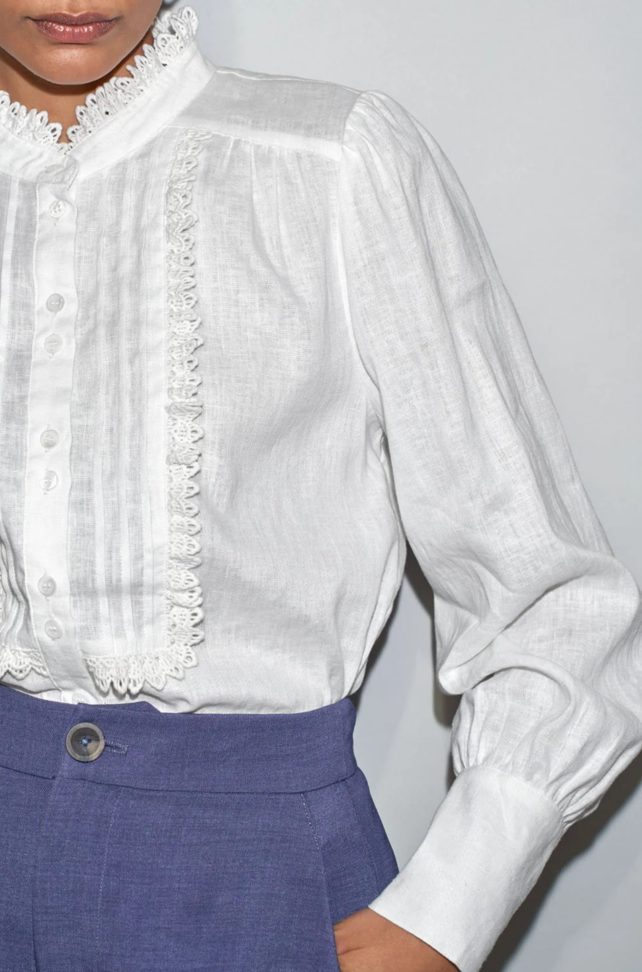 - lace-trimmed bib frames the bodice with subtle femininity