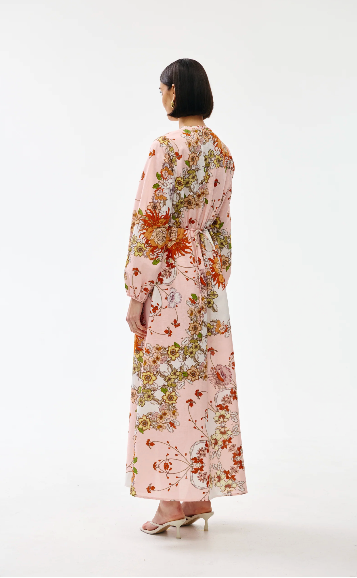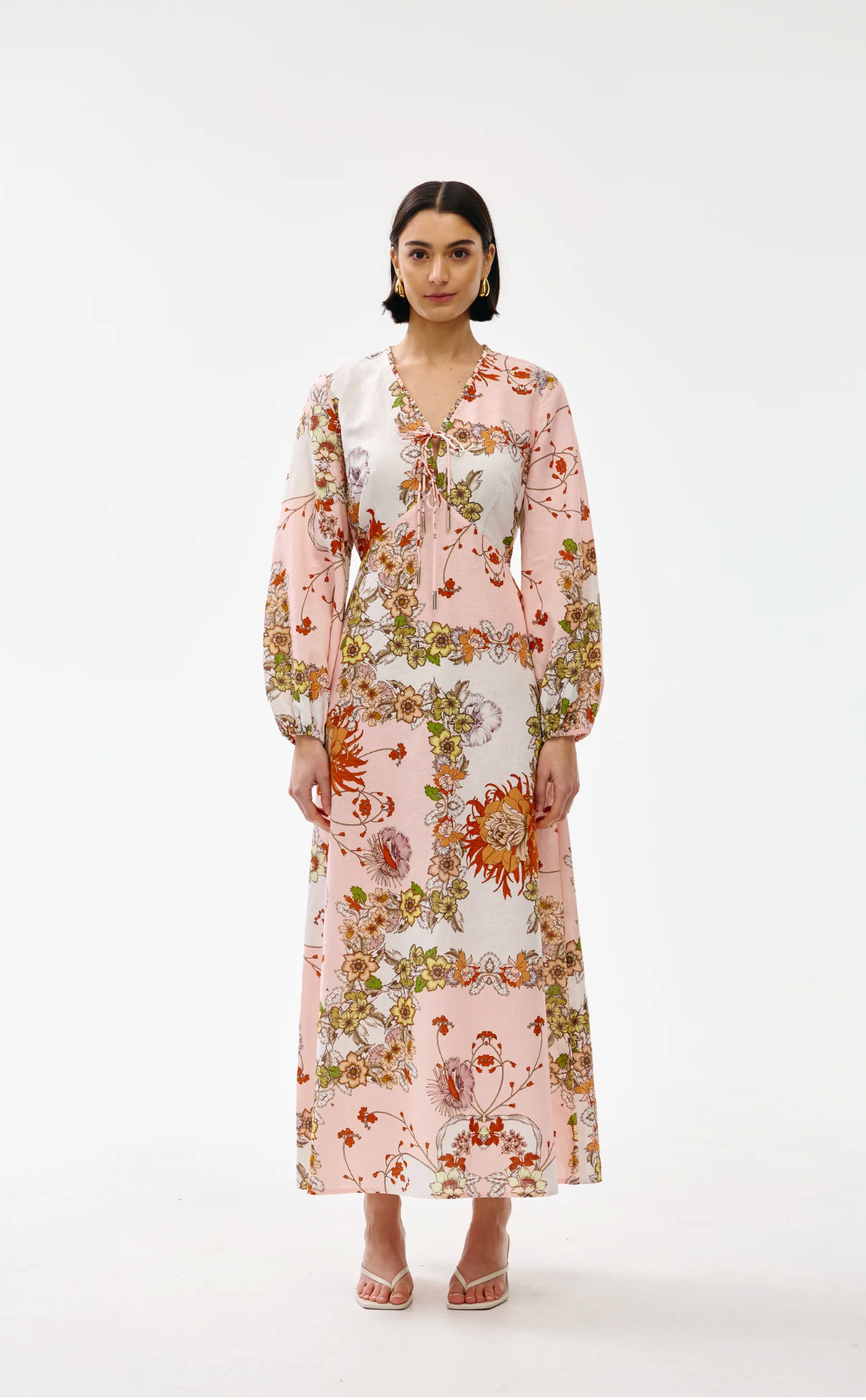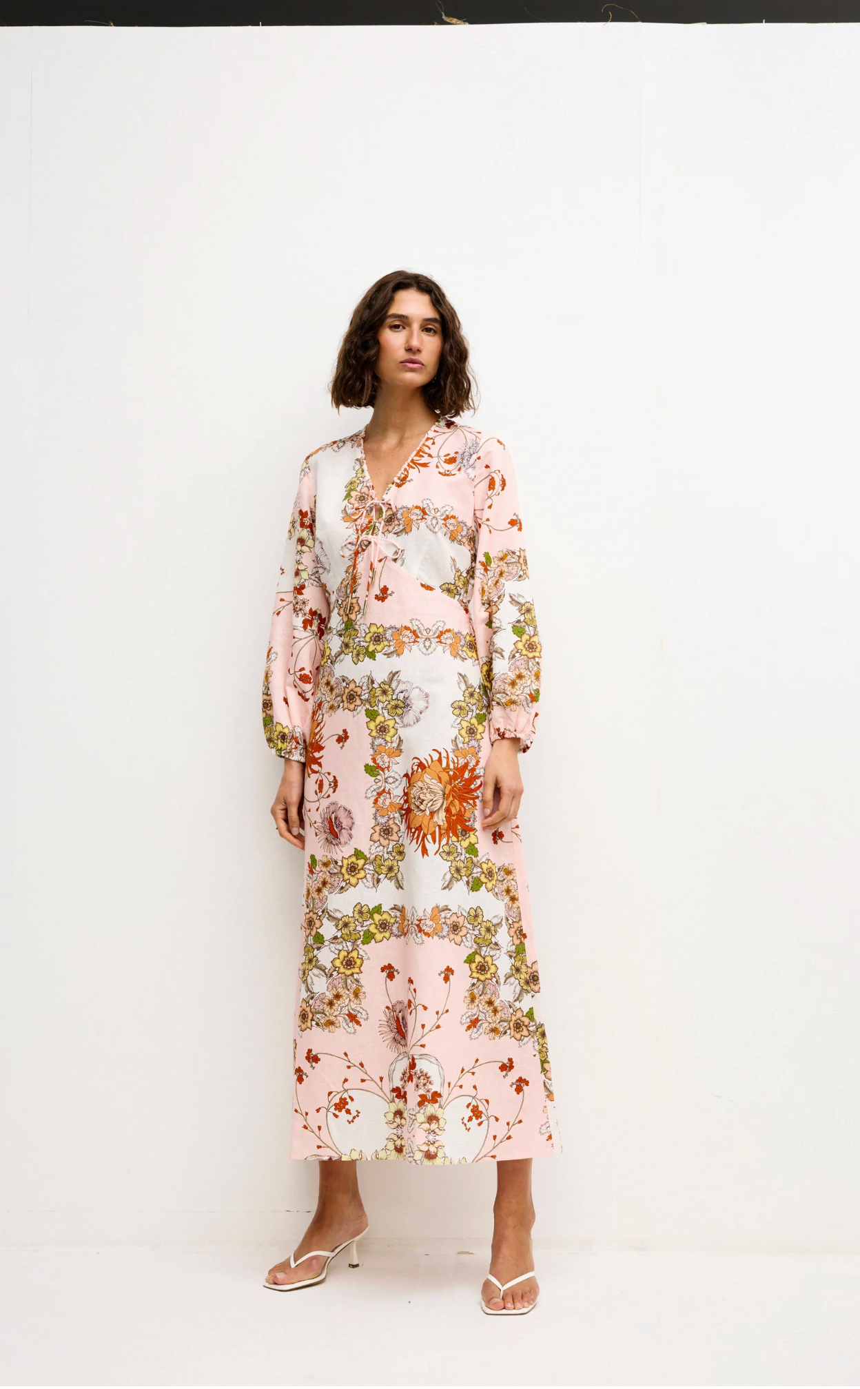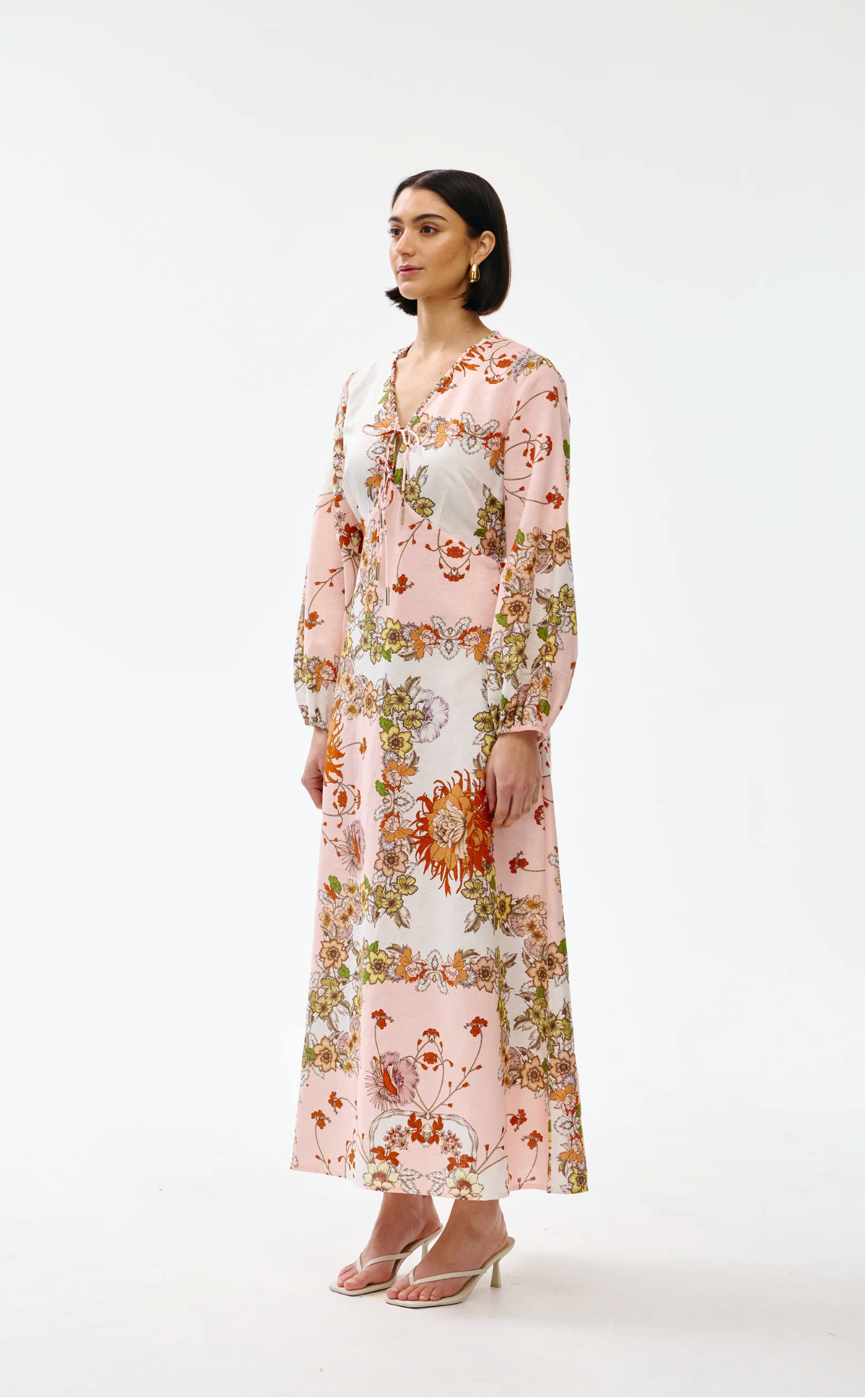 Crafted from lightweight, breathable fabric, this full-length dress features a delicate V-neckline with lightly ruffled detail, in-seam pockets, drawstring ties and voluminous long sleeves.