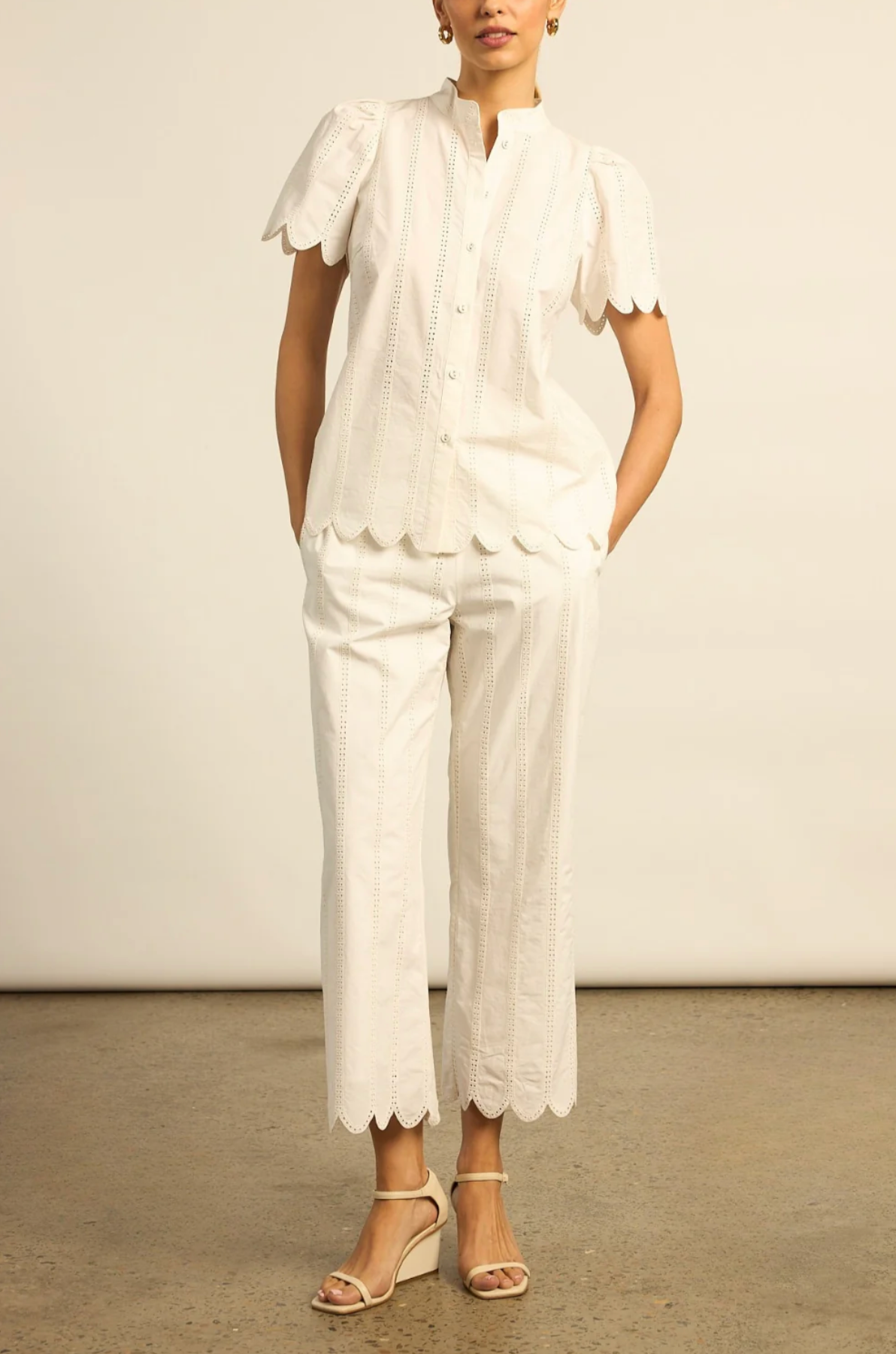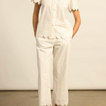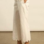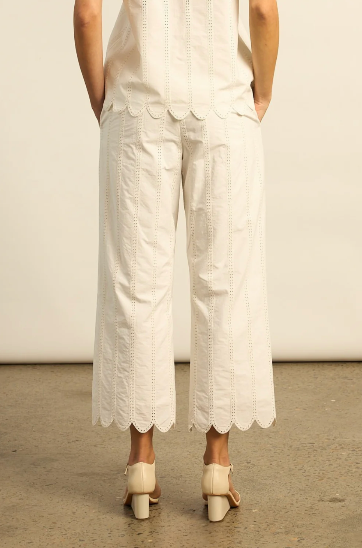 crafted in 100% cotton poplin, the 'harbour pant' from zoe kratzmann is elevated with custom ladder-lace embroidery that flows into a scalloped cropped hem. a neat, flat waistband creates a clean and tailored fit, balancing femininity with structure. designed for versatility, it pairs seamlessly with the pier top for a french-inspired set that feels timeless and modern.