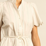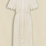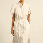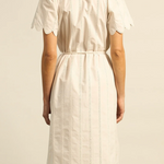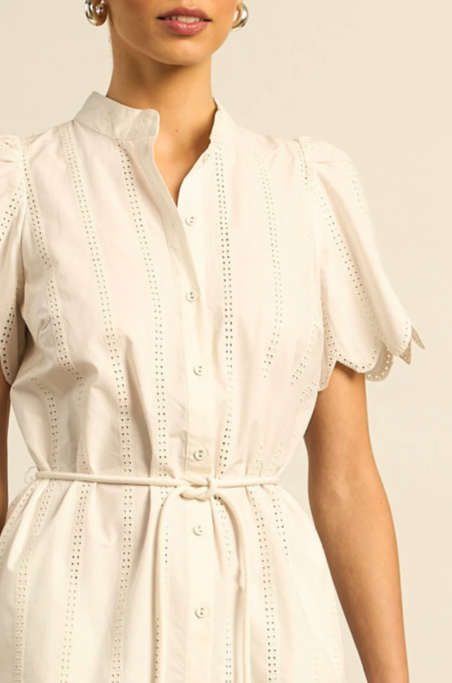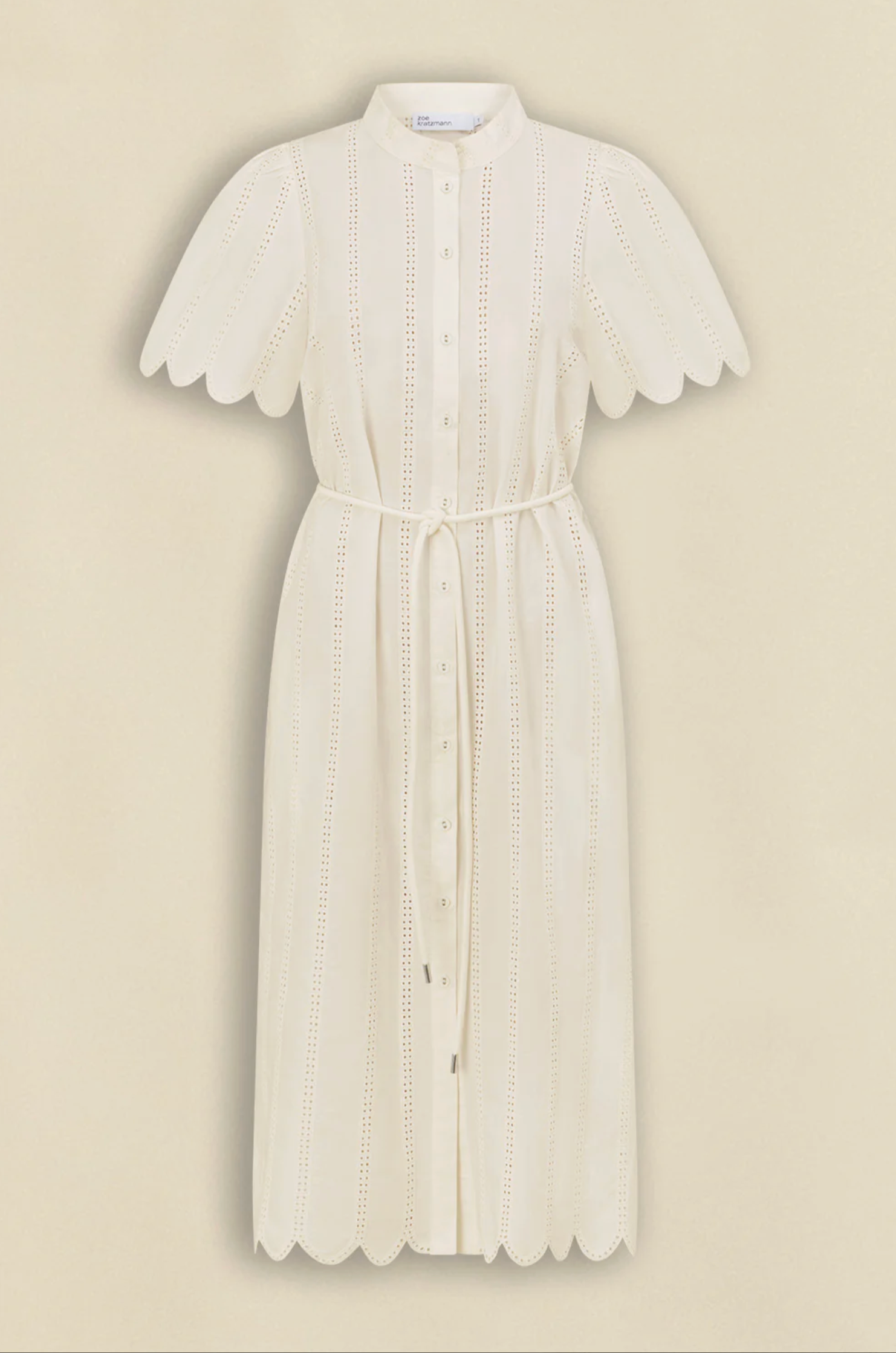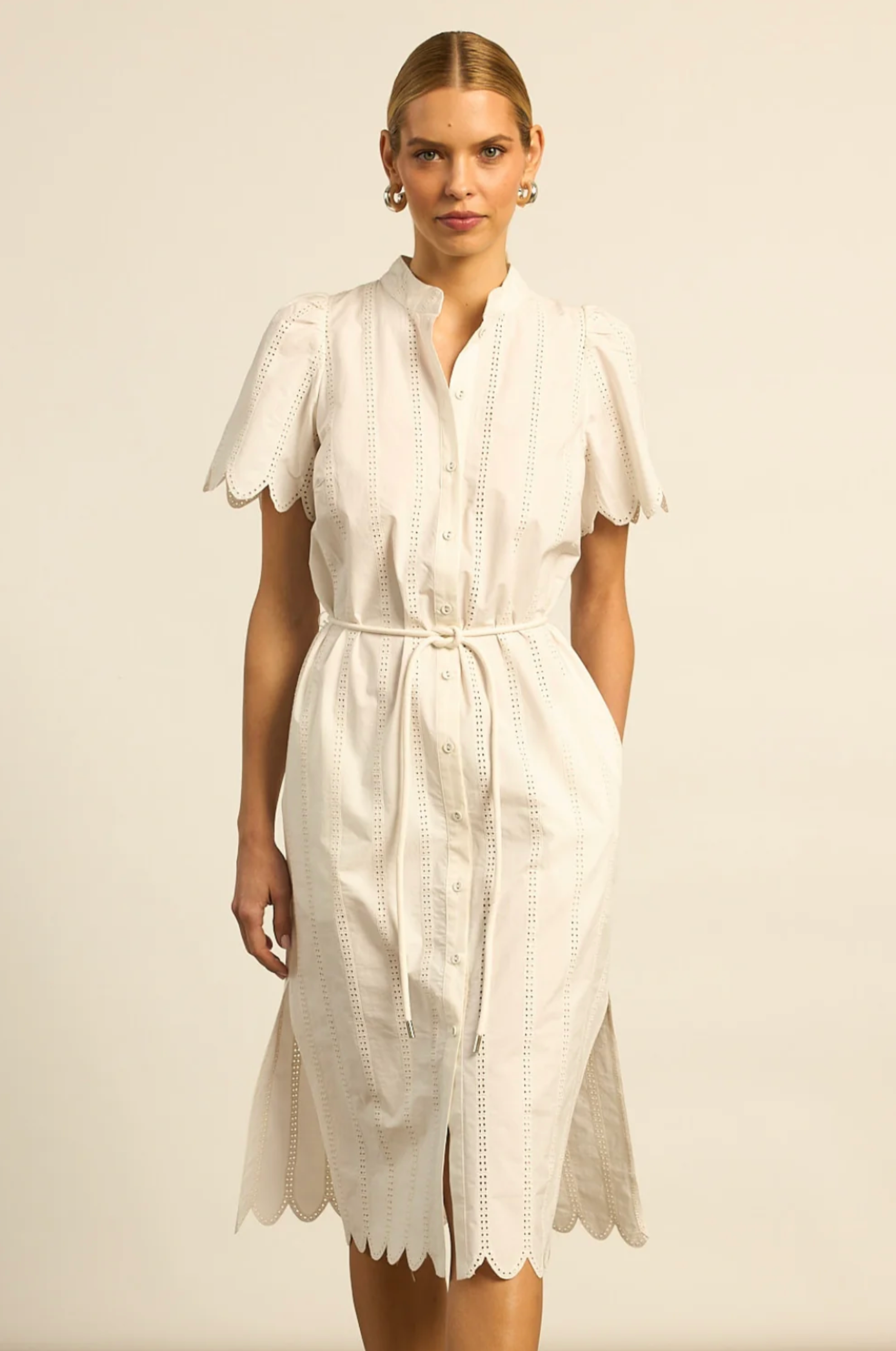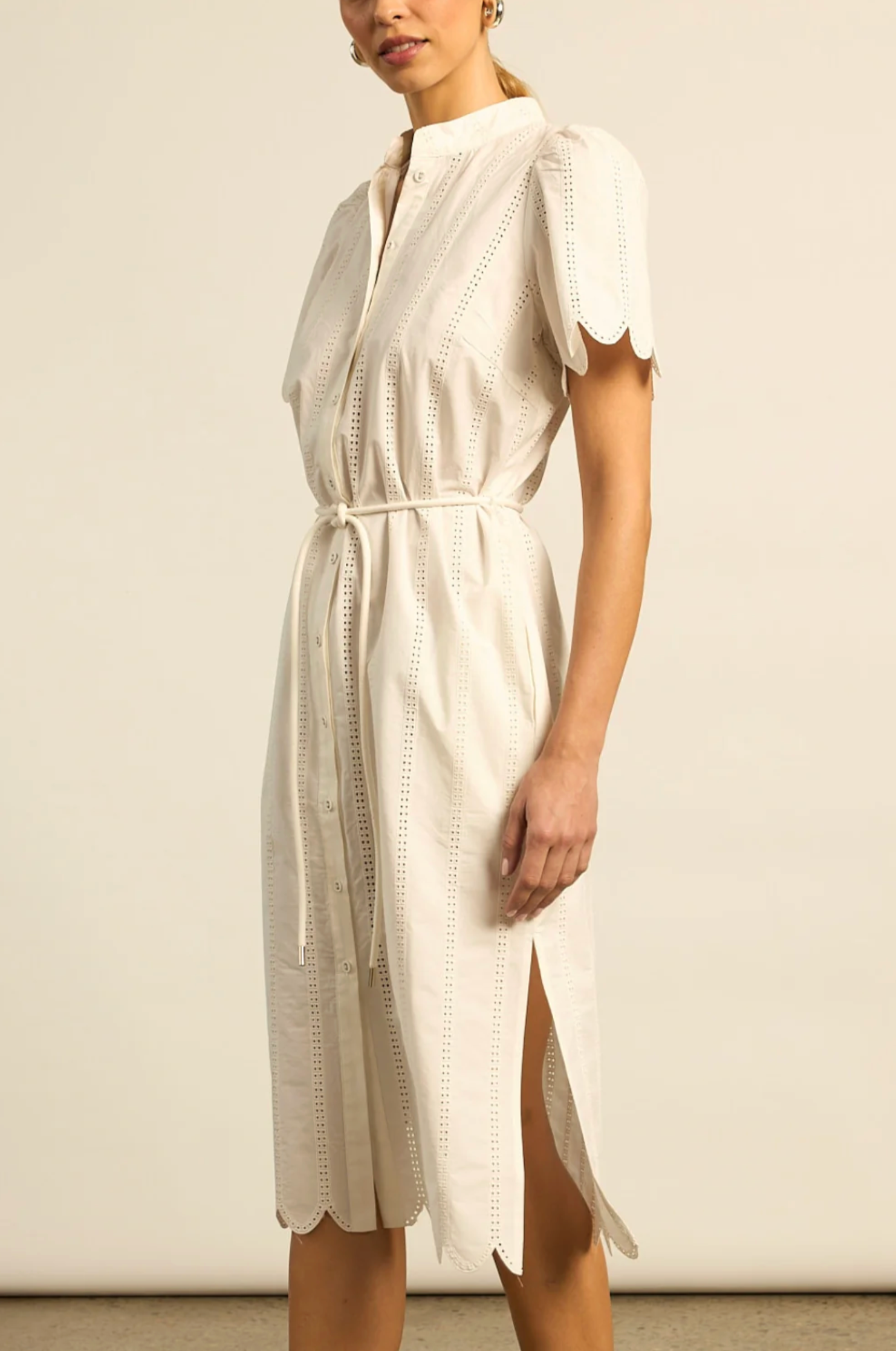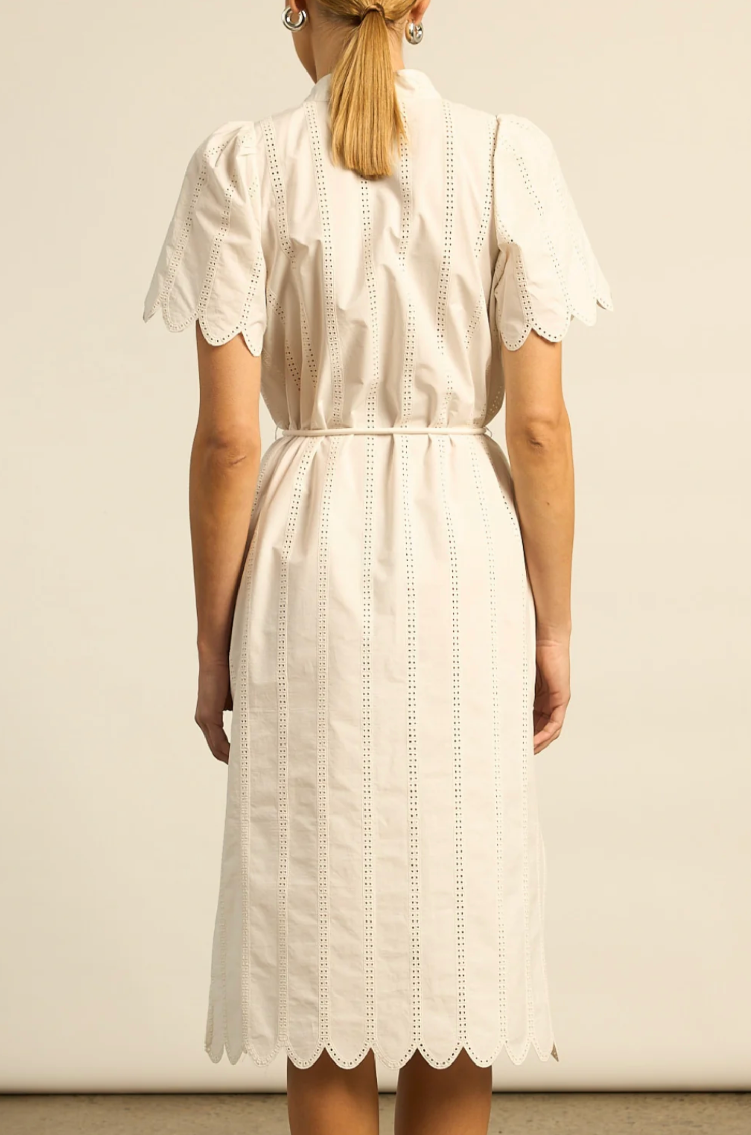 crafted in cotton poplin broderie, the portside dress is shaped with precision. linear broderie creates a modern and flattering aesthetic. a scalloped hem and cuffs add refinement and versatility.