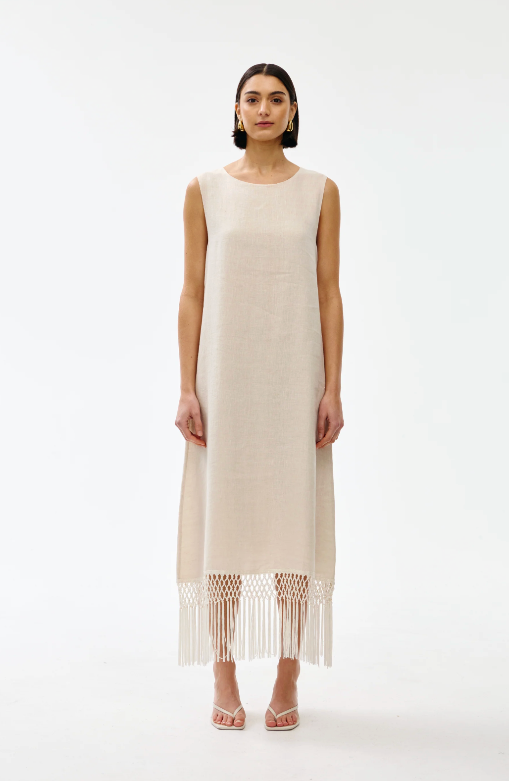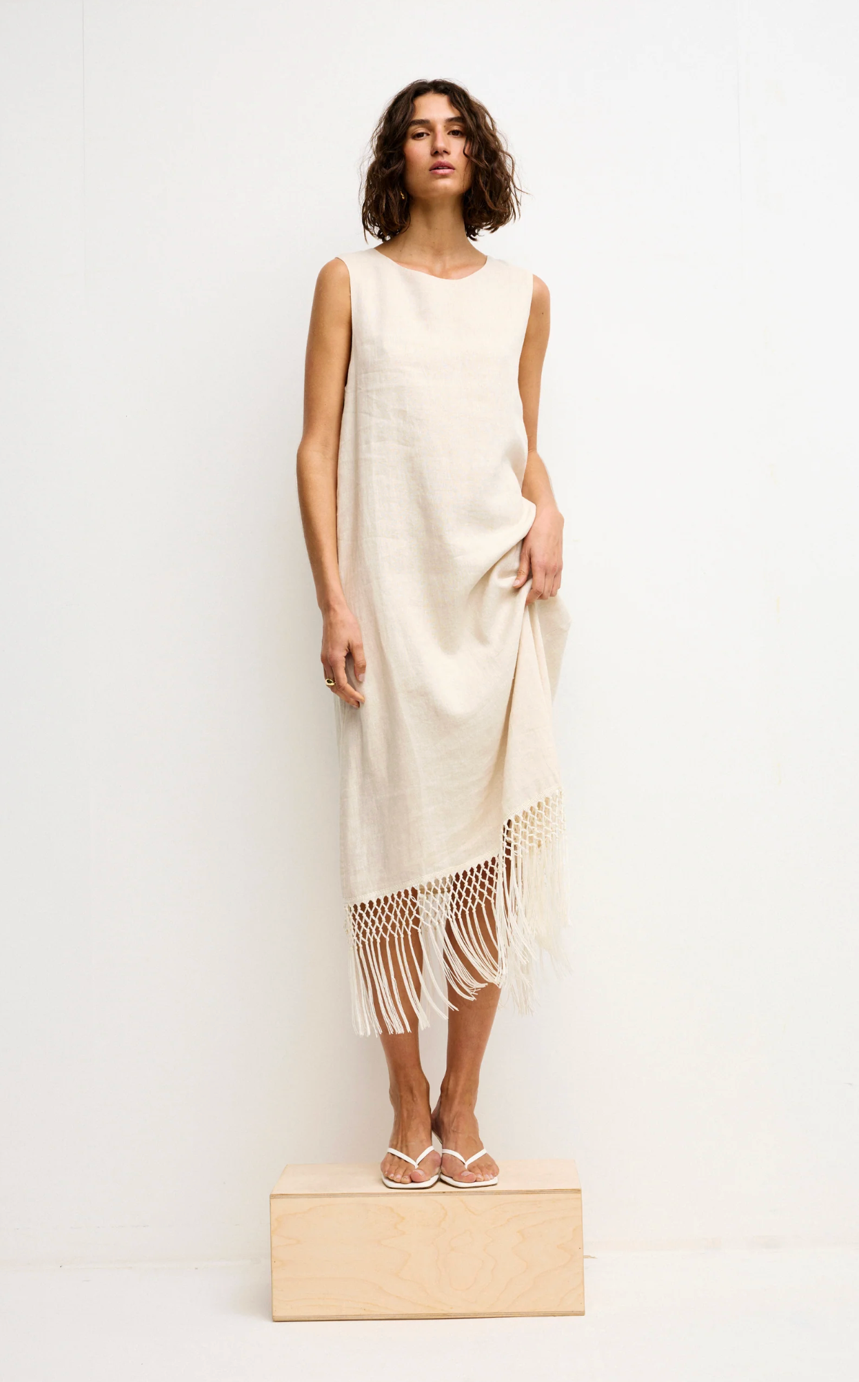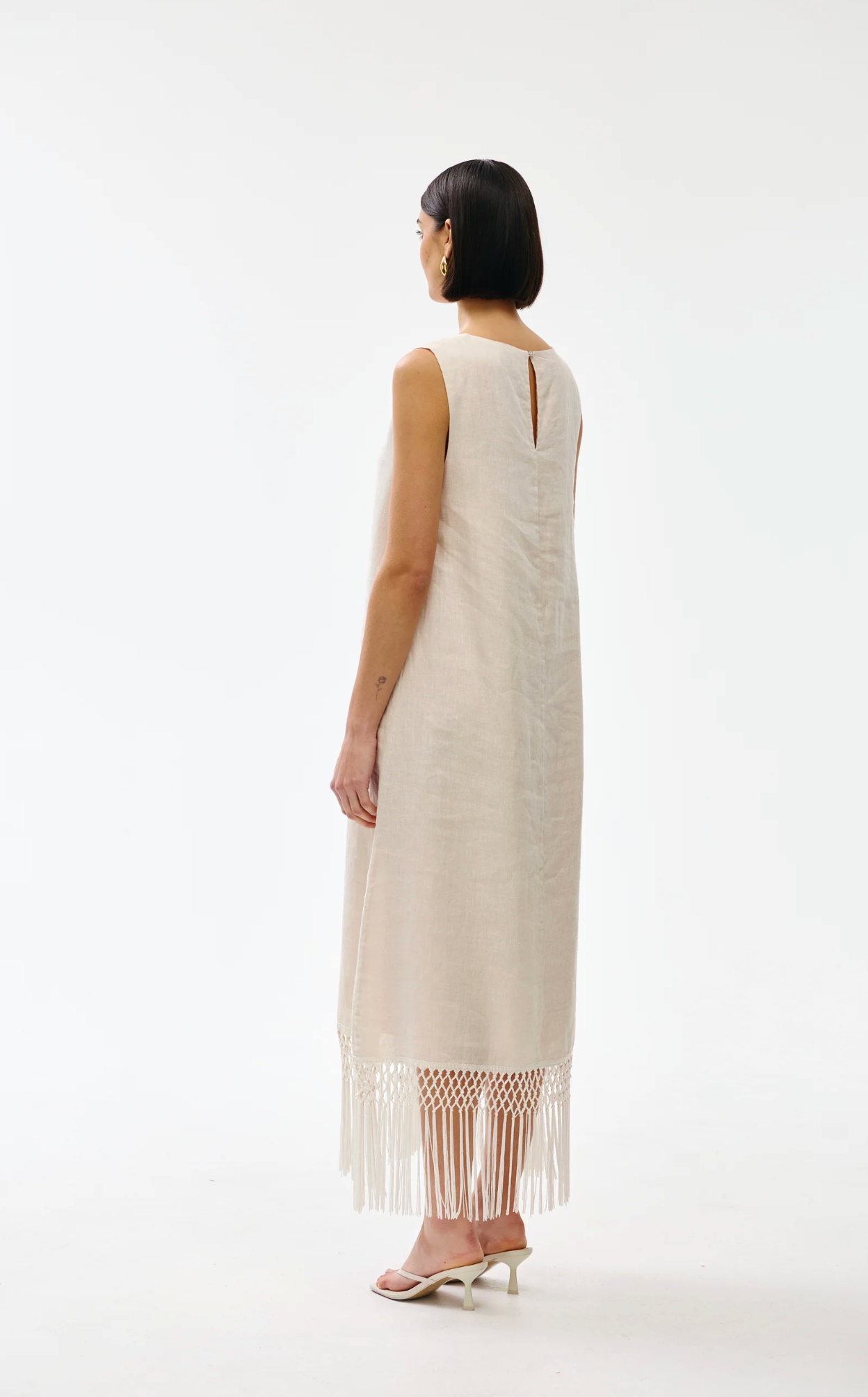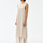 Crafted from a breathable, linen fabric, this sleeveless midi dress features a relaxed silhouette that drapes beautifully on the body. The minimalist design is elevated with a beautiful macramé look fringed hem, adding a touch of charm and movement to each step.