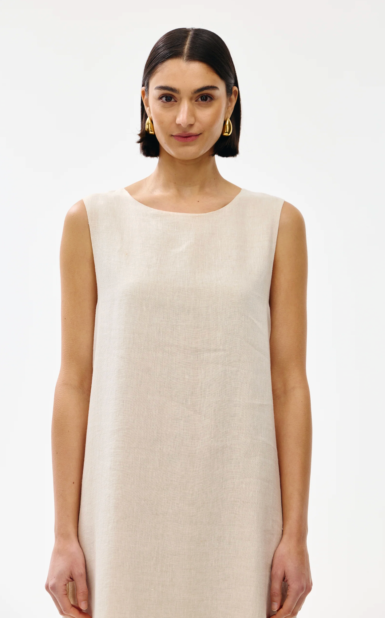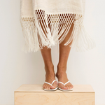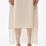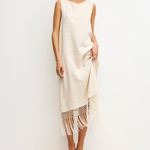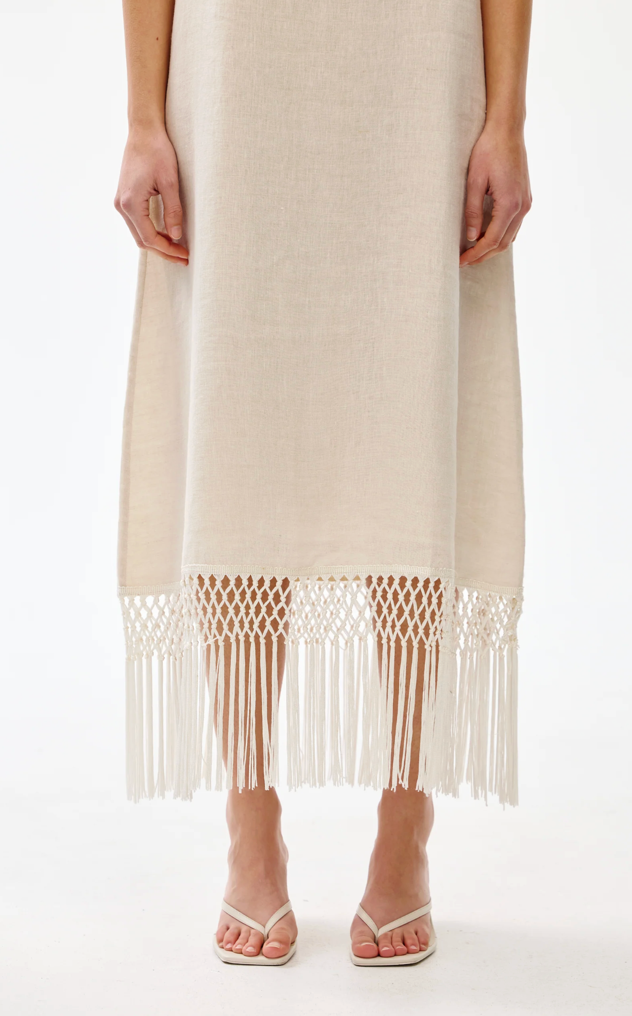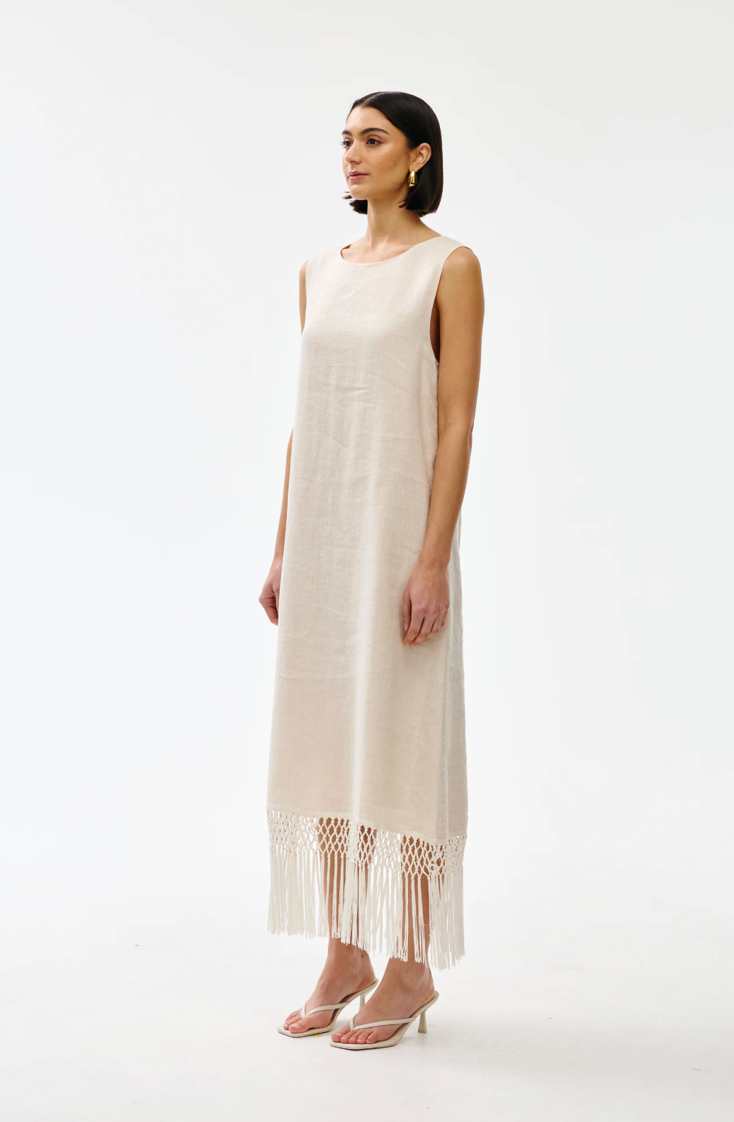 Crafted from a breathable, linen fabric, this sleeveless midi dress features a relaxed silhouette that drapes beautifully on the body. The minimalist design is elevated with a beautiful macramé look fringed hem, adding a touch of charm and movement to each step.