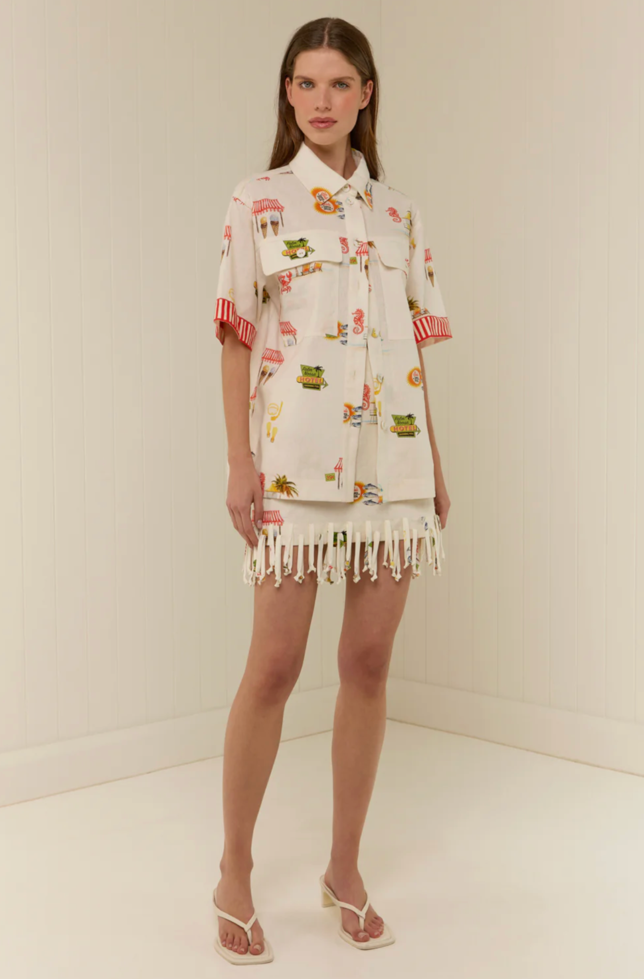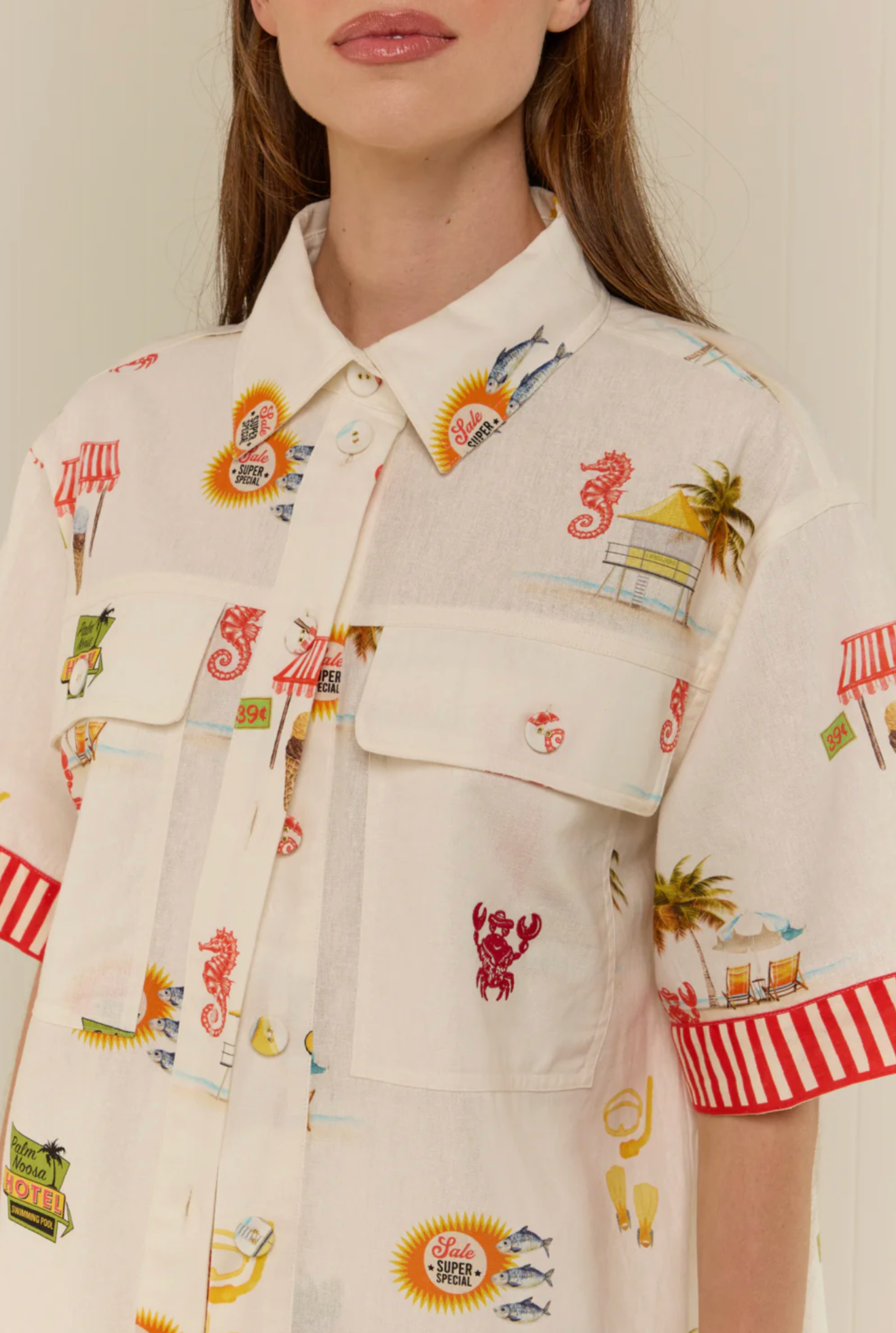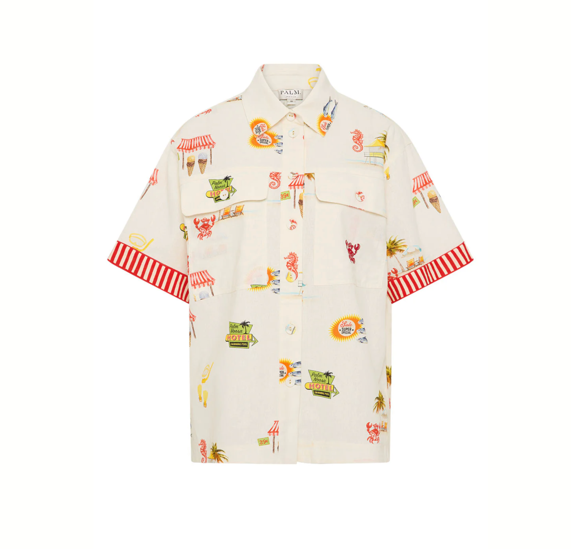 The Alto Shirt in our exclusive Tropicana print is a shirt silhouette crafted from a premium Linen blend. The Alto Shirt is designed to be an oversized boxy fit, featuring statement pockets, contrast border detailing and an embroidered pocket design element. Pair back with our Tropicana Skirt for a matching set. Please refer to our size and fit guide for further fit details.