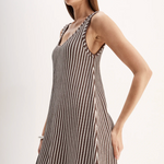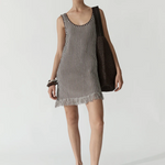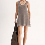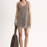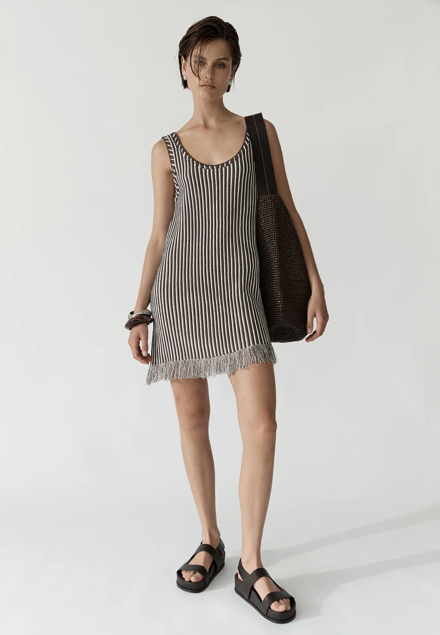 The Alessandra Mini Dress is made of a soft, luxe stripe knit fabric with a delicate fringe hem. Designed for elevated casual outfitting, this dress can be layered under oversized cotton shirts.