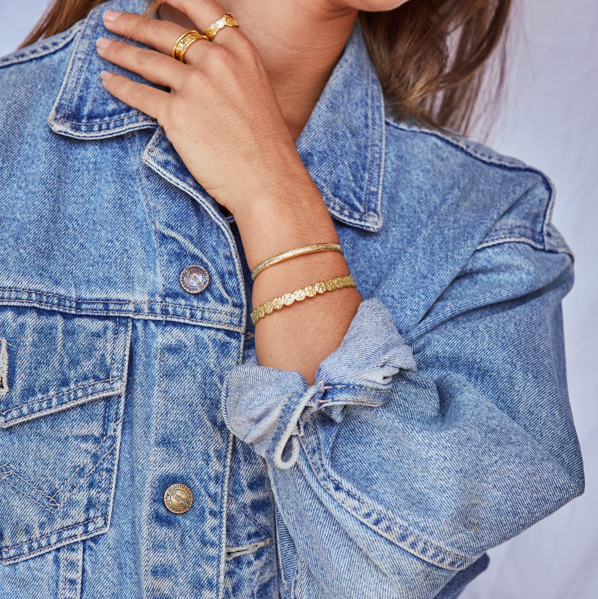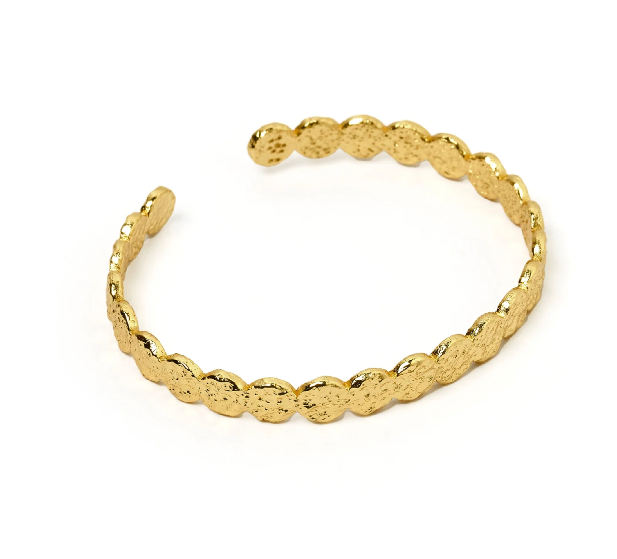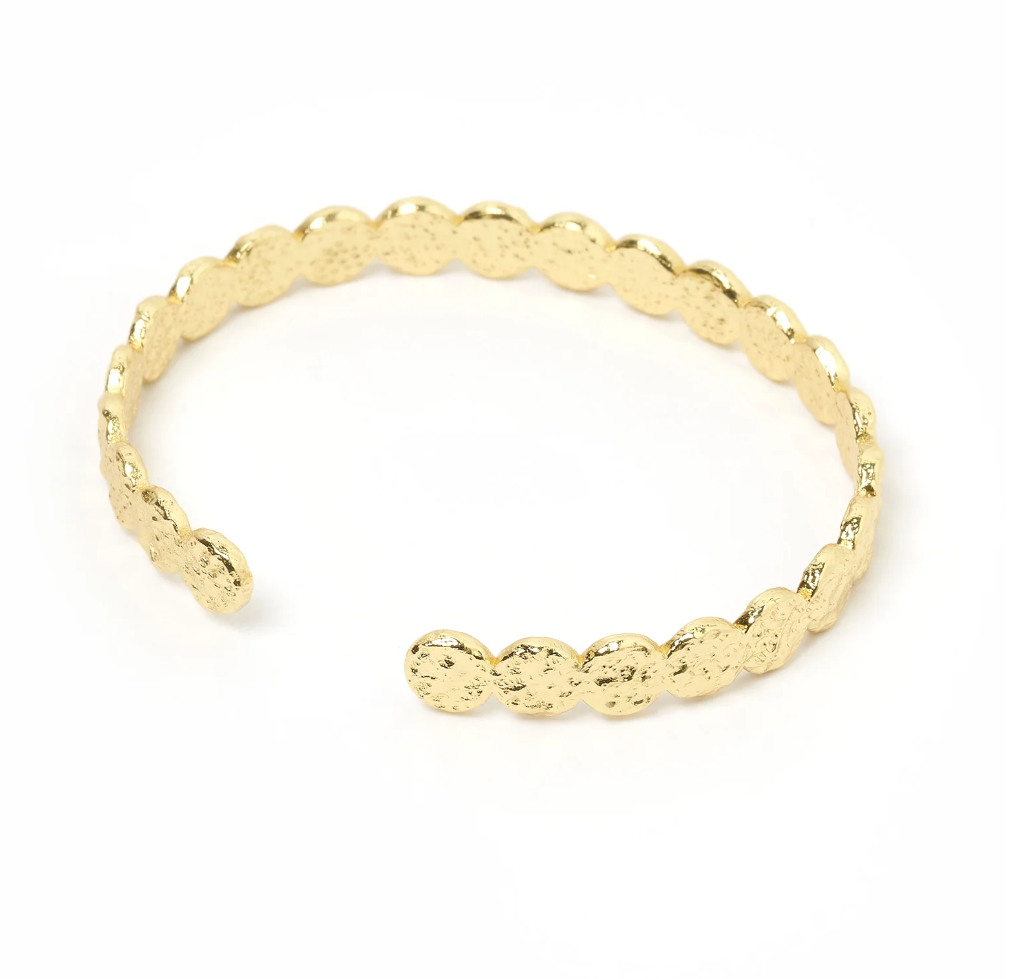 From ring to cuff, the Olsen story continues! With its unique crushed gold discs coming together in a malleable cuff to fit all, this bracelet will be the final touch adding to the outfit of your dreams.