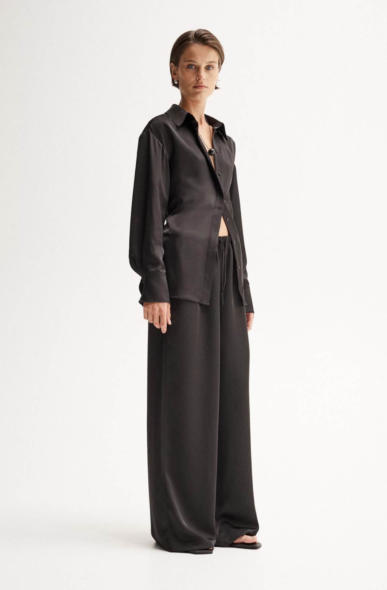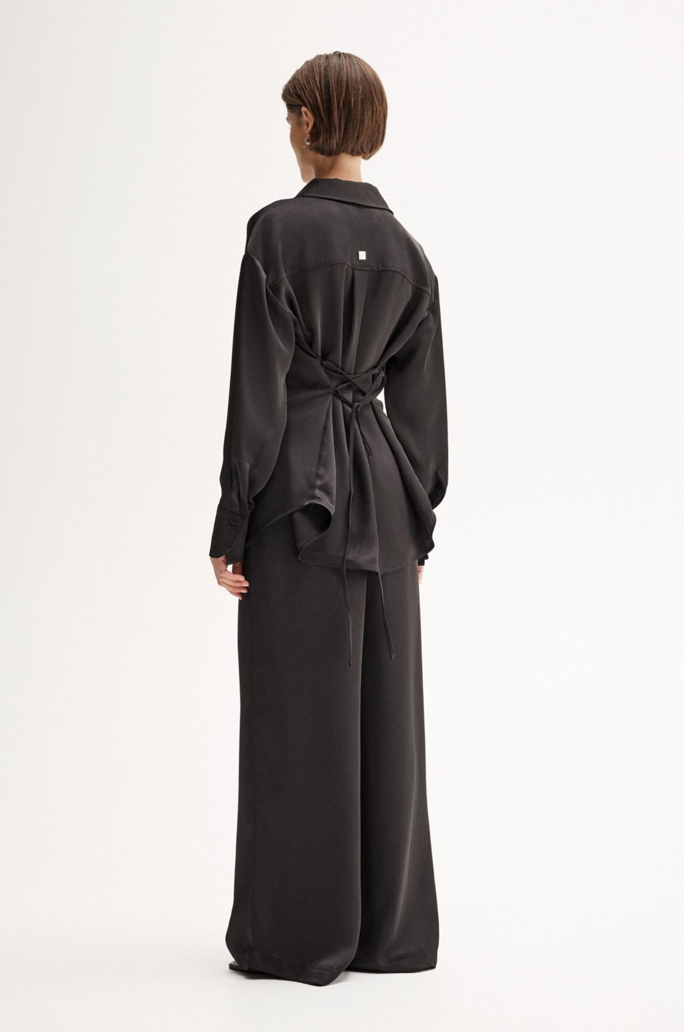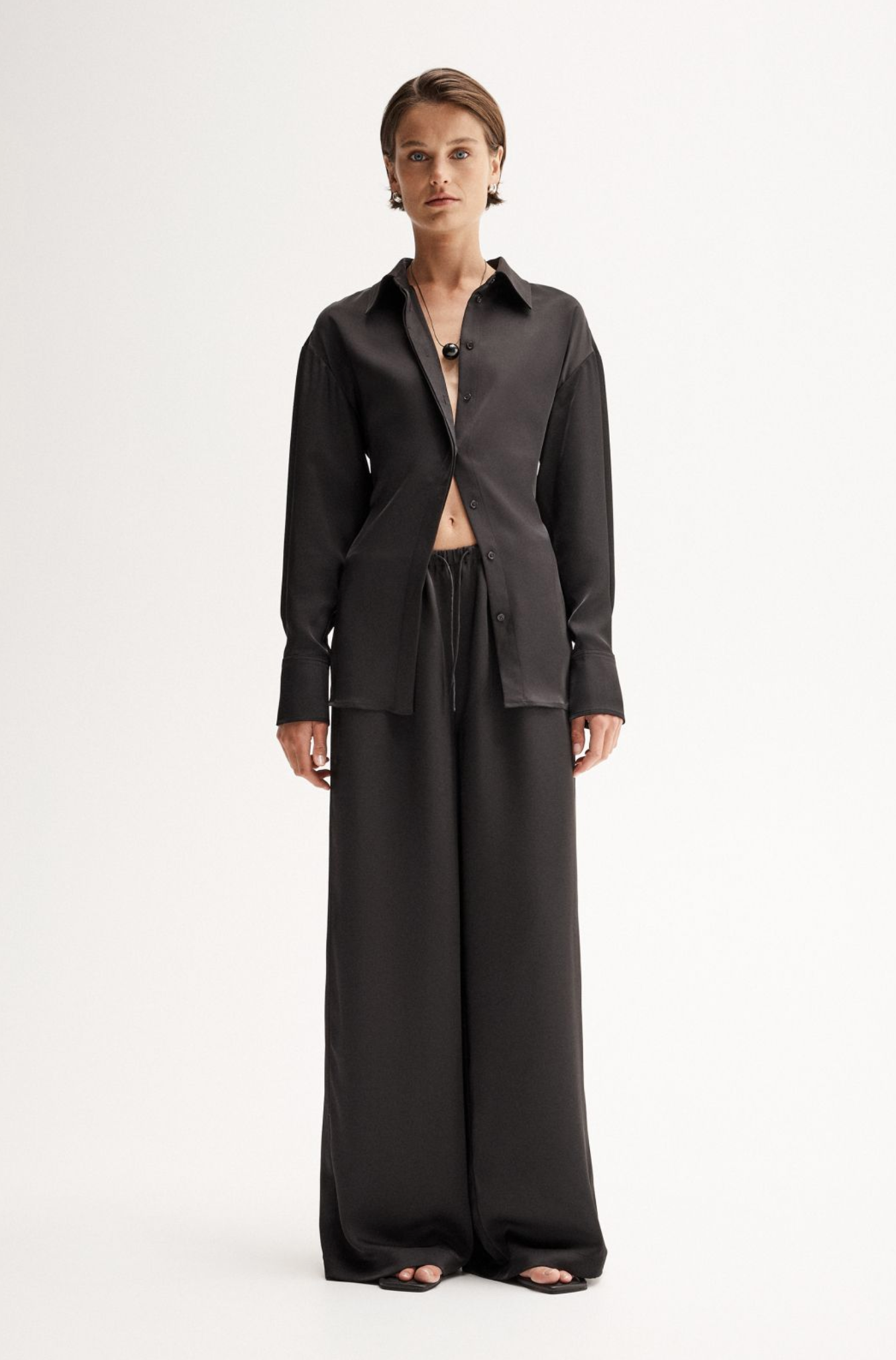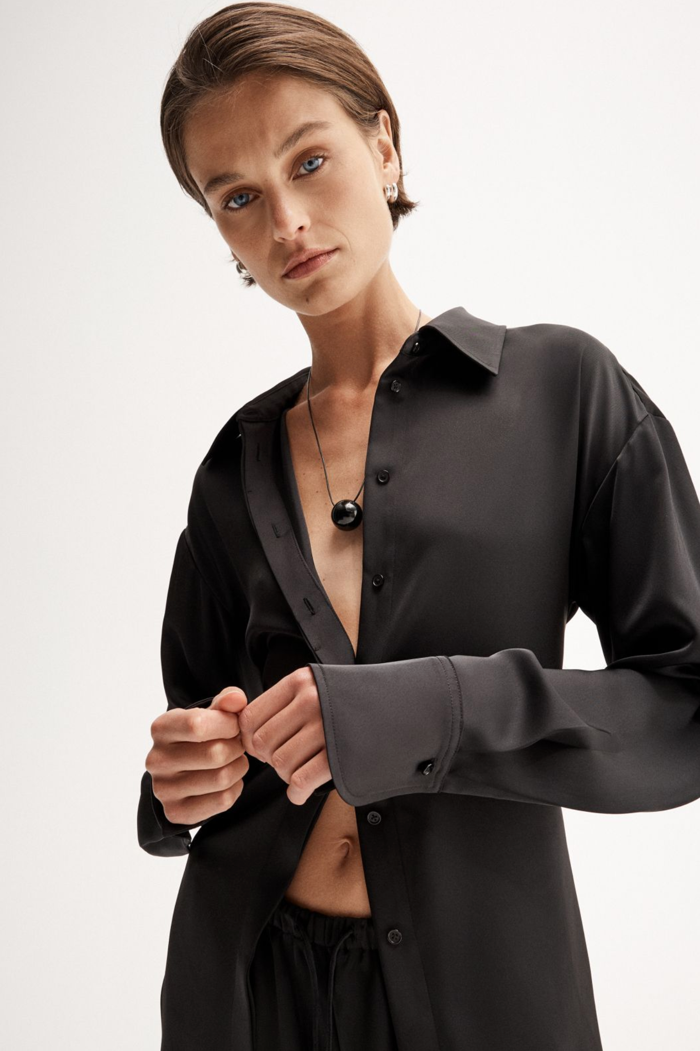 A rejuvenated favourite, the Ella Shirt is made of a luxuriously soft double-faced recycled Japanese satin that gives this piece a truly elevated feel. This shirt is cut to a relaxed fit with an adjustable corset tie at the back, a classic shirt collar, full length sleeve with drop shoulder and button cuffs, and a button through front. Style with the Mina Pant for a coordinated look or crisp denim to soften a casual weekend outfit