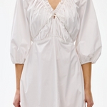 Featuring a flattering V-neckline with a softly gathered bust and a fitted elastic waistband, the silhouette flows into a relaxed A-line skirt.