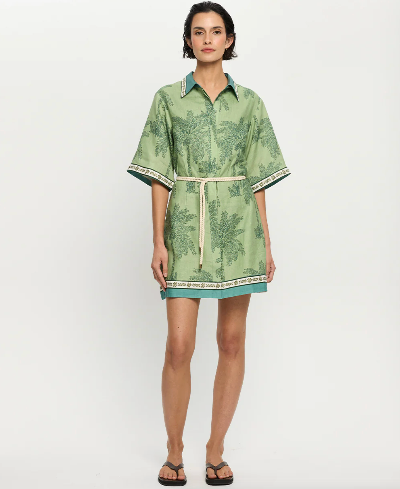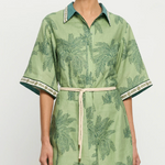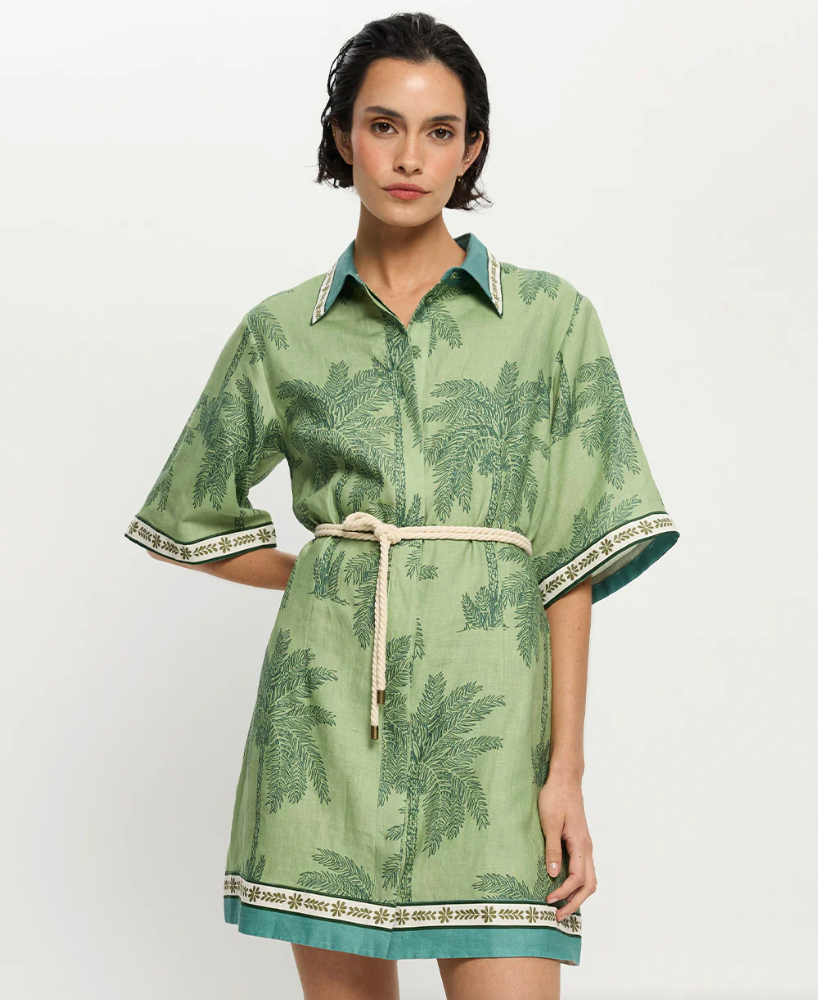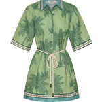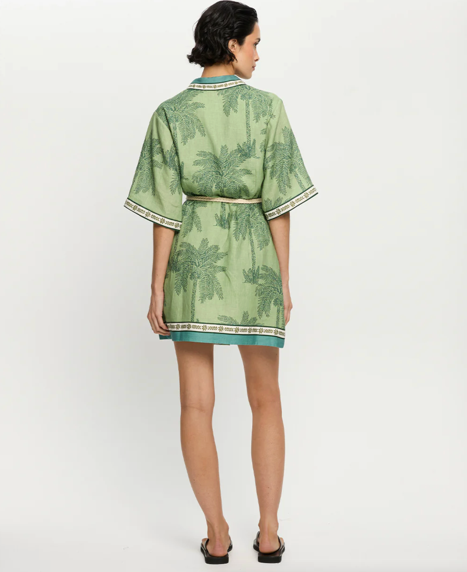 Alani is a leafy botanical print featuring deep green palm trees scattered across a soft sage green base. The Alani Mini Shirt Dress is a relaxed fit featuring kimono style sleeves, signature buttons, contrast border print details. Featuring a button-through front and a removable waist tie, it offers a balance of ease and shape. Designed for warm days that drift into balmy evenings.