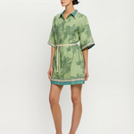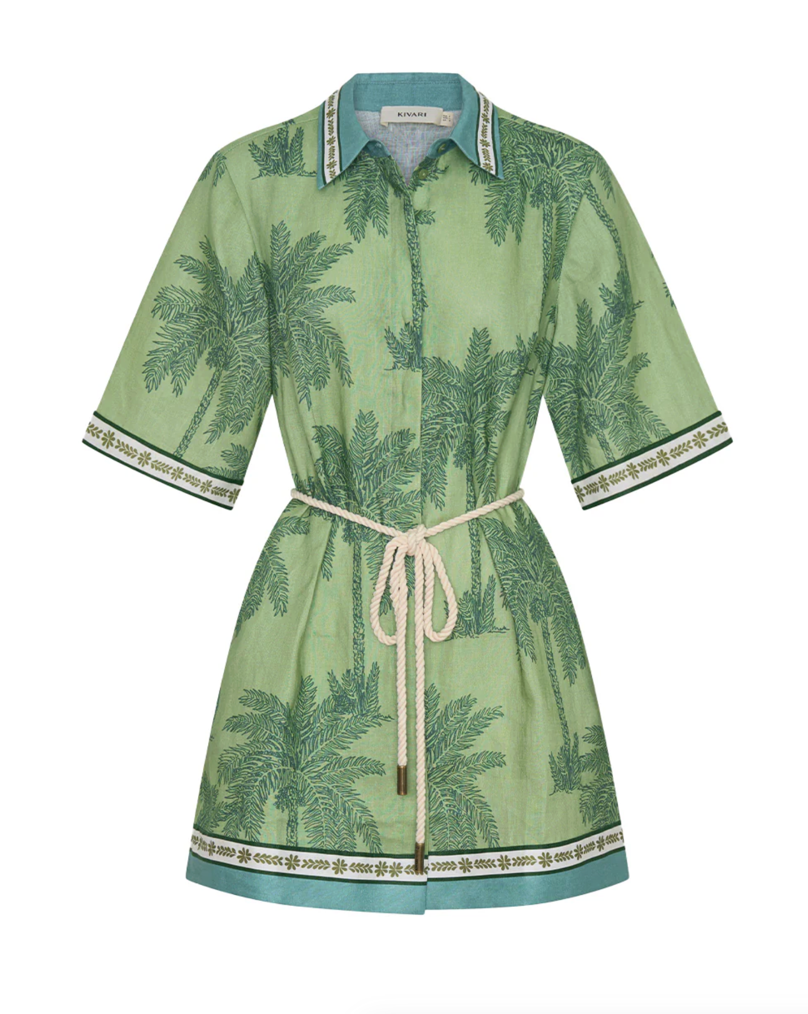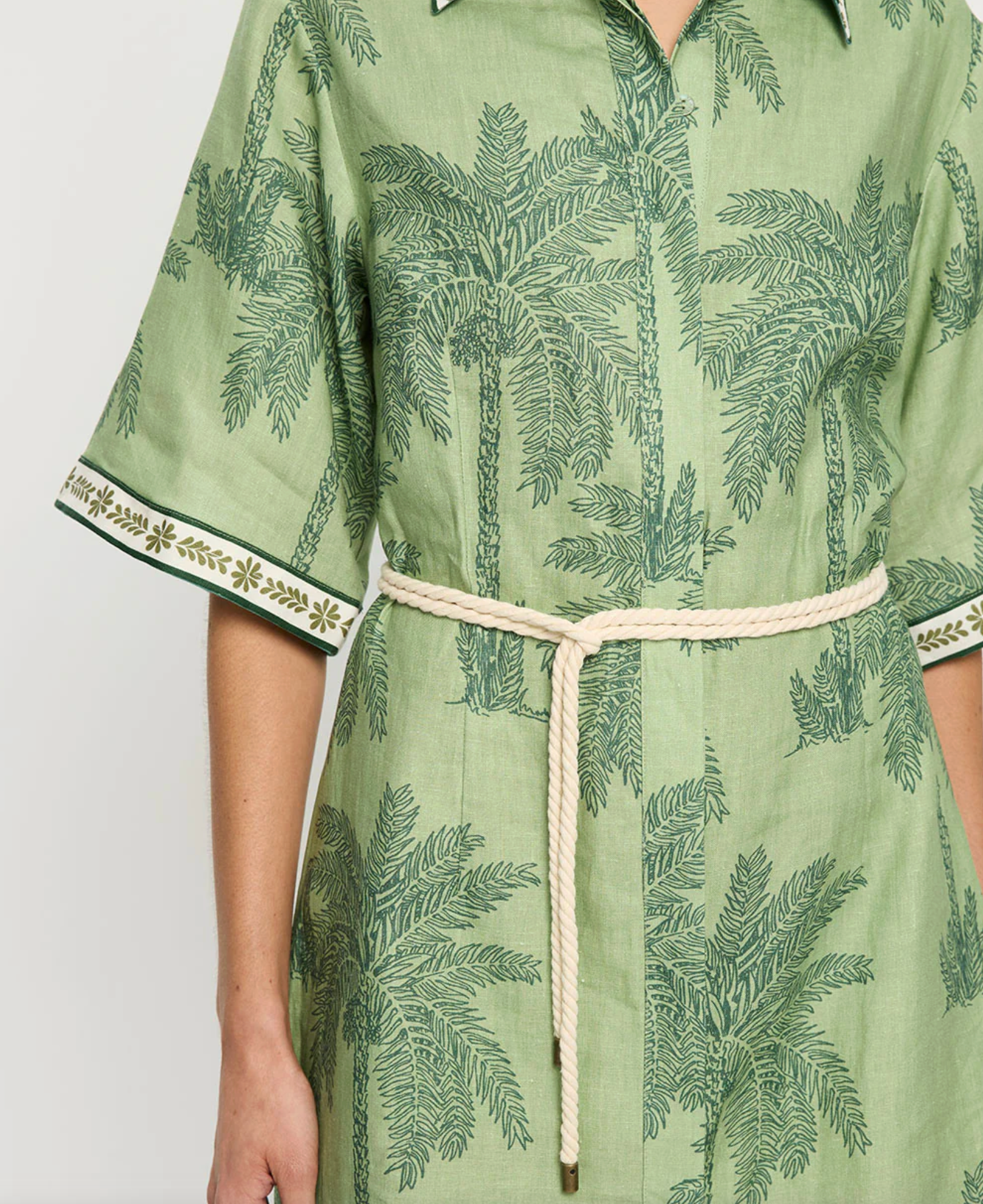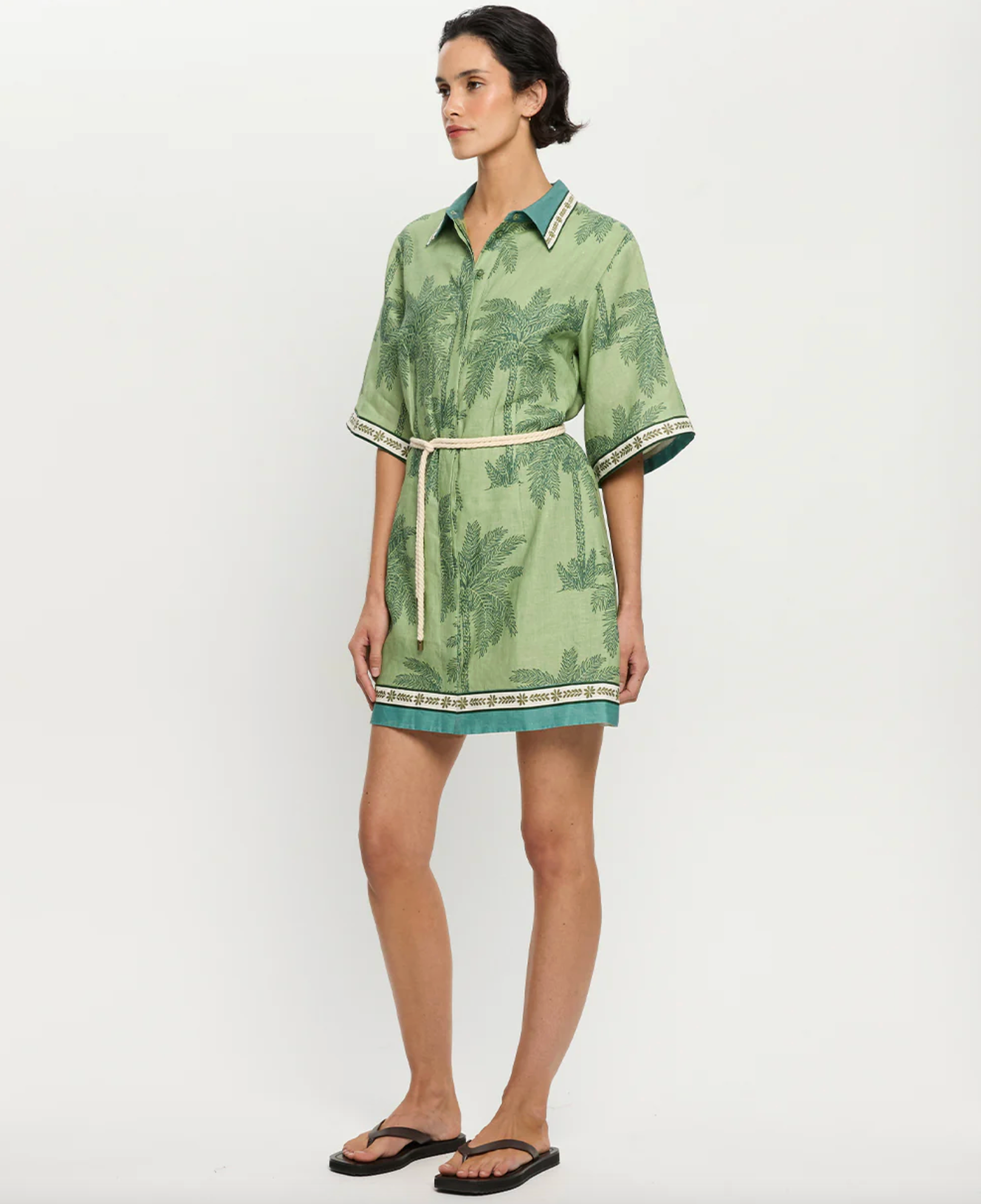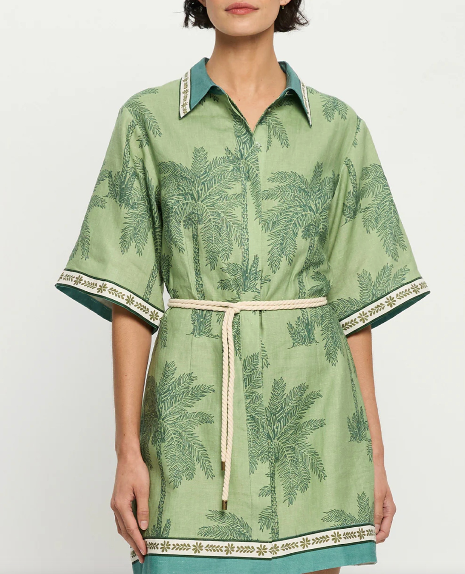 Alani is a leafy botanical print featuring deep green palm trees scattered across a soft sage green base. The Alani Mini Shirt Dress is a relaxed fit featuring kimono style sleeves, signature buttons, contrast border print details. Featuring a button-through front and a removable waist tie, it offers a balance of ease and shape. Designed for warm days that drift into balmy evenings.