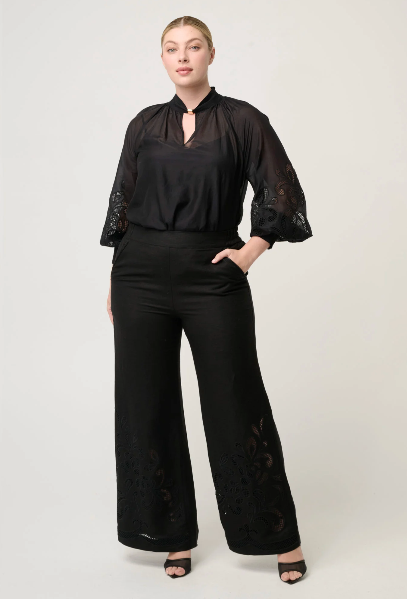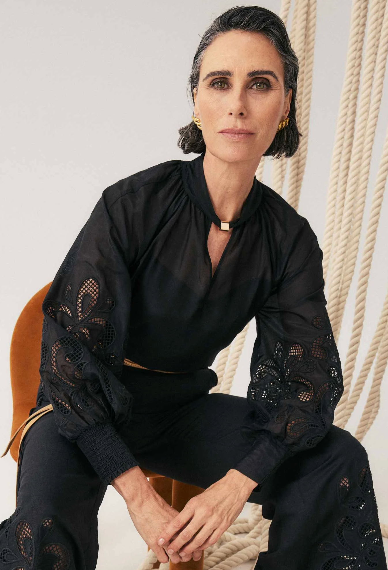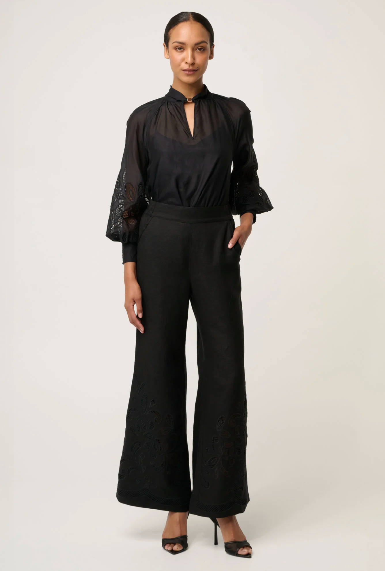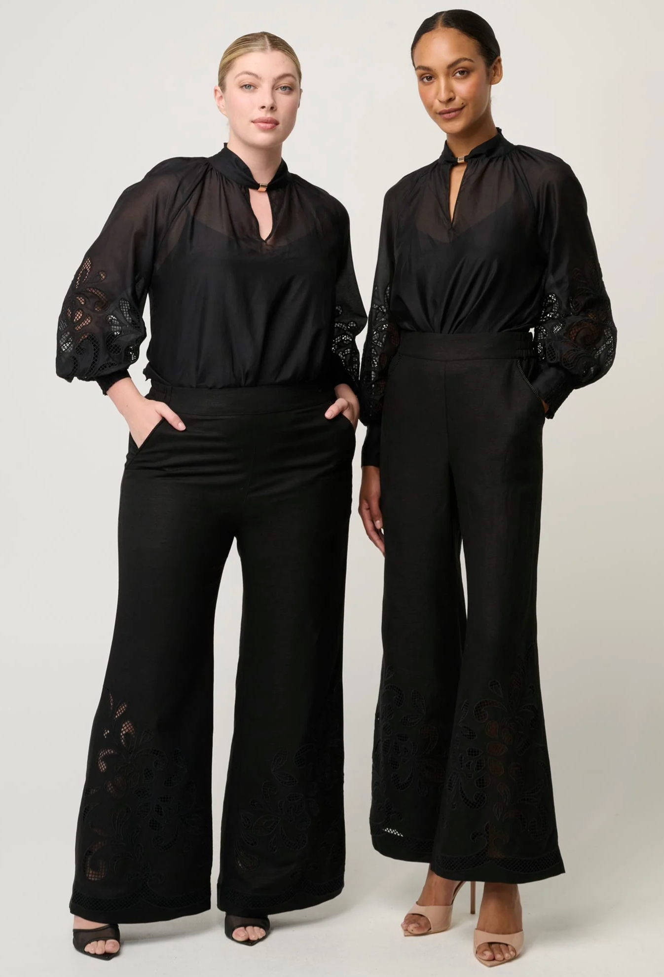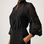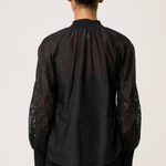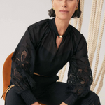 Elegant and timeless, the Simona Cotton Silk Embroidered Blouse in Black is a refined essential designed for elevated everyday and evening wear. Crafted from a luxurious cotton-silk blend, this blouse offers a lightweight, softly sheer finish with a beautiful natural drape. The clean silhouette is elevated by delicate embroidered detailing along the sleeves, adding artisanal texture and subtle sophistication.