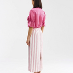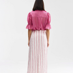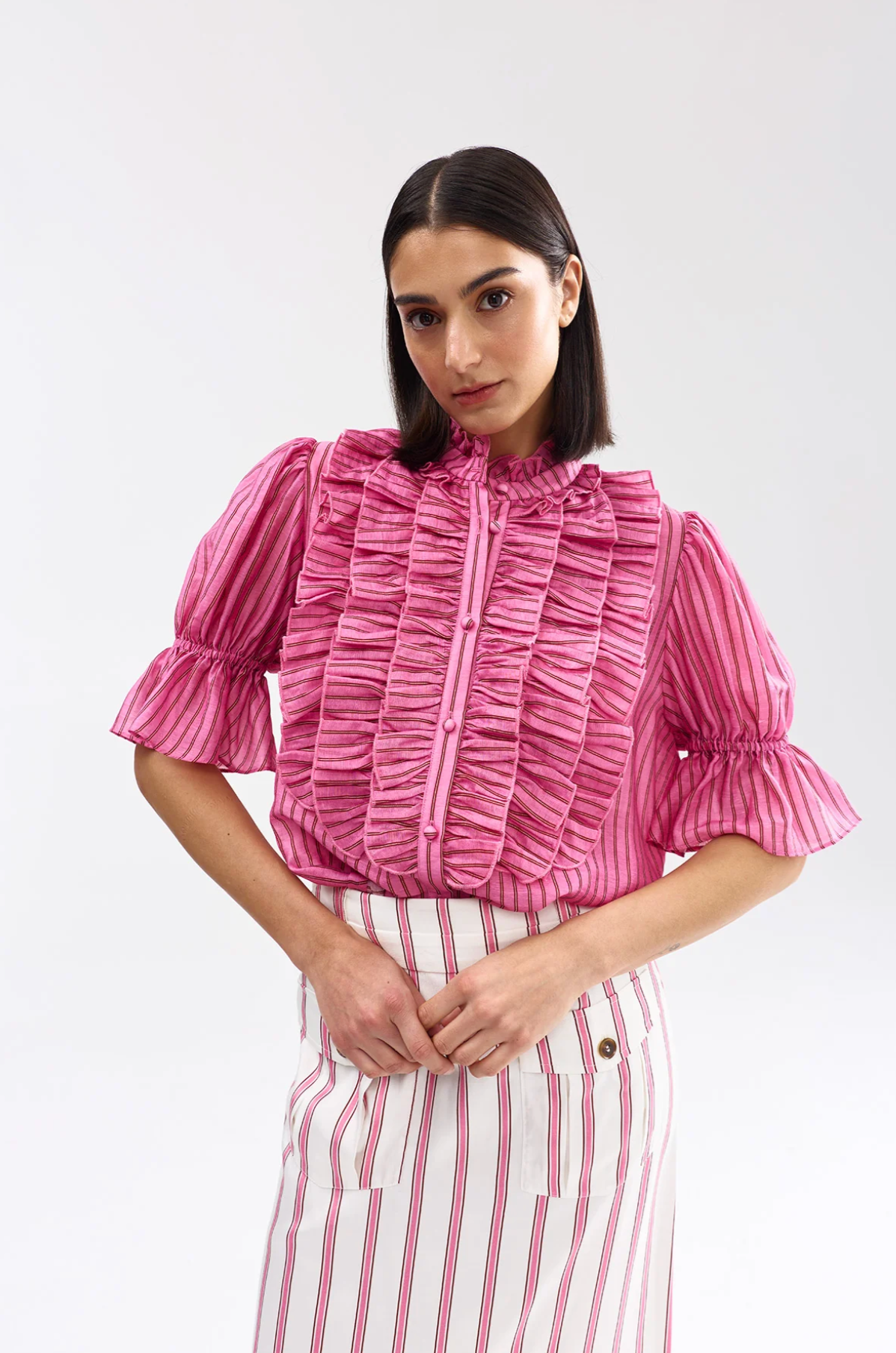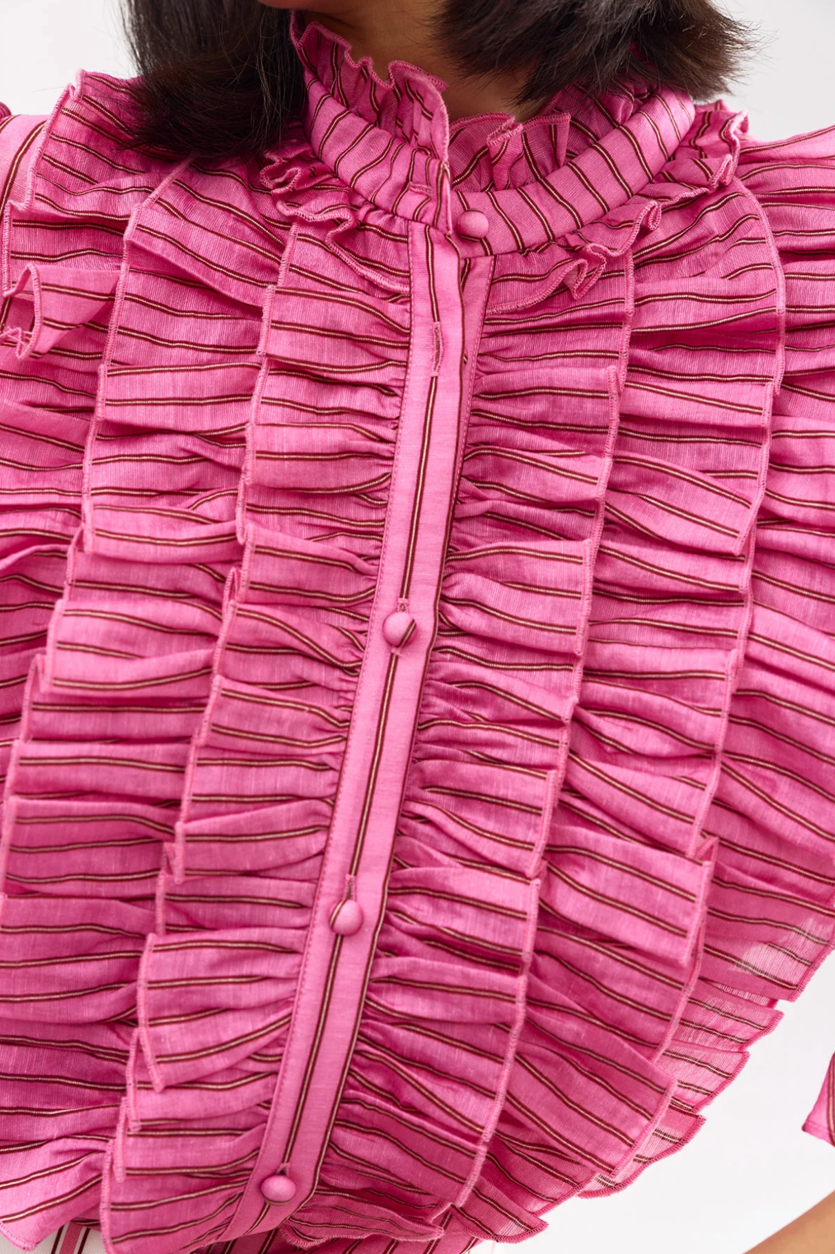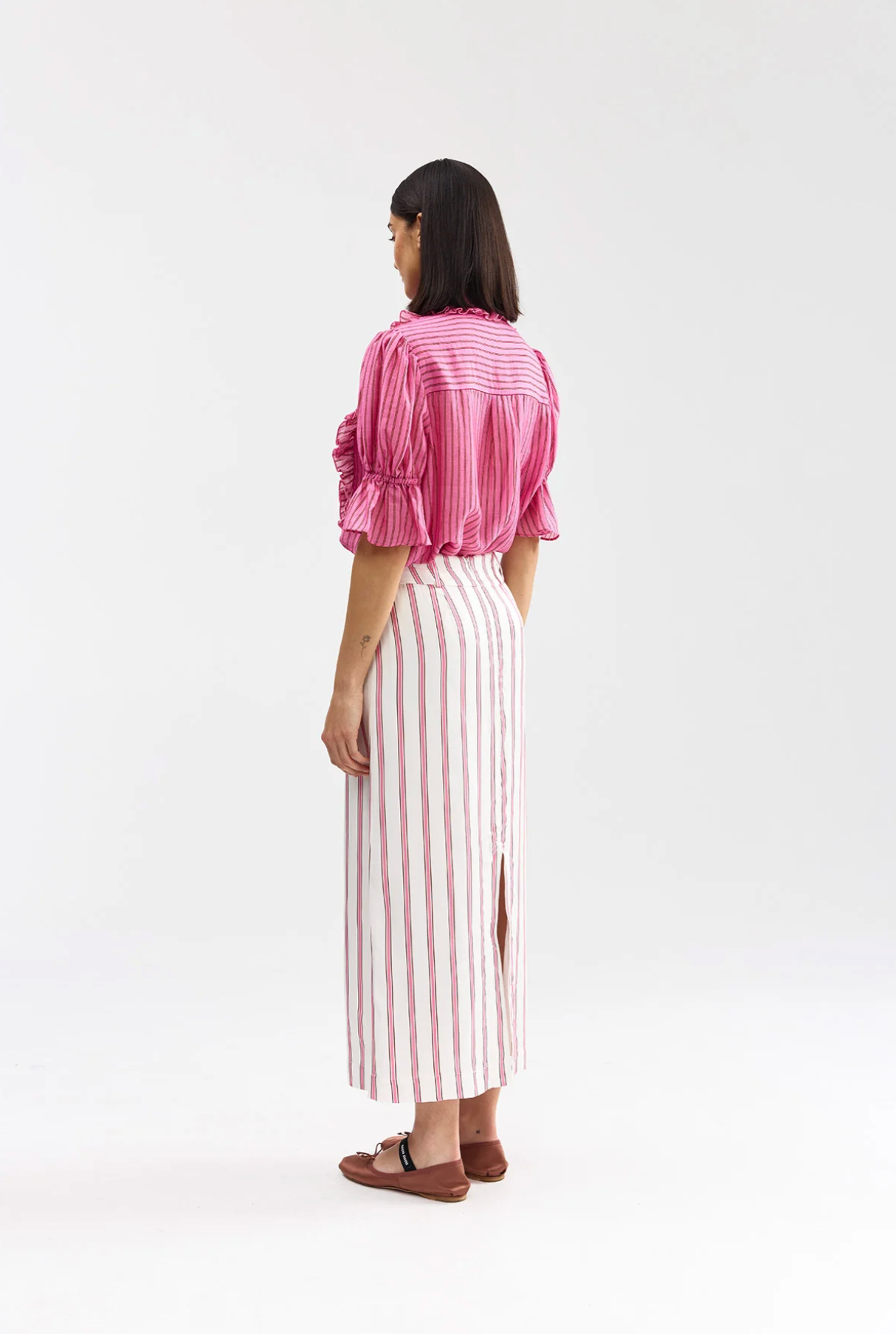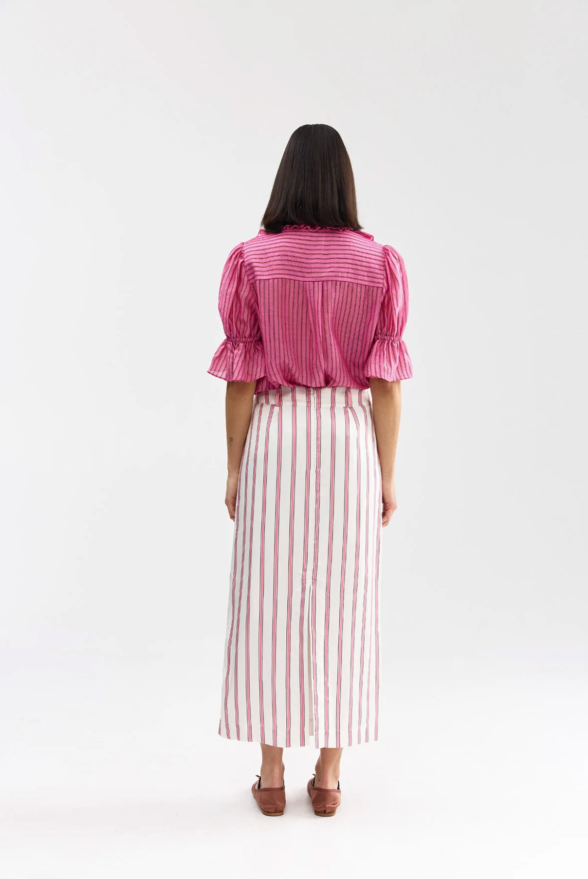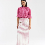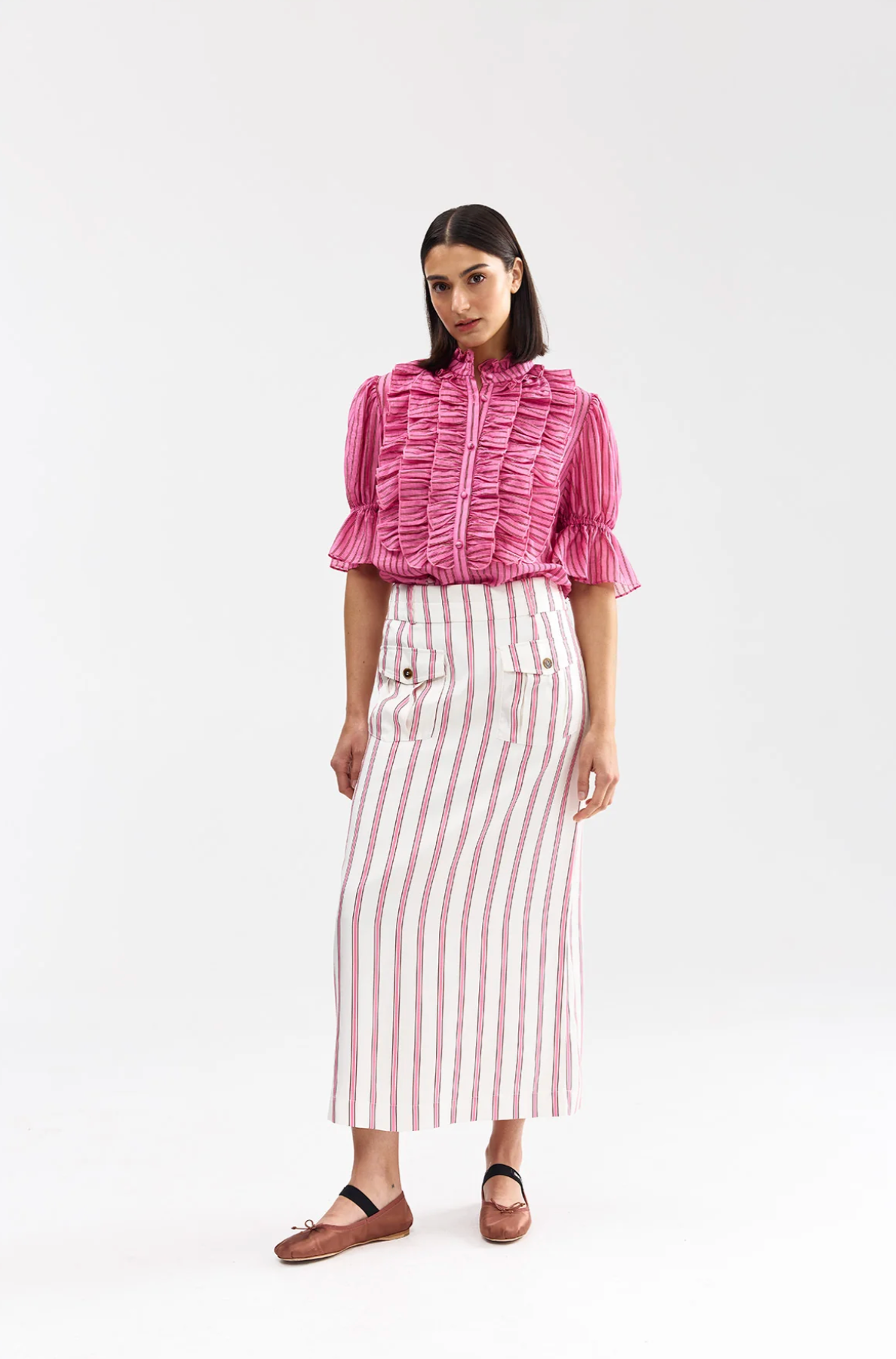 The Leonie Blouse in Poppy Bark Stripe is a statement-making blouse. The vertical stripes and intricate ruffles create a romantic, textured look that makes the blouse perfect for pairing with tailored skirts or trousers.