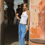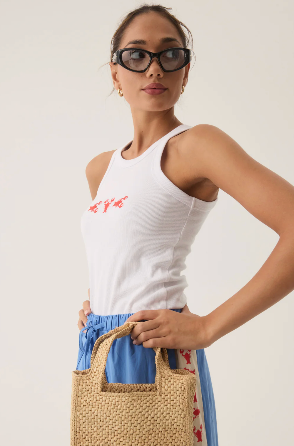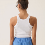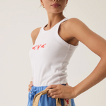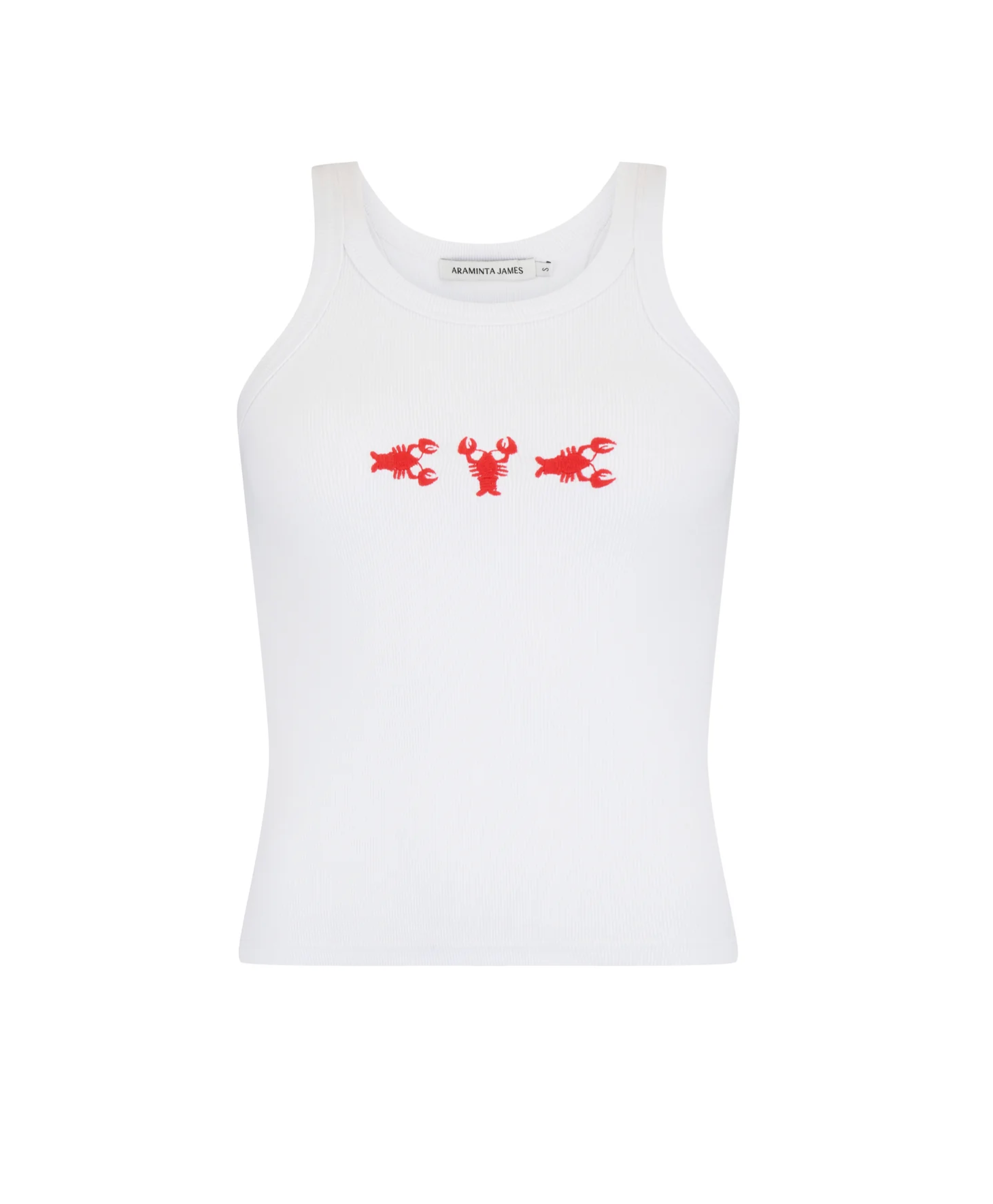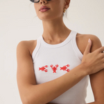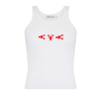 Inspired by the sun-drenched beauty and vibrant energy of the Mediterranean, our Lobster Tank in Snow is a fresh update to our best-selling tank shape. Cut in a luxuriously soft cotton rib fabric with a sporty racer-style neckline and lobster embroidery at the front. This piece is made for warmer days and pairs perfectly with our Lobster Pant in French Blue for an elevated summer look.