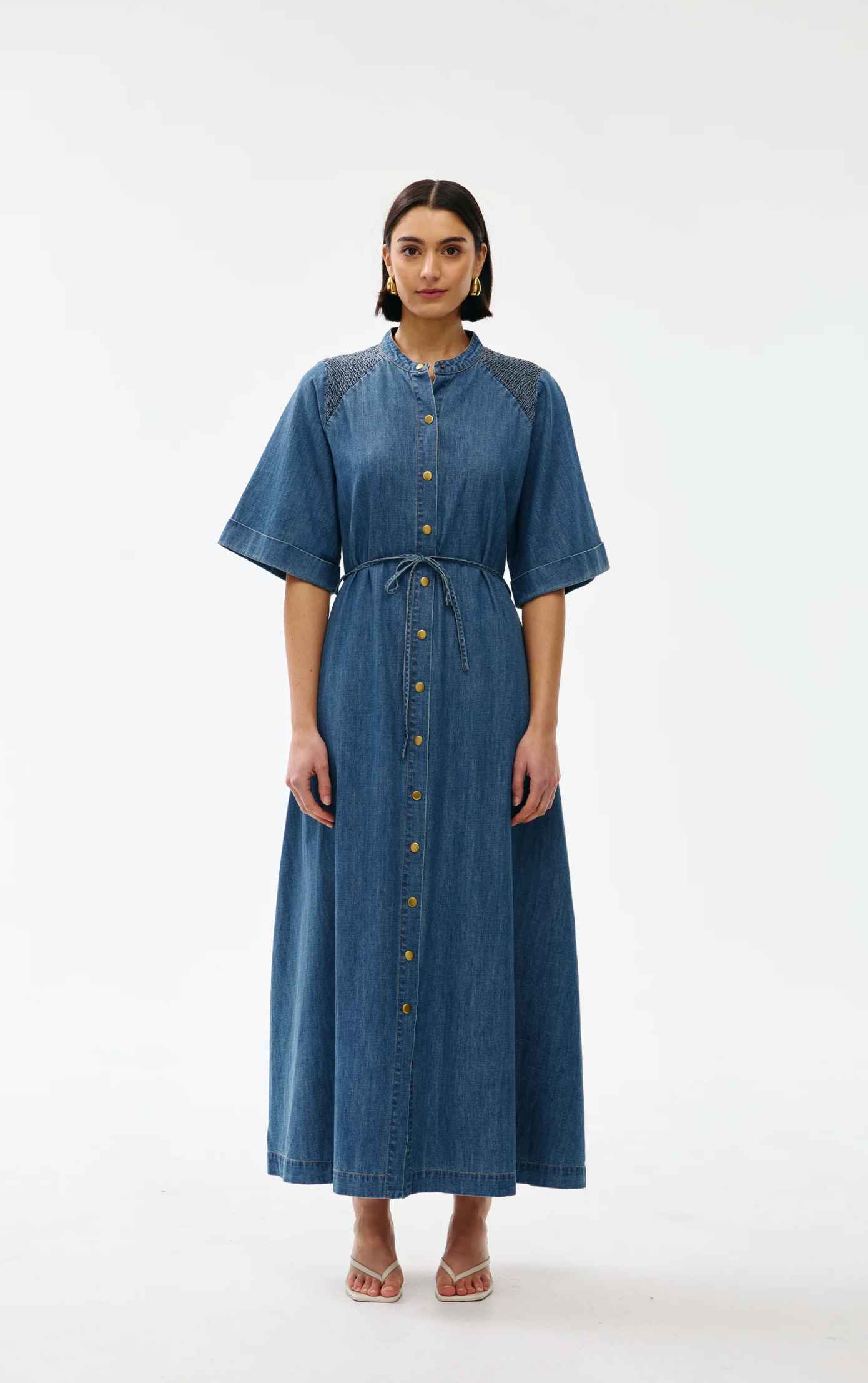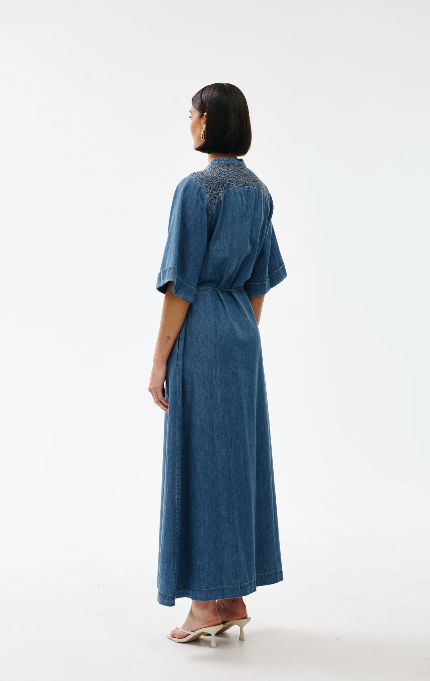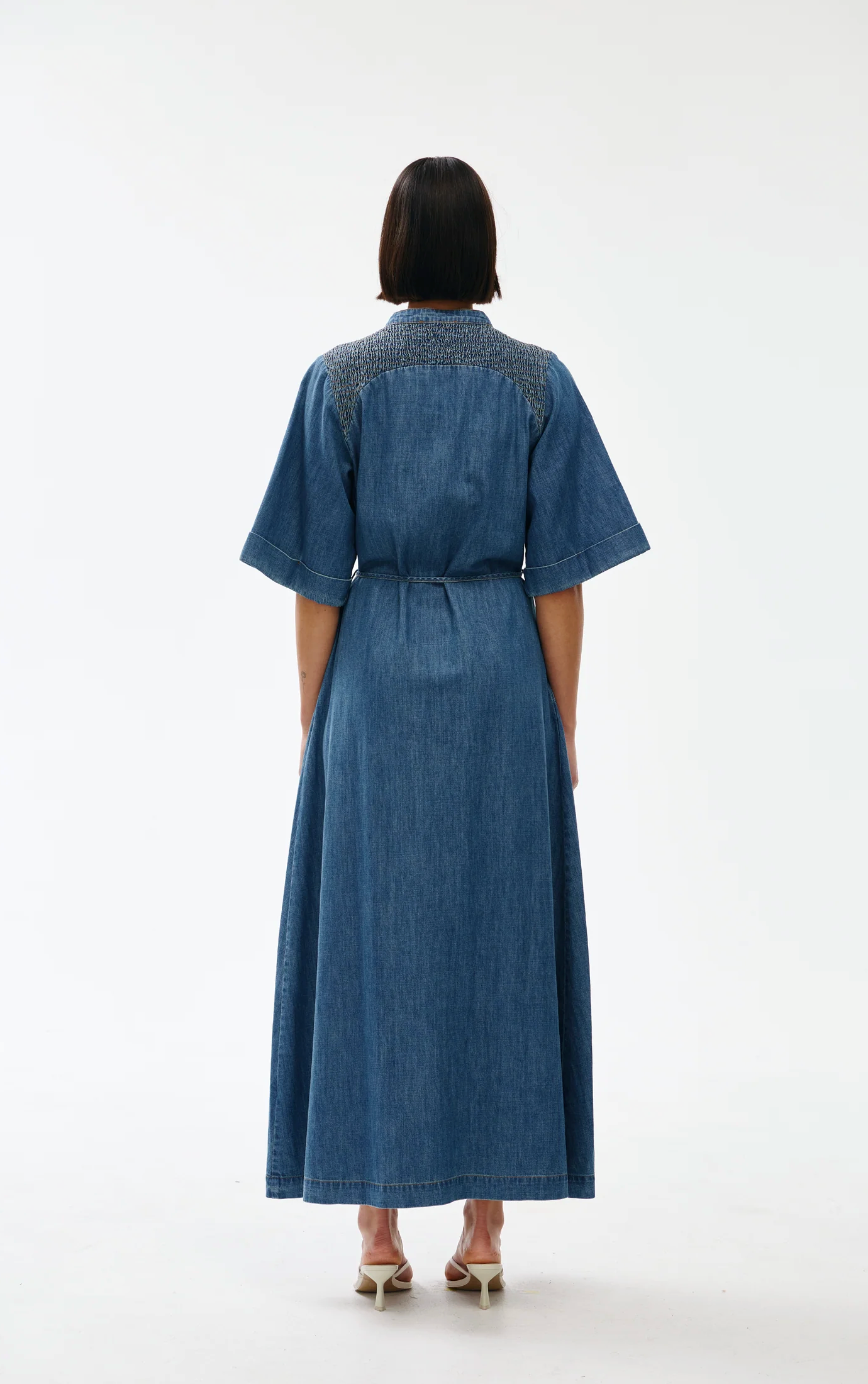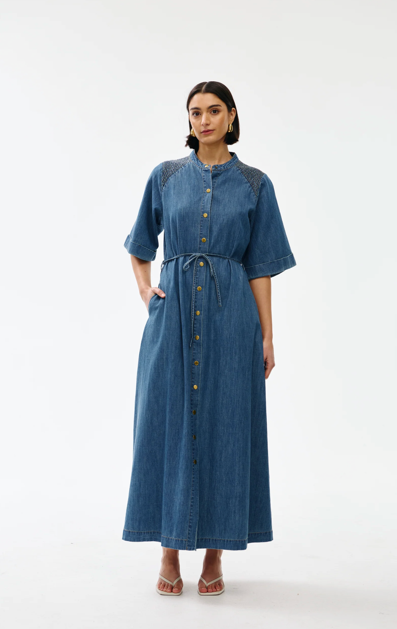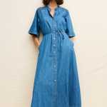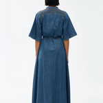 The Gigi Dress in Denim features a flowing silhouette crafted from a high quality light-weight denim.