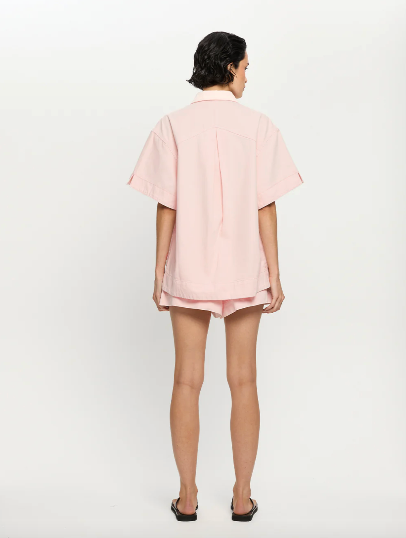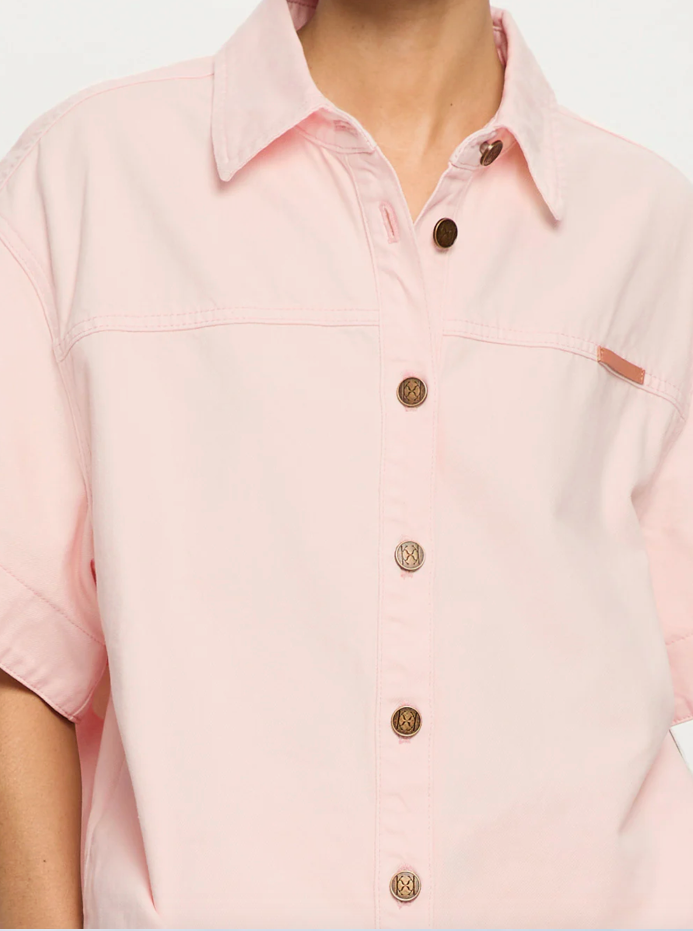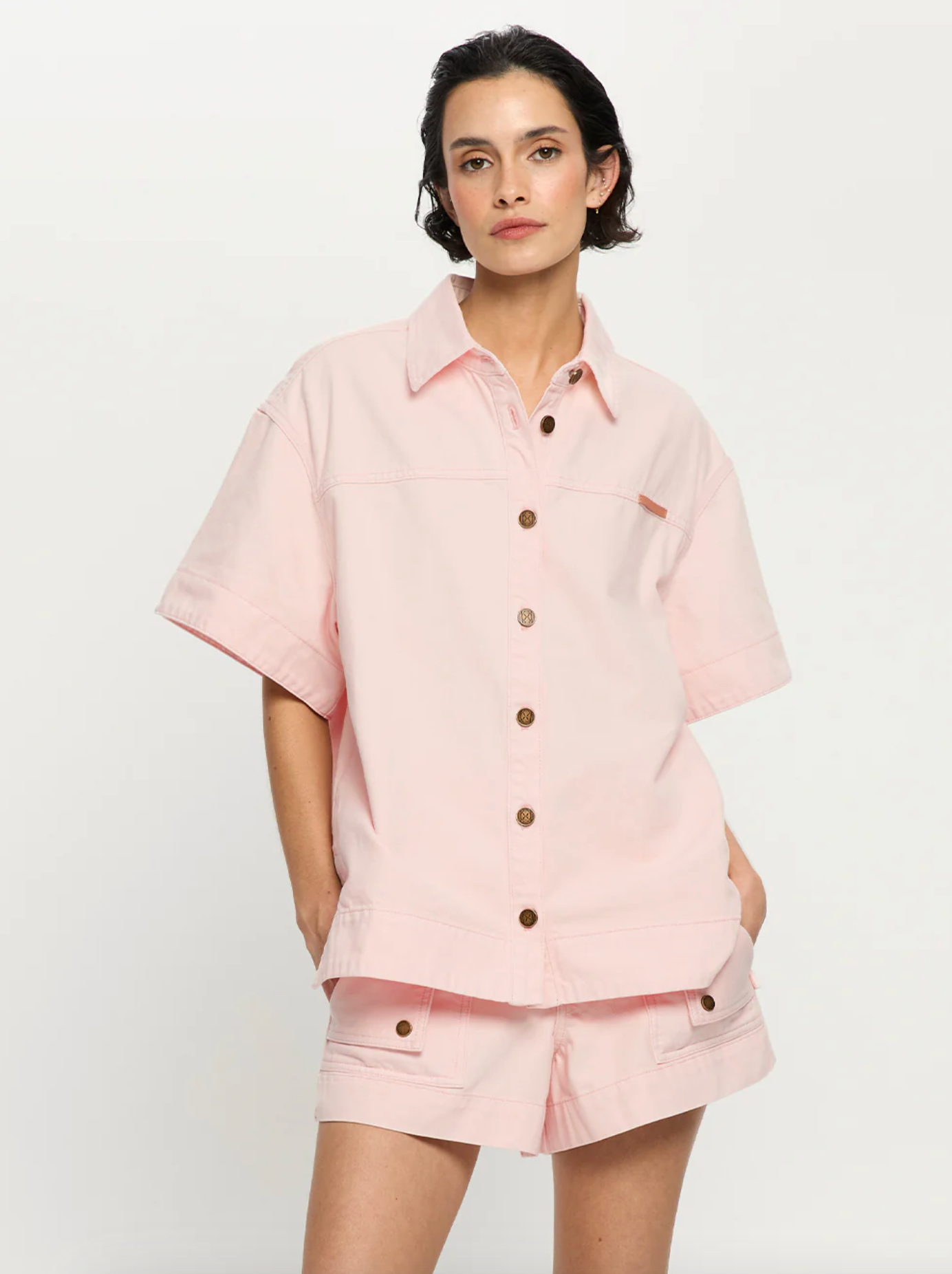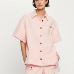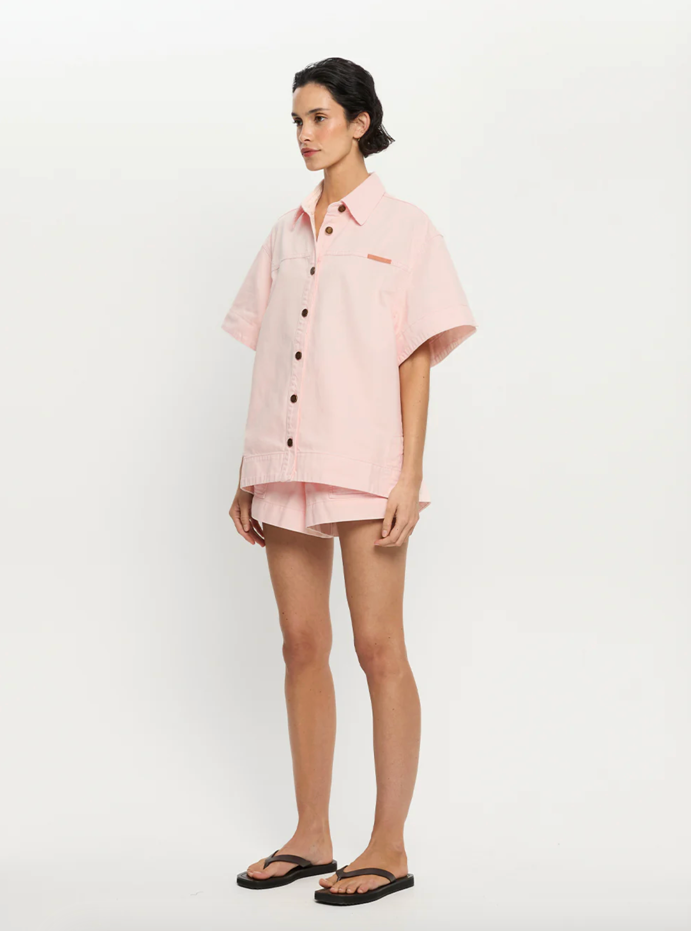 A boxy, oversized silhouette crafted in a pink denim. Our Signature Marla Shirt features a button-through front and signature brass hardware, offering a considered contrast to its relaxed form. Laid-back in shape, elevated in detail the Marla is designed to be worn on repeat, solo or styled as a set.