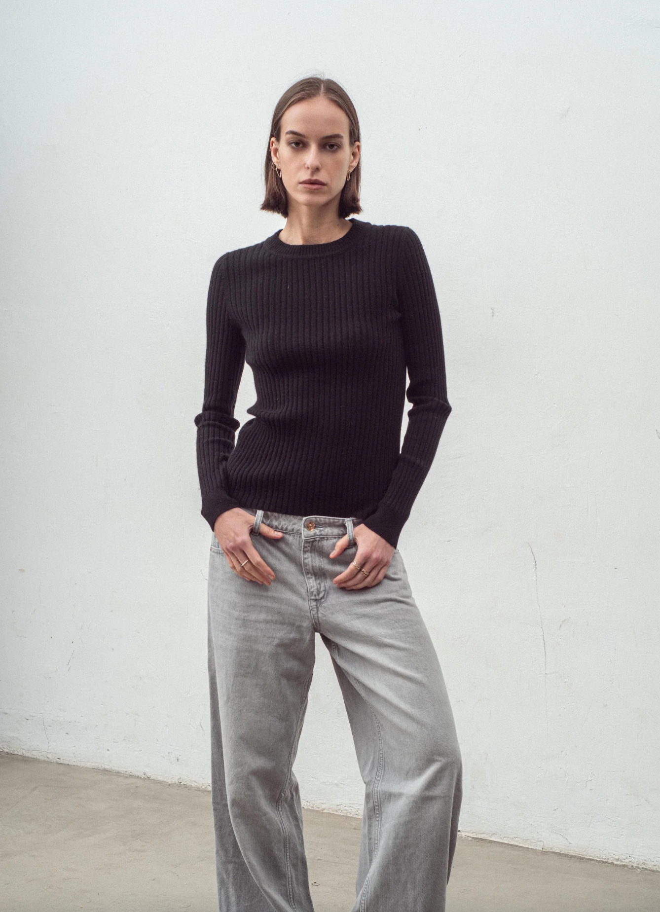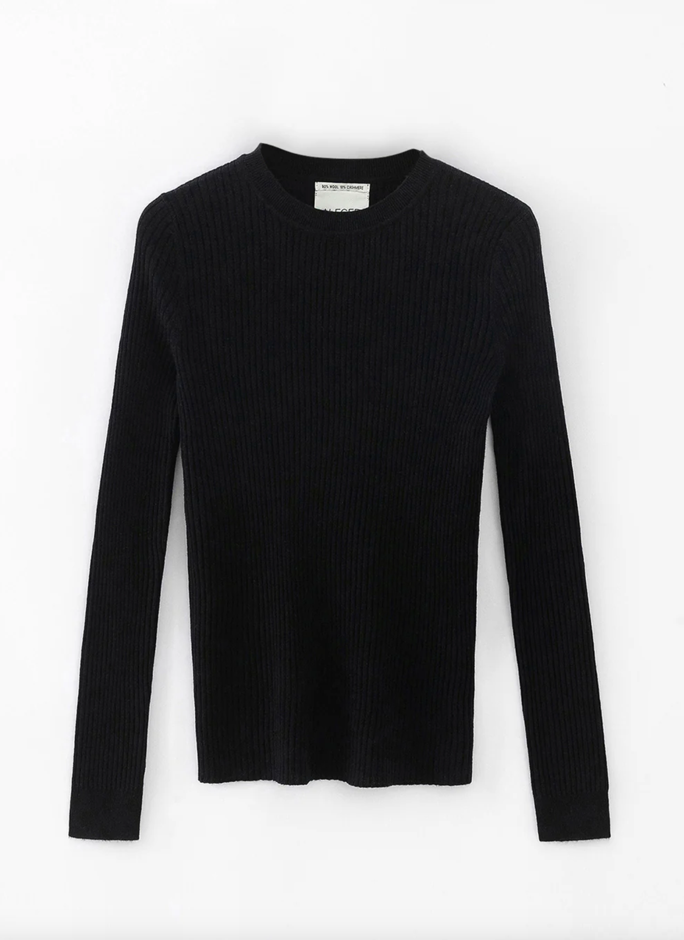 New skinny ribbed long sleeve crew neck top in a fine wool and cashmere blend