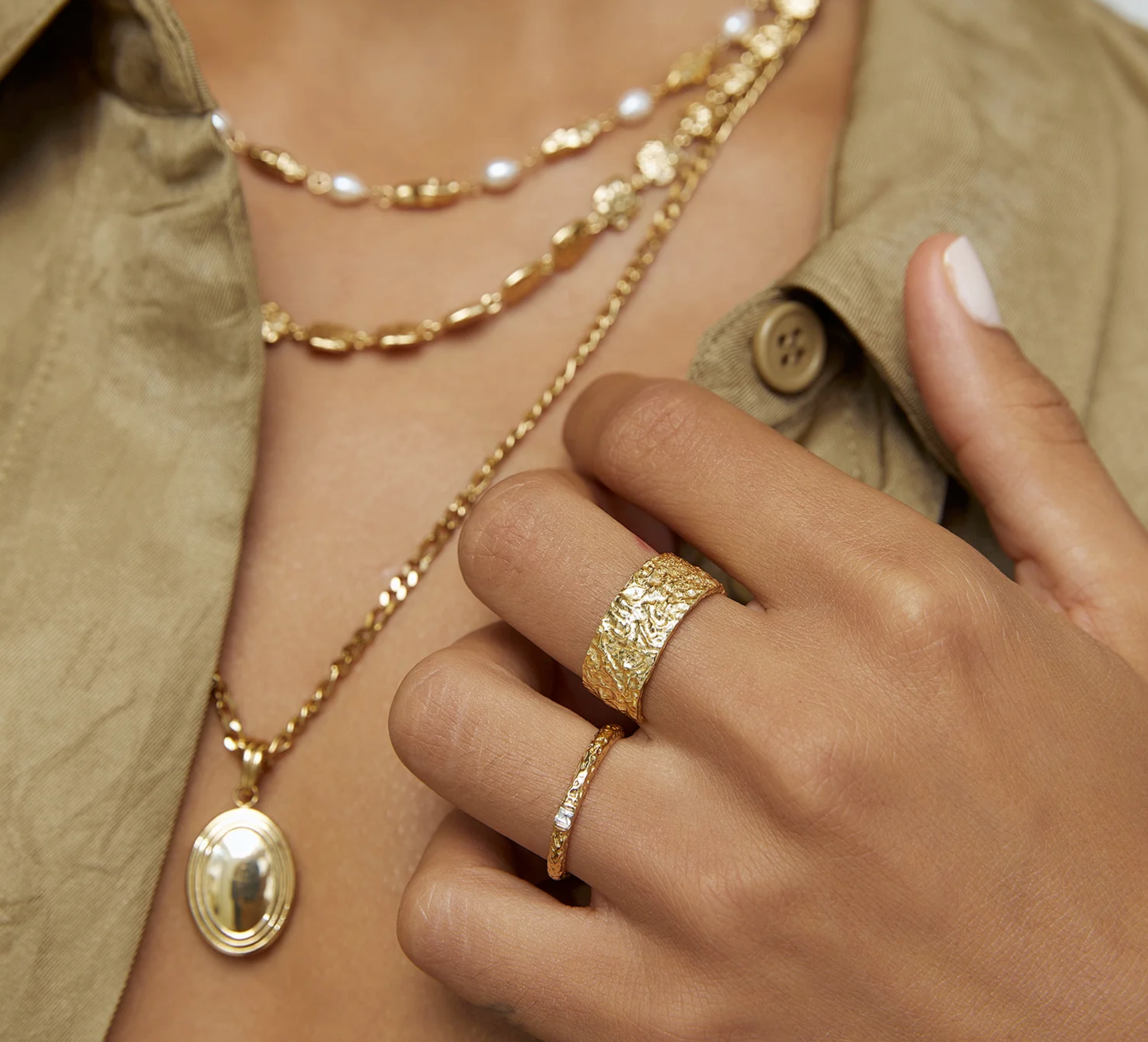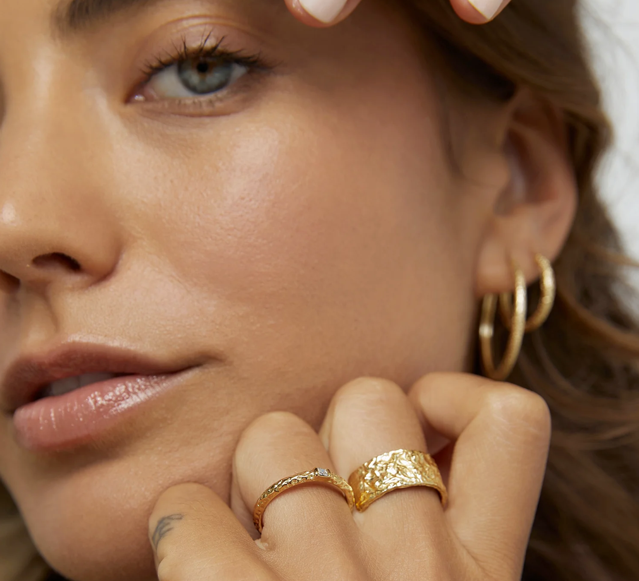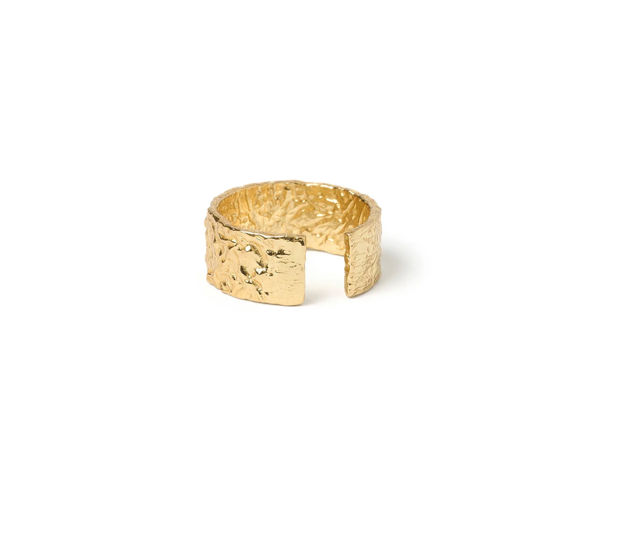 The Large Eros Textured Ring is gorgeous and feels beautiful on. Its beautifully textured surface comes in 14k Gold plating.