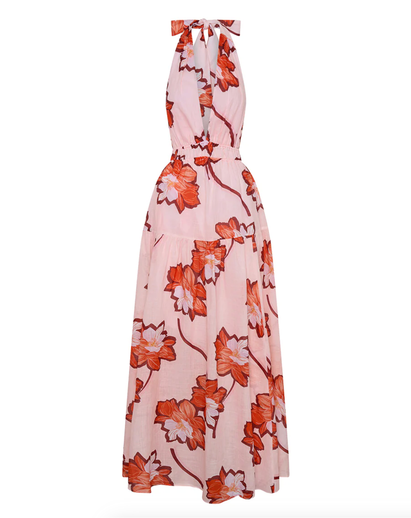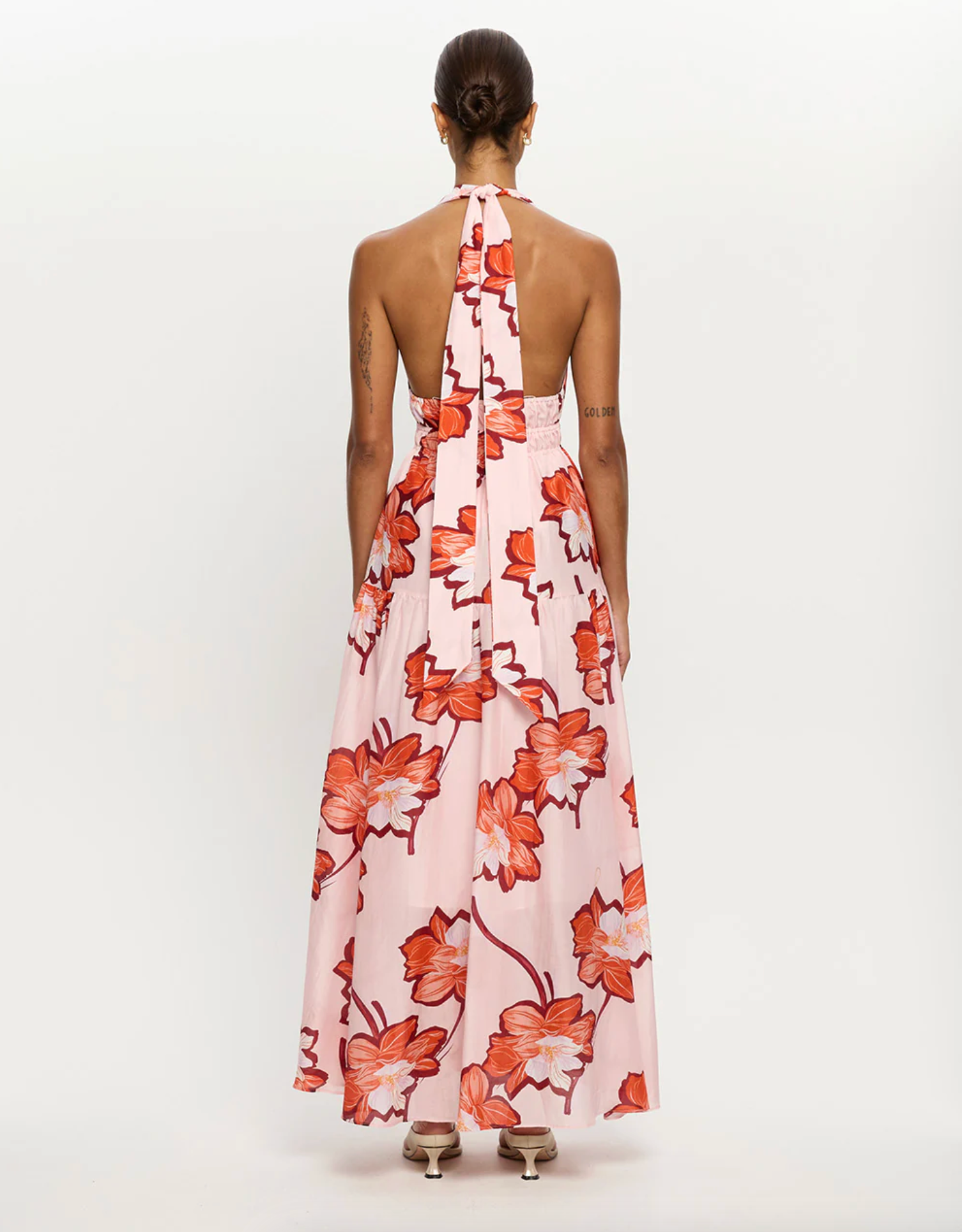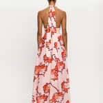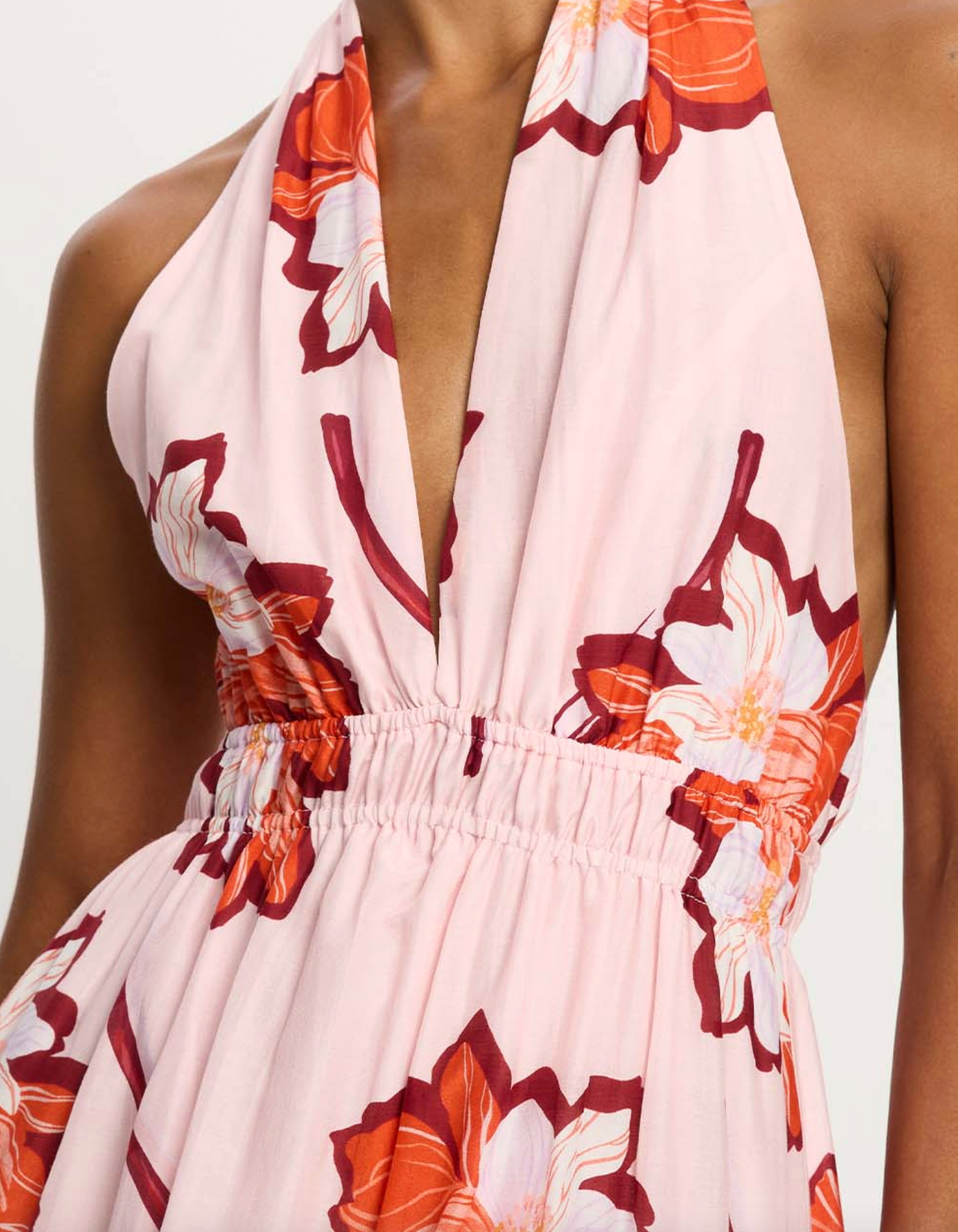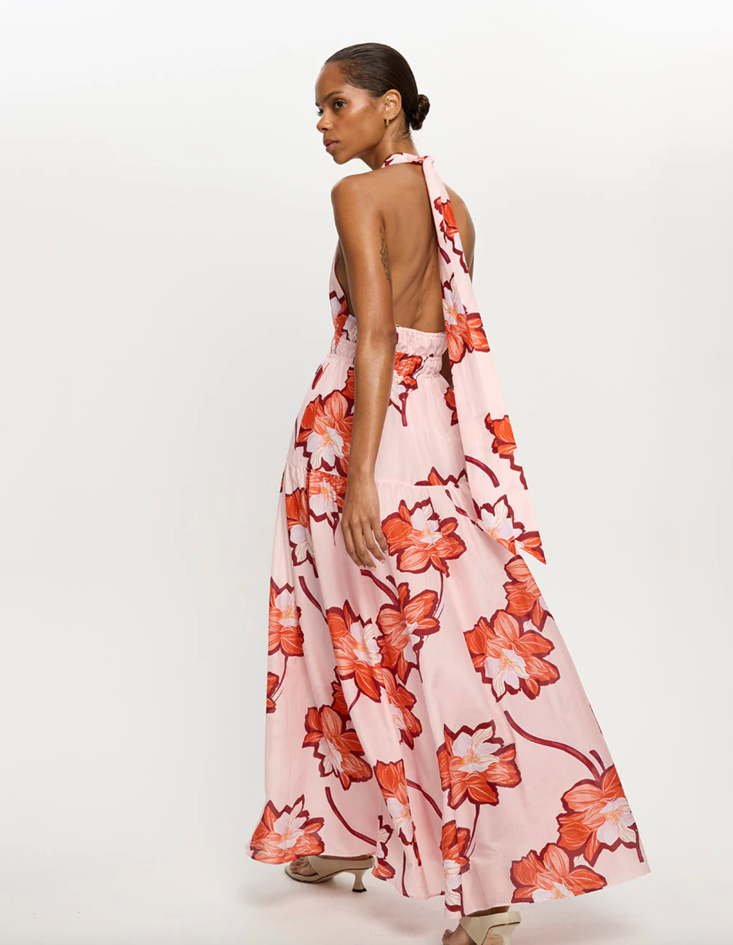 Lani is a floral print featuring hibiscus-inspired blooms in vivid shades of orange and red on a soft pink base. The Lani Halter Maxi Dress features a halter V-neckline with elongated ties, an elasticated waistband for subtle shape, and a tiered gathered skirt that drapes with effortless movement. Style with sandals for long lunches or elevate with heels for special occasions.