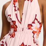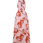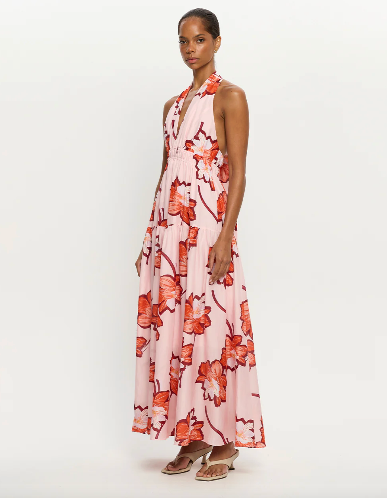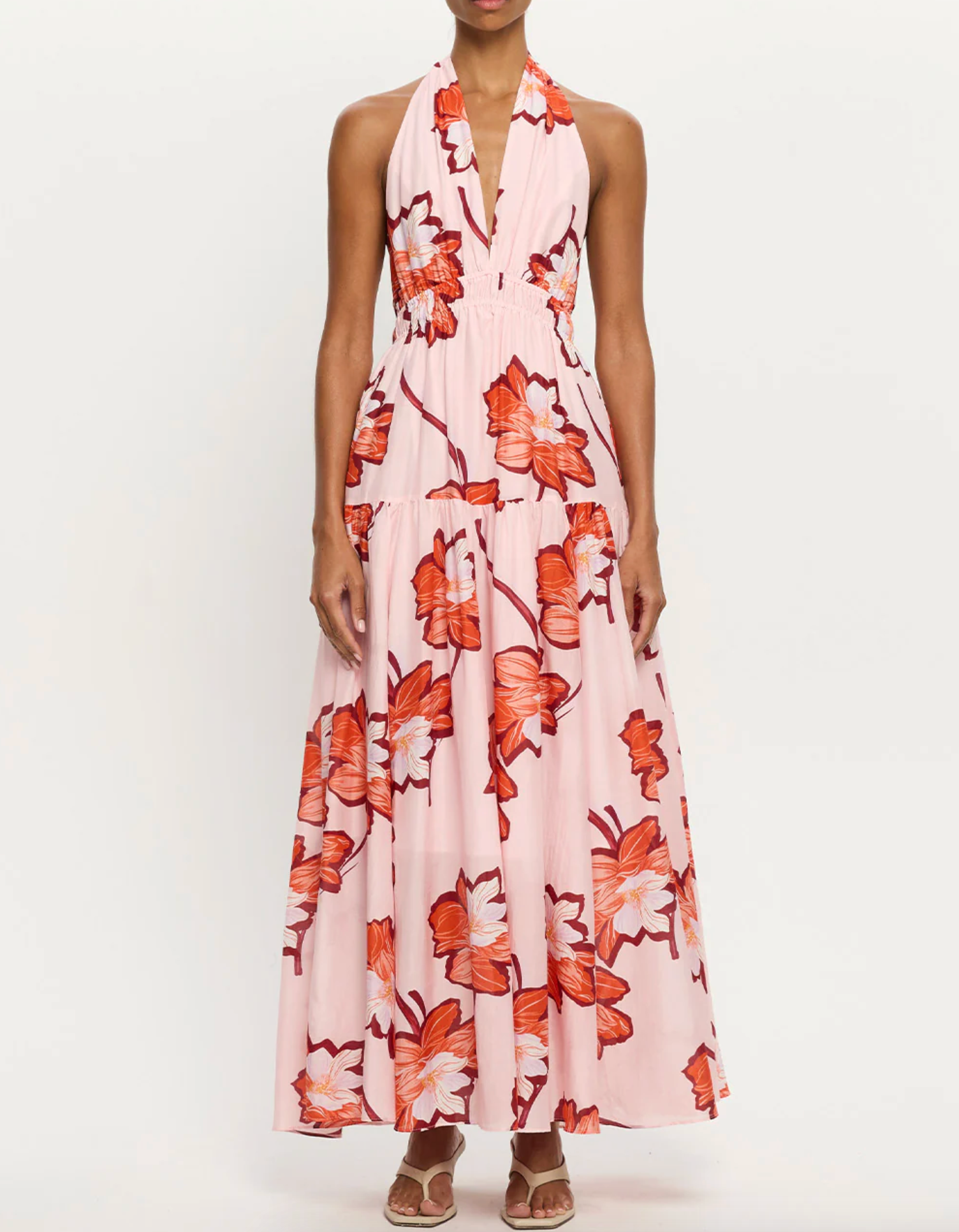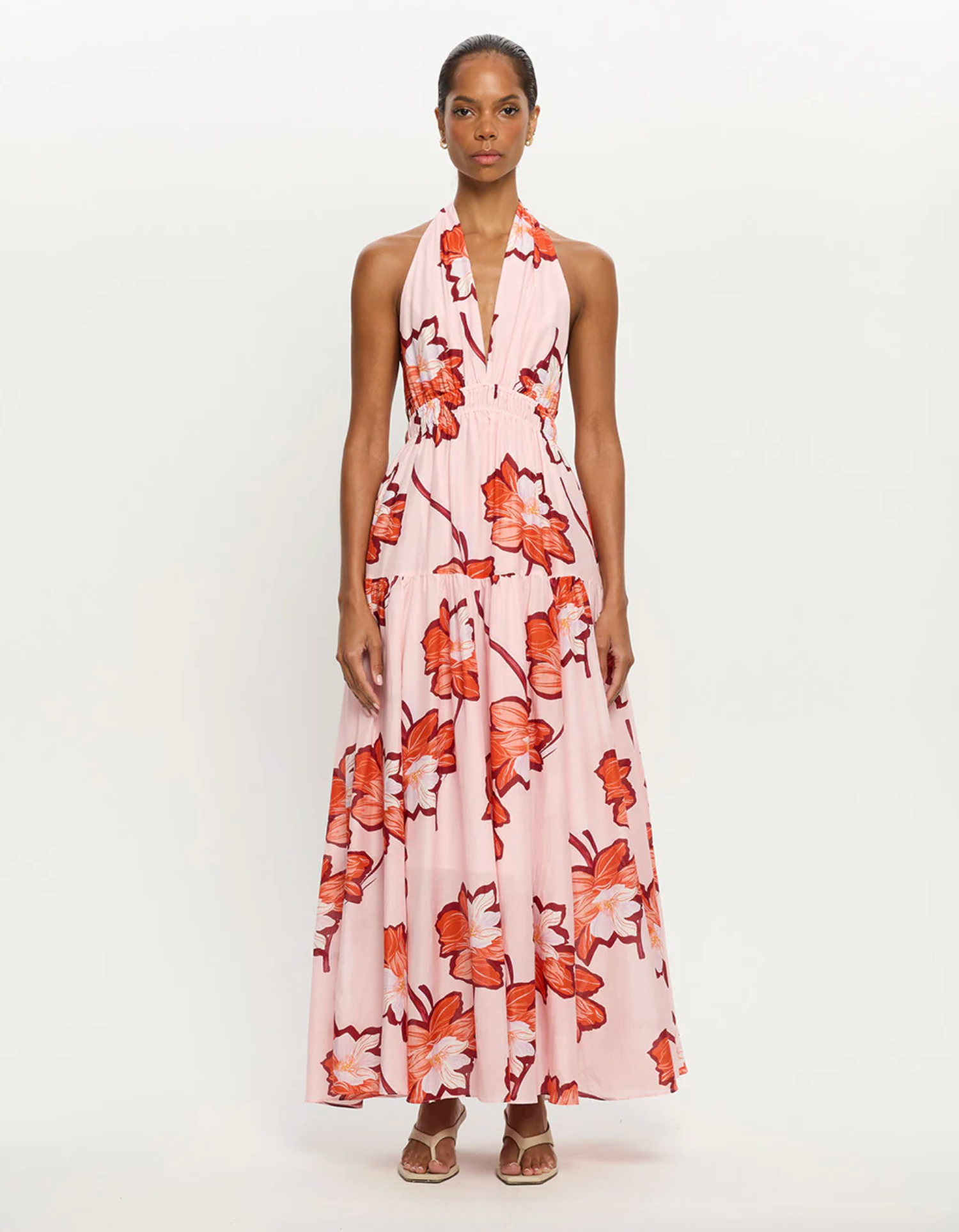 Lani is a floral print featuring hibiscus-inspired blooms in vivid shades of orange and red on a soft pink base. The Lani Halter Maxi Dress features a halter V-neckline with elongated ties, an elasticated waistband for subtle shape, and a tiered gathered skirt that drapes with effortless movement. Style with sandals for long lunches or elevate with heels for special occasions.