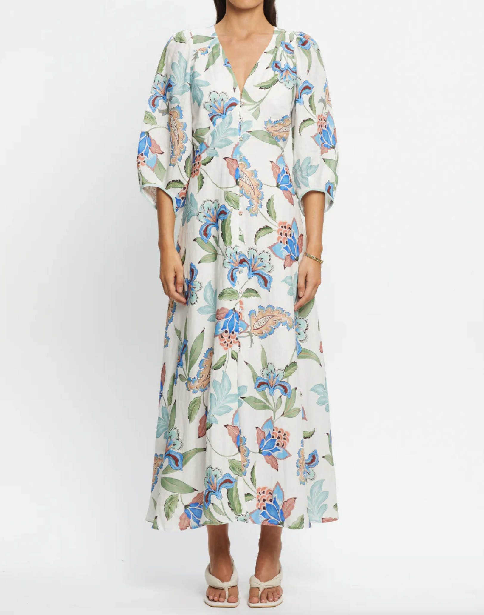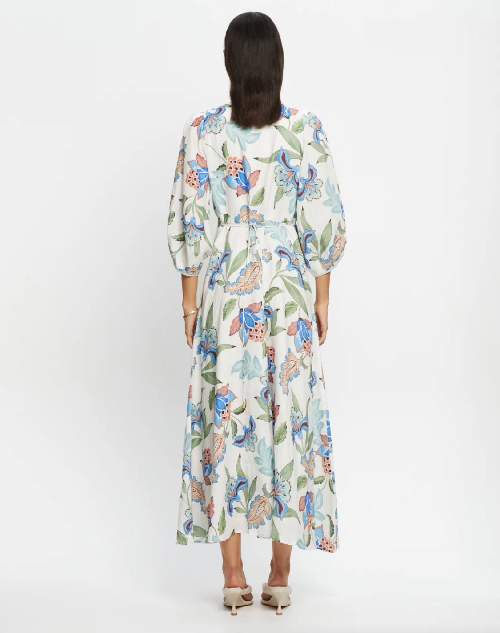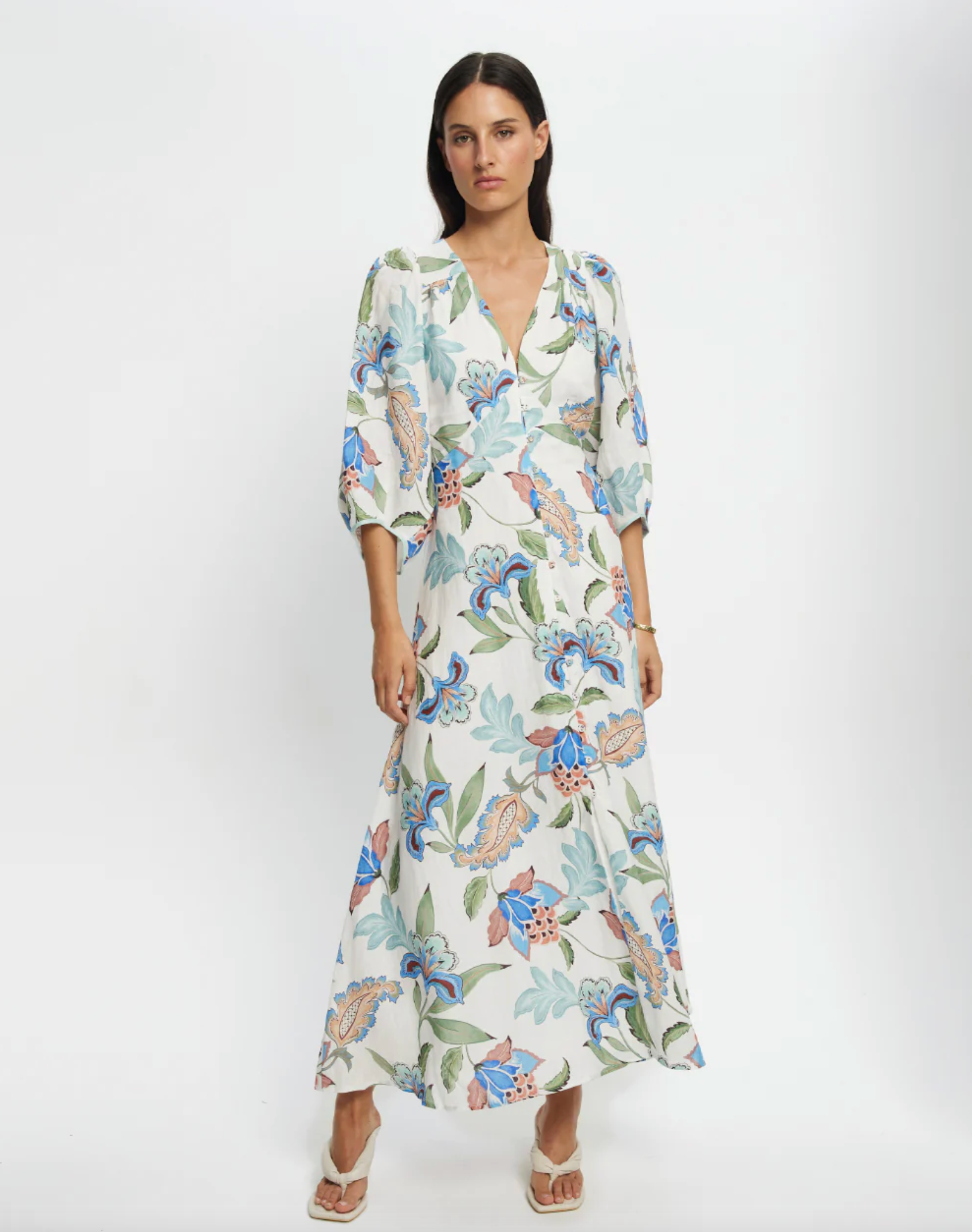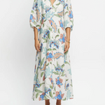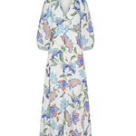 Azure is a bold floral, alive with striking blue blooms, terracotta accents and verdant green leaves on a crisp white base. The Azure Maxi Dress is defined by its feminine V-neckline, button-through front and softly flared hem. Long sleeves and contrast blue detailing complete the look, a timeless silhouette designed for both everyday ease and elevated moments.